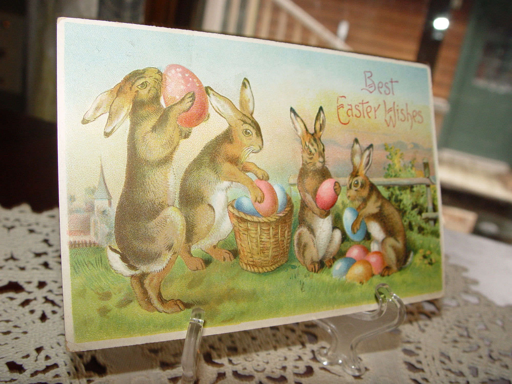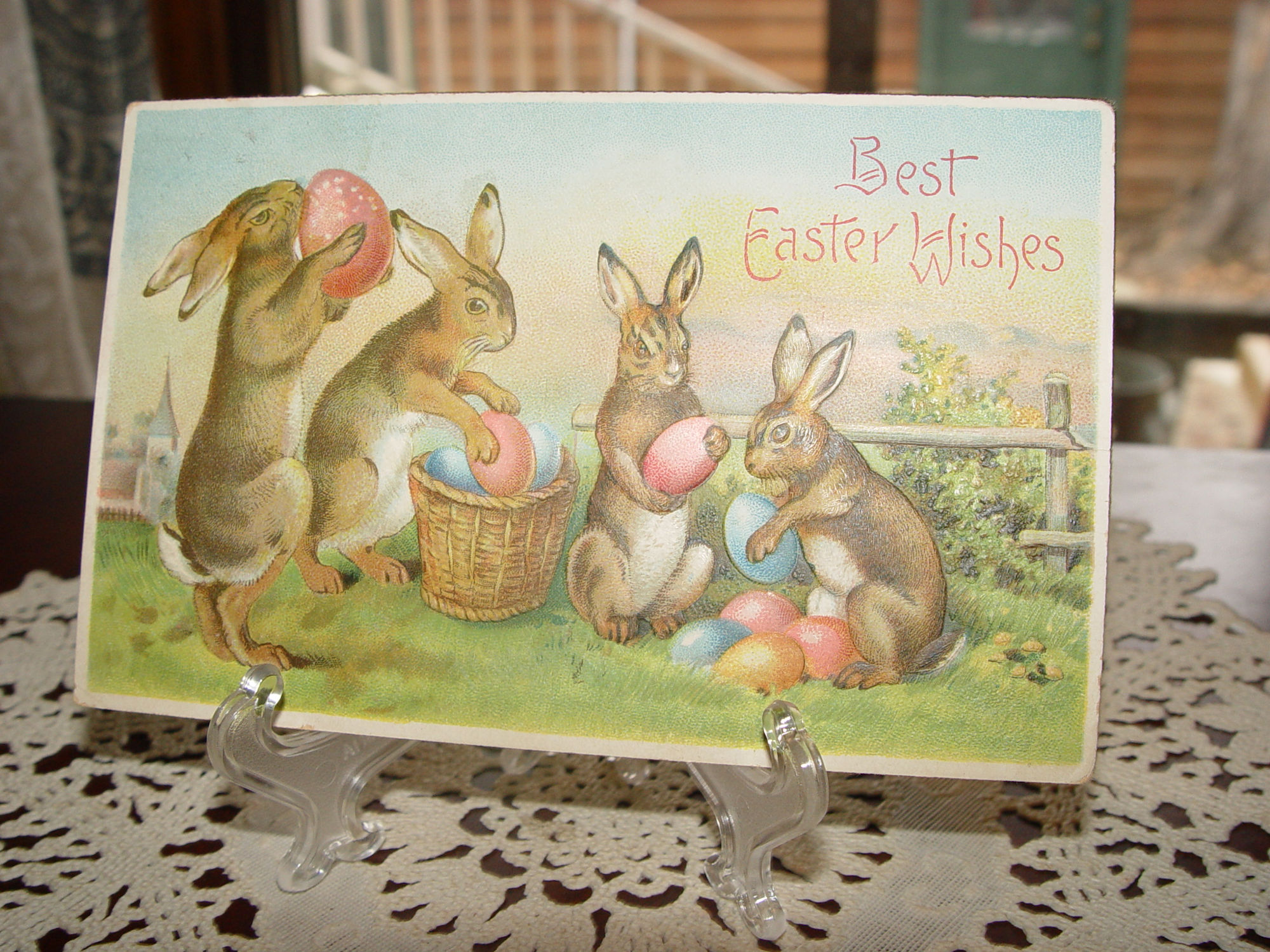 Cute antique 'Best Easter Wishes' postcard. This is a charming embossed antique German Easter postcard that show's four clever Rabbits either playing with or filling baskets with colored eggs for the Holiday. It's colors are bright and perfect for display or gift. Publisher B.W. A lovely card for your collection!.