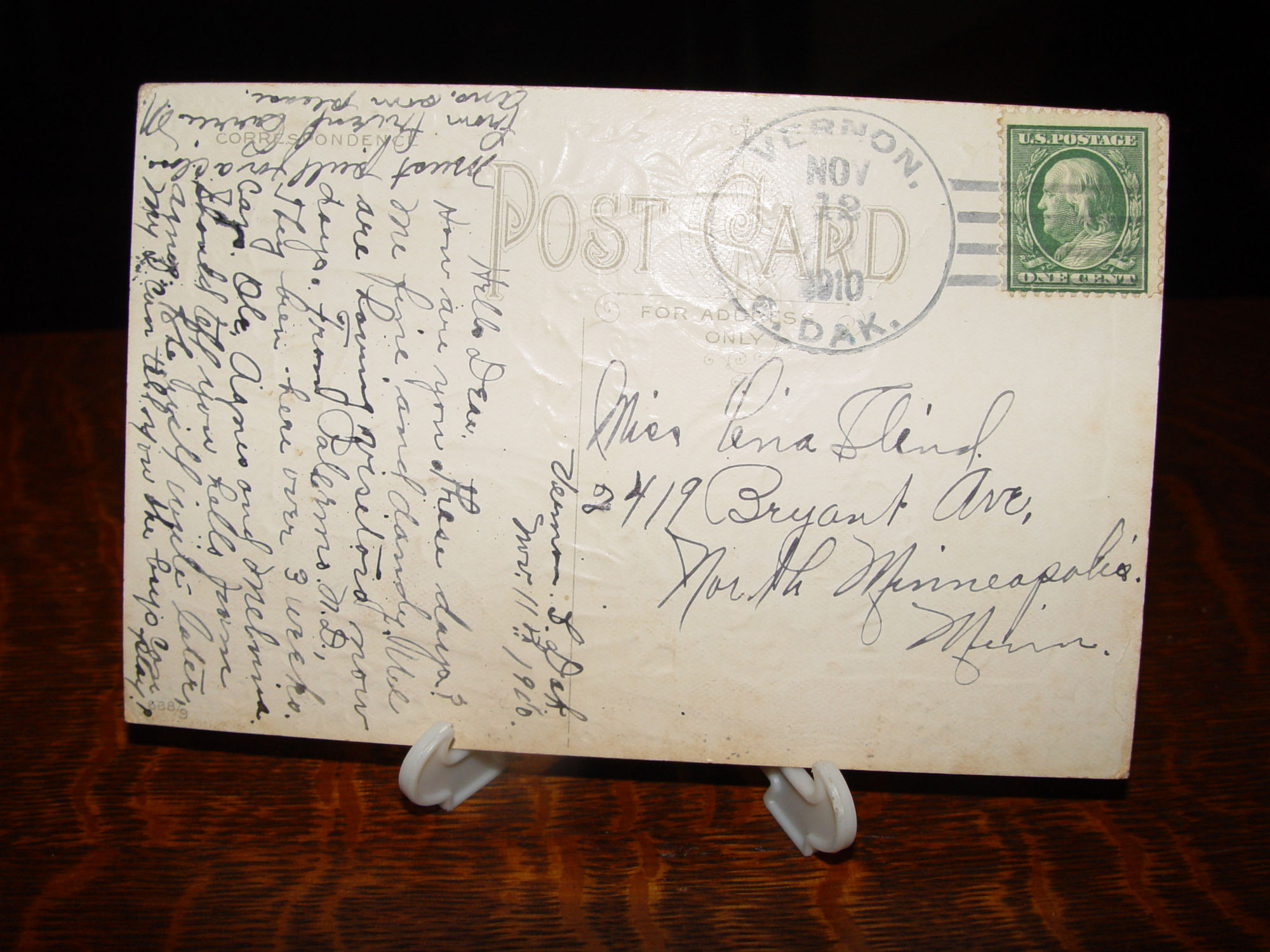 Postmarked 1910, Vernon South Dakota.