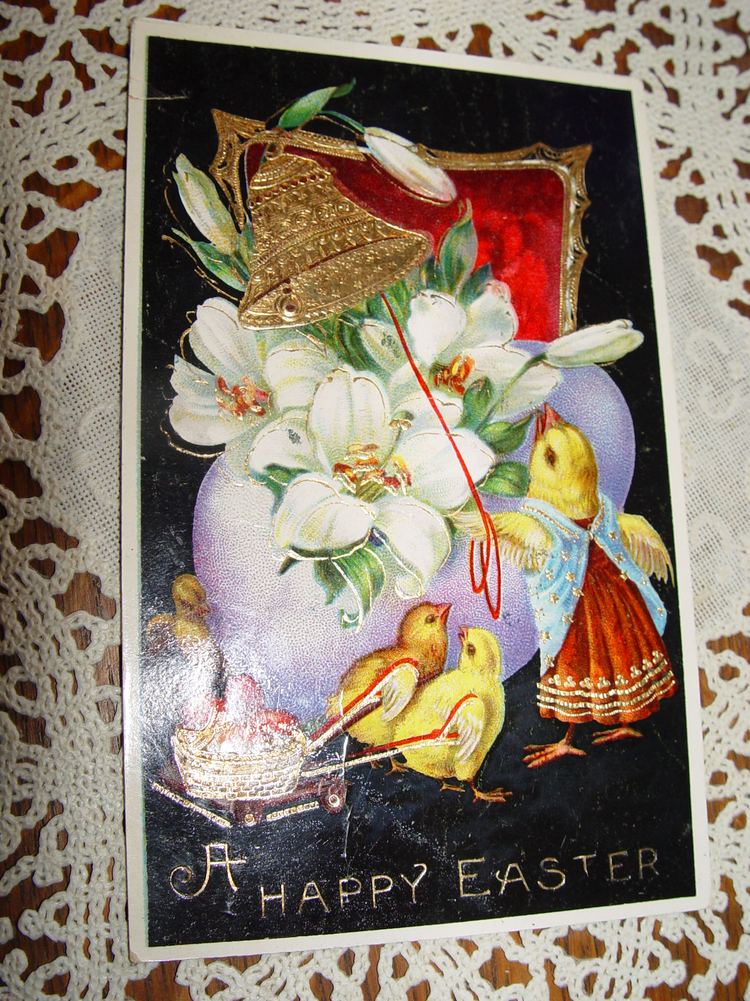 What a neat card! A very nice vintage early chromolithograph embossed postcard showing a Anthropomorphic dressed mother chicken and her chicks. She's ringing a gold gilt bell. This is a Samson Bros postcard and is in very good condition. Features white lilies in a violet egg. The little chicks are pulling a cart with red painted Easter eggs in it. Gold gilt decorated throughout. Beautiful black background.