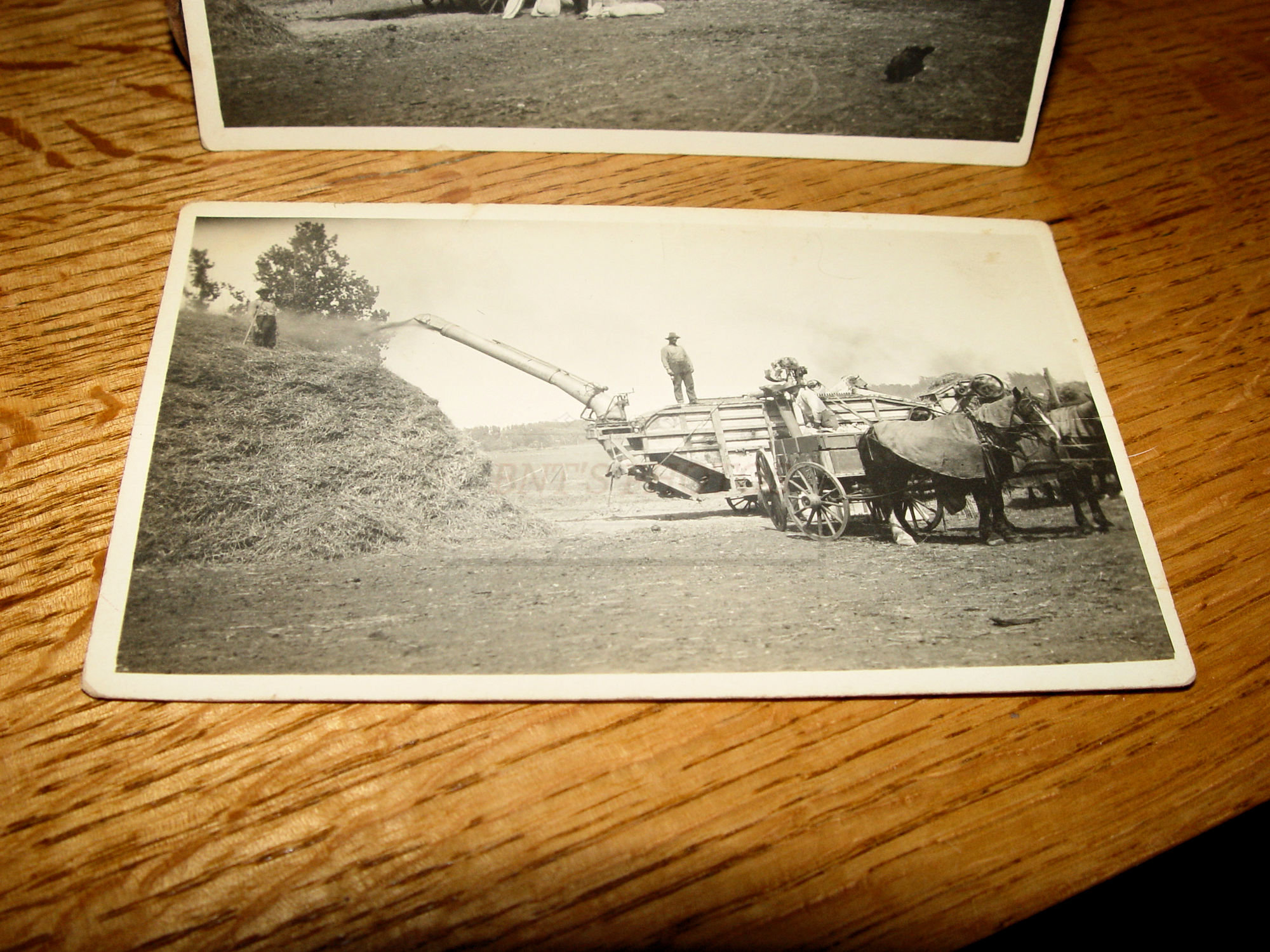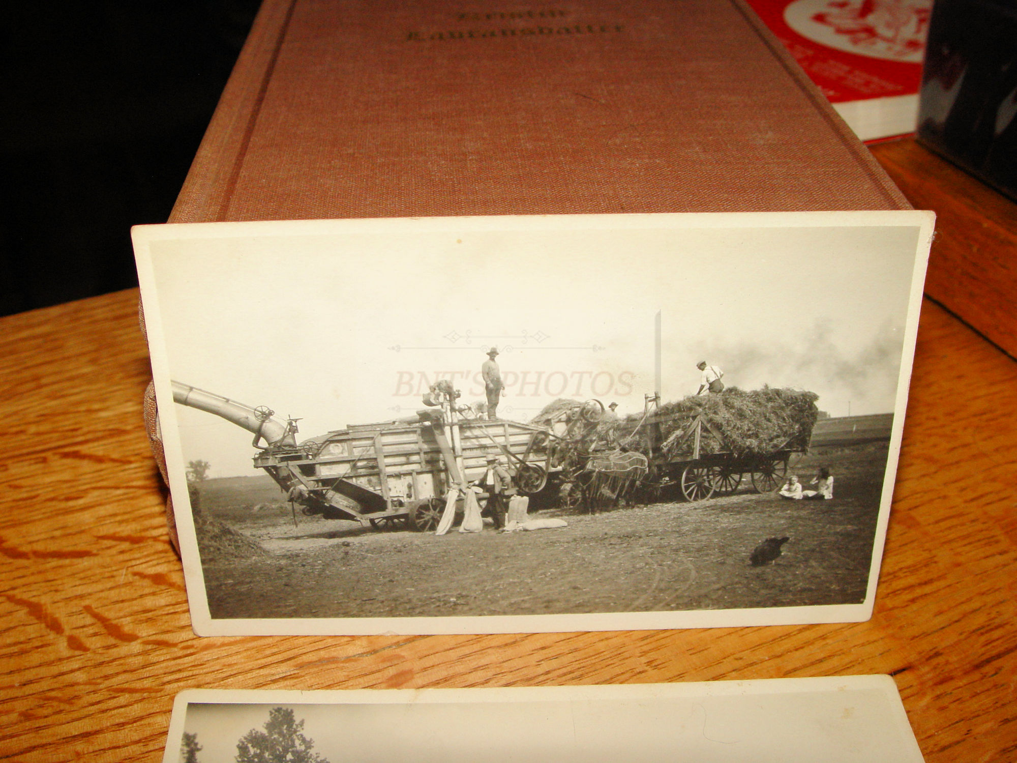 A vision of the past, early‑20th‑century threshing scene, with the family and many times the neighbors helped with the harvest season. The large machine is marked “Minneapolis” on the side so believe it to be a Minneapolis Threshing Machine Co. separator. This looks to be appox. late 1800s - 1920s. The machine is blowing the straw into a pile (note the guy on the pile in the dust, agh!) an older gent is bagging seeds? Not sure exactly what you see happening in these neat real photo postcards but I know hard work and long days when I see it. Two young girls are seated on the ground probably anxiously waiting for her family to be done and a dark chicken is in the foreground.