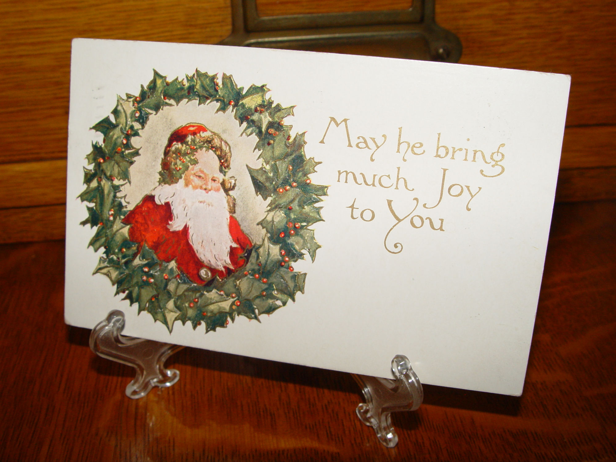 Santa in the wreath with the white background is post marked Fort Wayne, Indiana 1908. Addressed to Ida Gailey of Monroeville, Indiana. (Ida May Gailey Simons; Married to Wilbur L. Simons on Jan. 20, 1915 at Monroeville, Ind. ------- born January 1892 Ohio, died July 1926 Ramsey Cty, Minnesota.)