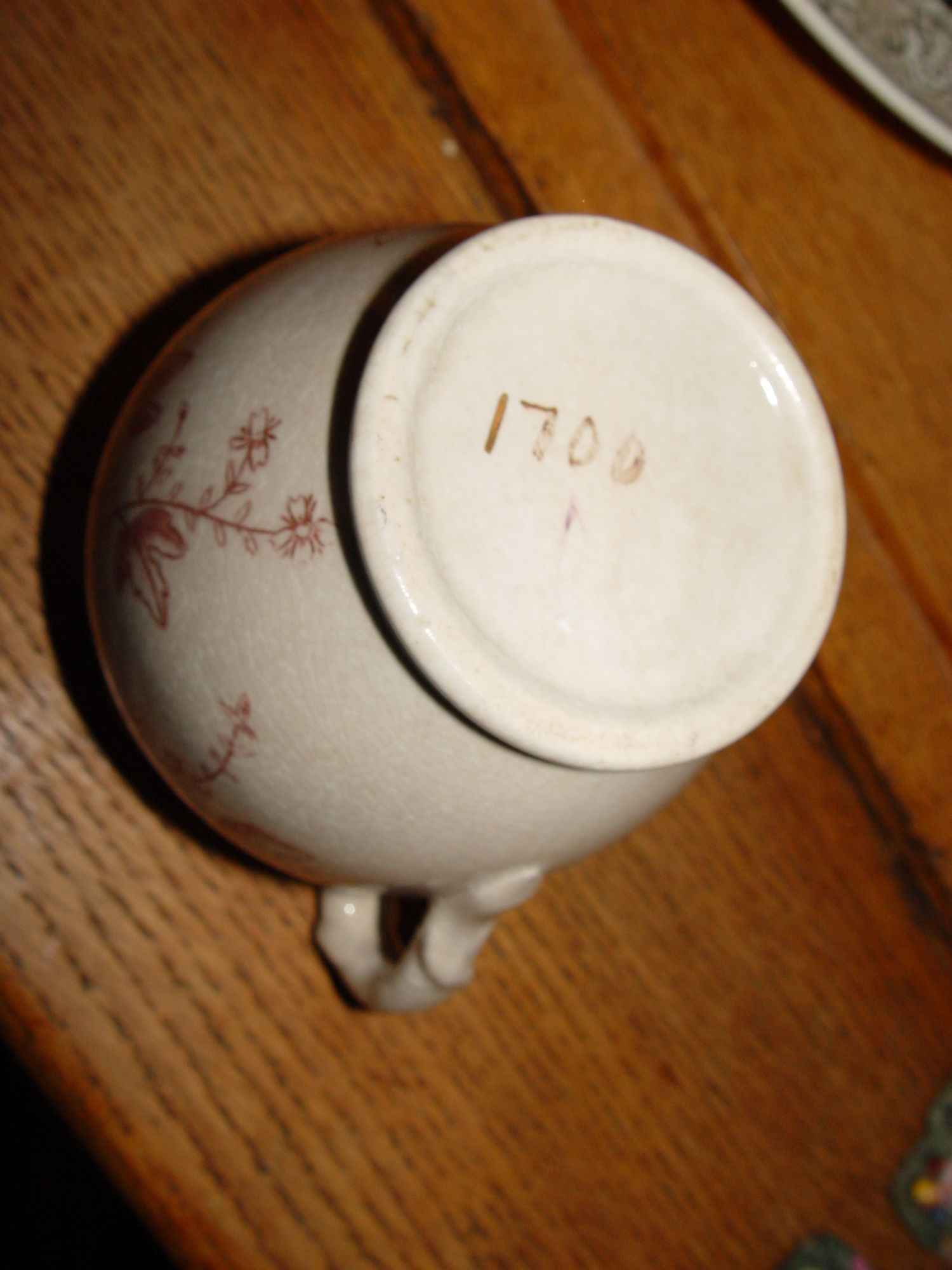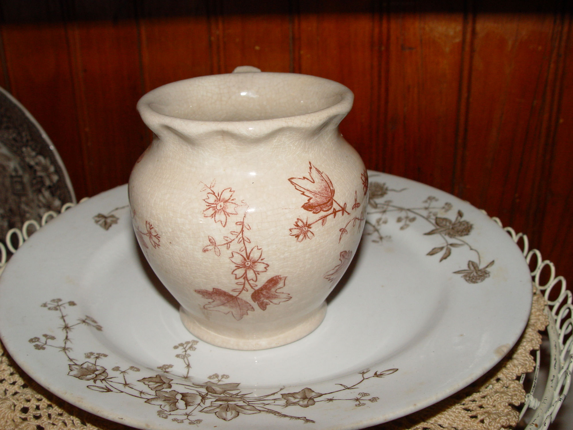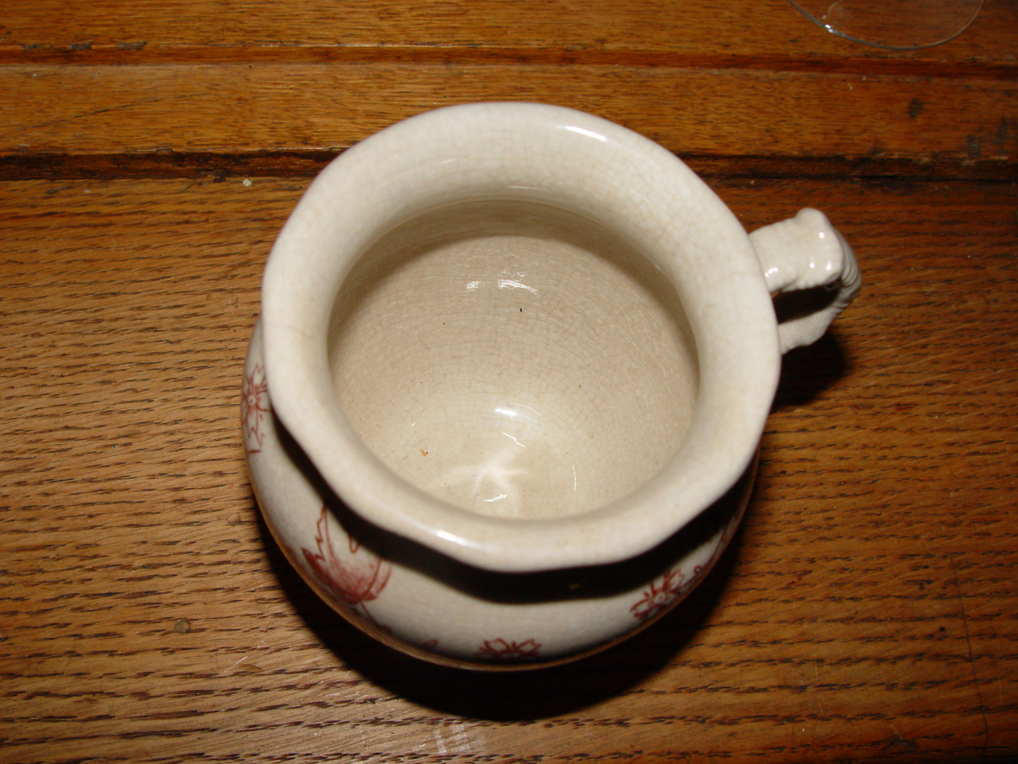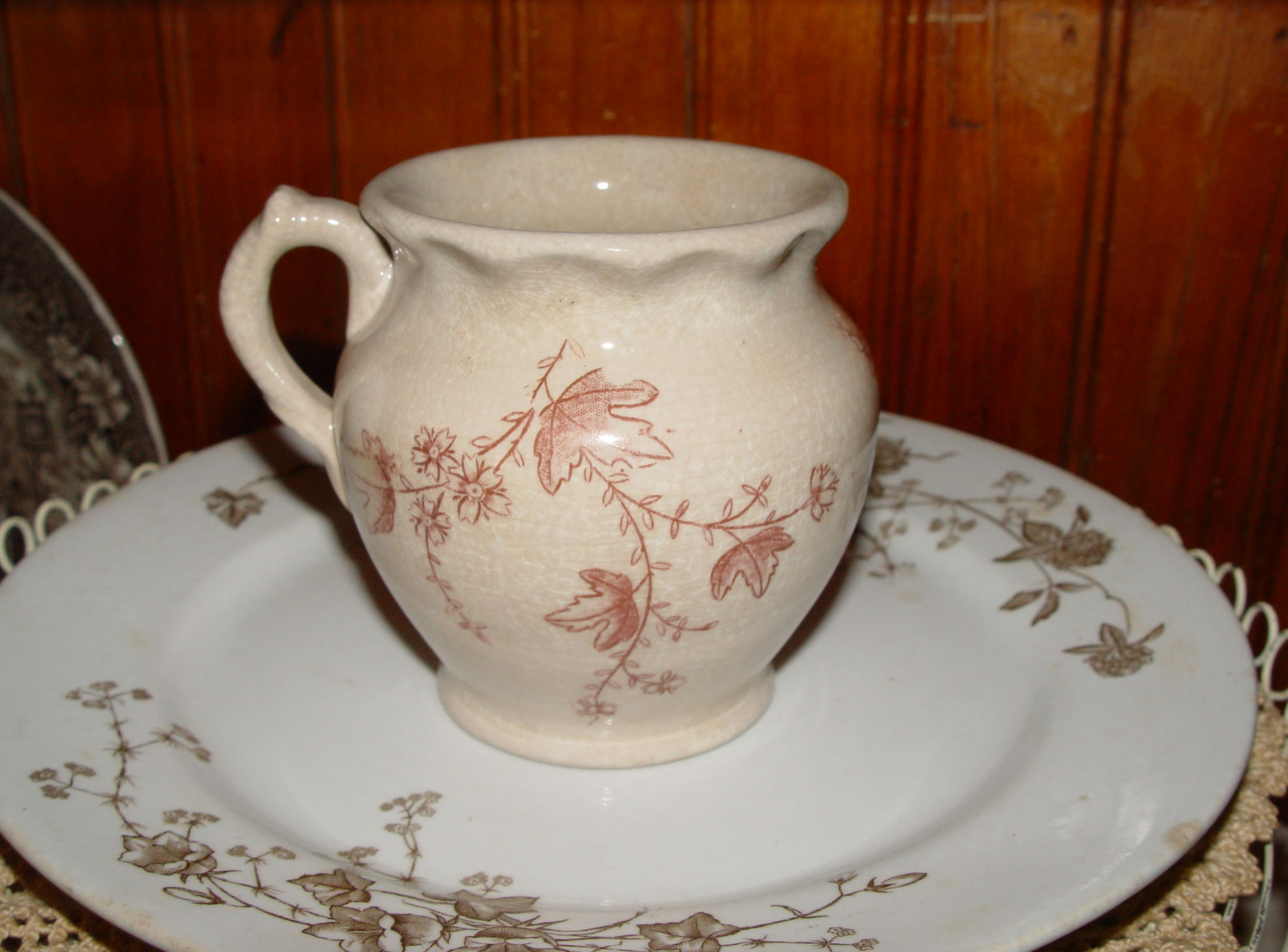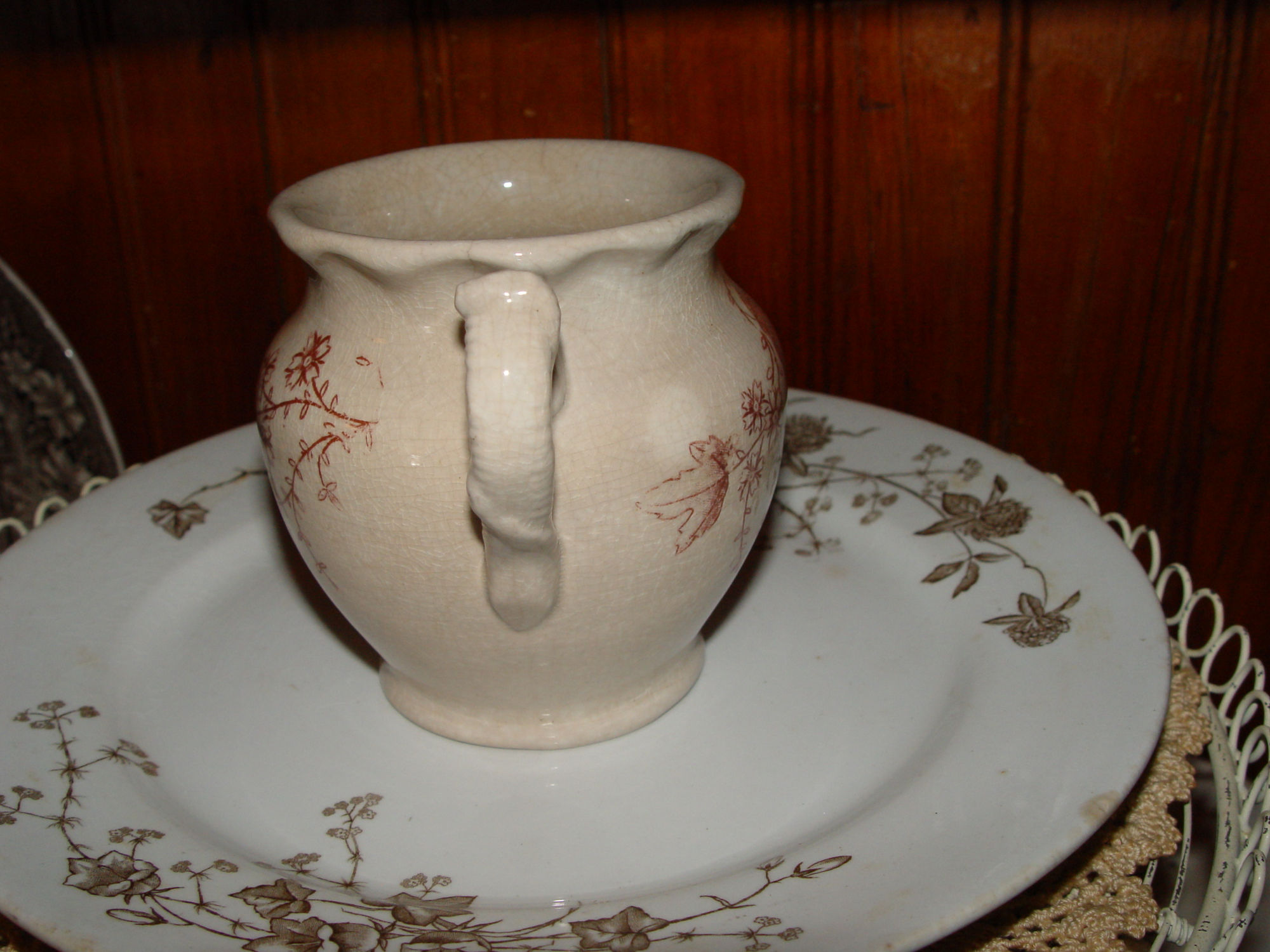 19th c. pretty red on cream transferware. Unsure of the maker. Dark red pattern features broad leaves and flowers. Showing a ruffled edge and bulbous center. The handle almost looks entwined with a branch or snake. This Victorian piece is either a shaving mug or perhaps what they called a Hall-boy mug. In it's day it may have been part of a set.