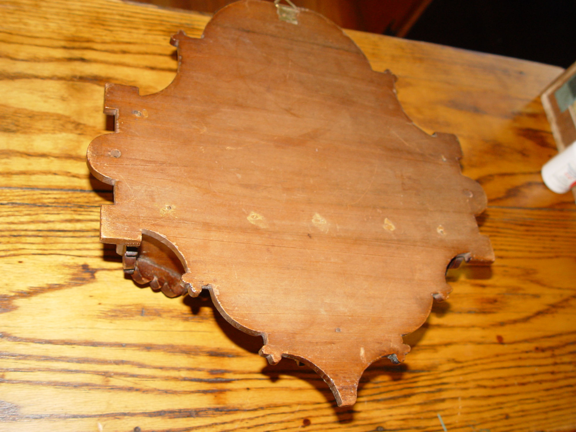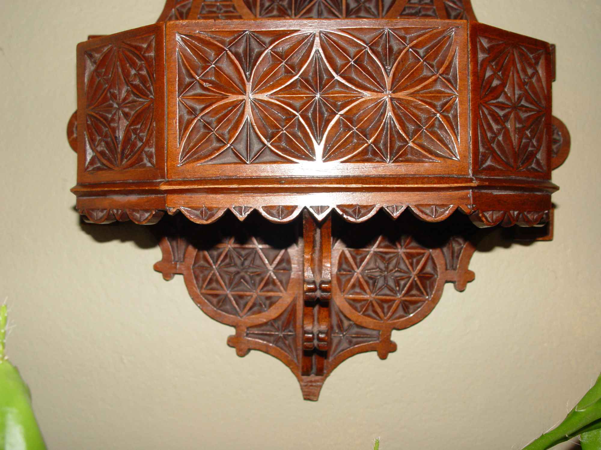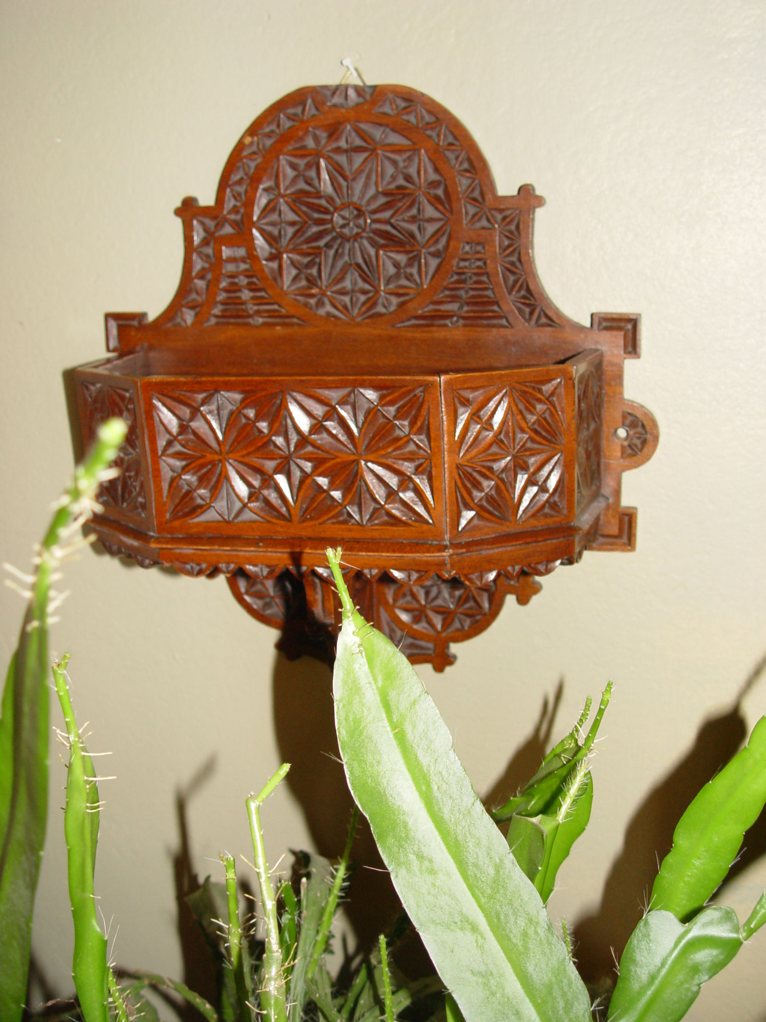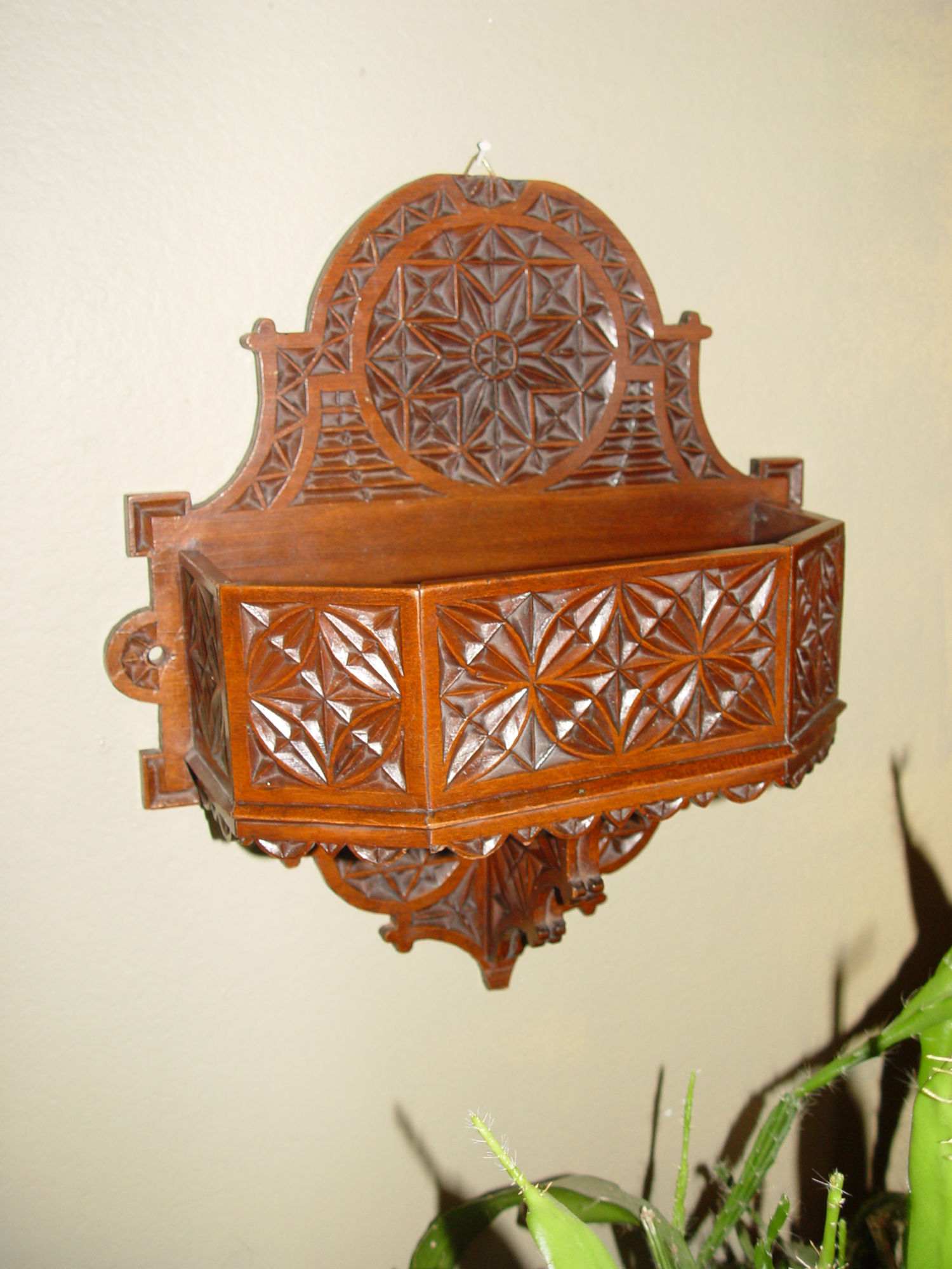 Lovely hand carved solid wood wall candle box with typical chip carved patterns in a folk art design. Believed to be Danish. Guessing the box dates from the early 20th century. 20s - 40s. The open deep center is perfect to hold your candles, wooden spoons and whatnot. This is in very good condition with a newer hanger put on it long before we acquired it.