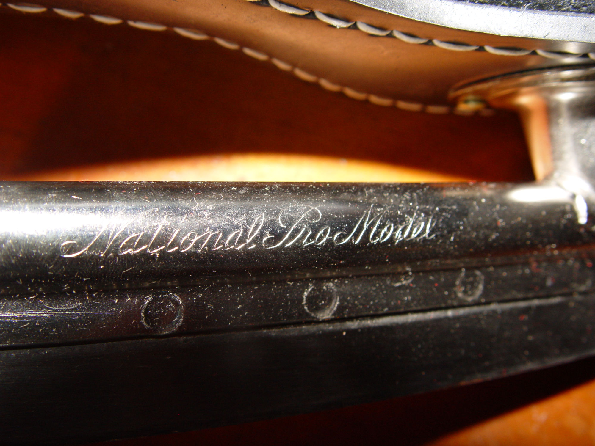 National Pro Model is in script along the blade. It shows a size of 8 2/3, which I'm assuming is the length of the blade. There is information on the tongue, underneath and on the box to help with information.