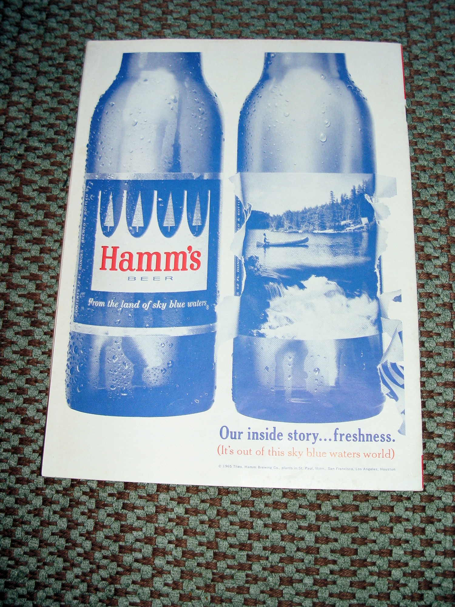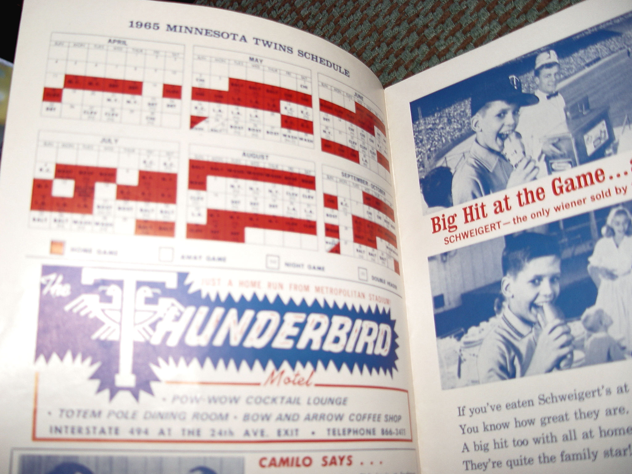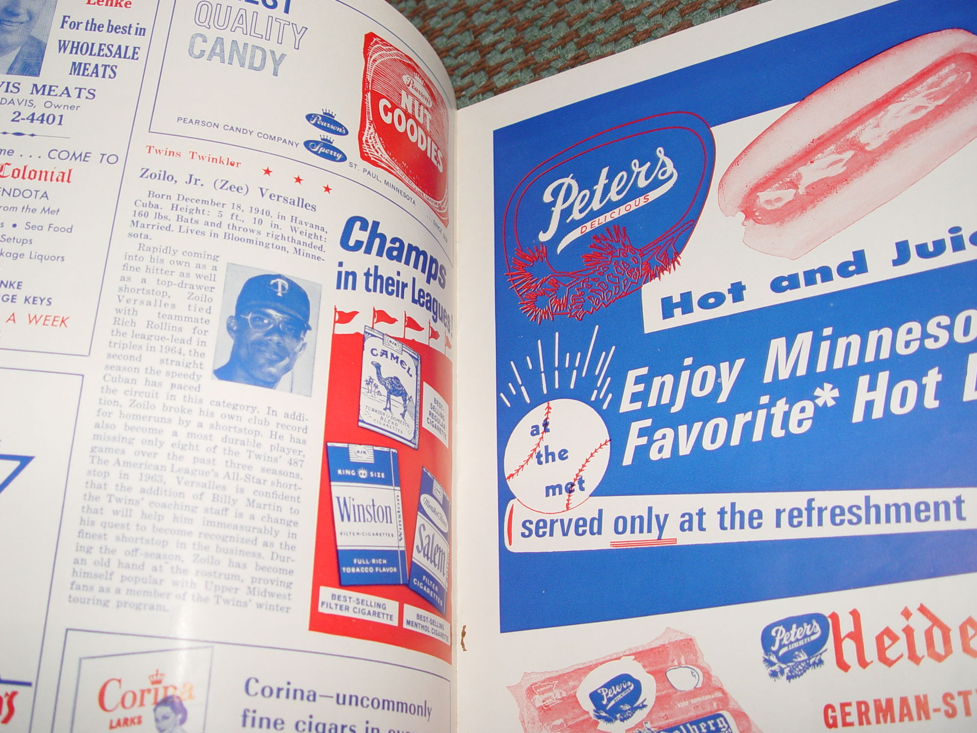 This is a clean and bright original official program and scorecard for the1965 Minnesota Twins vs. Cleveland Indians game. This has the coolest ads! Lots of great Beer companies...Hamm's Beer, Grain Belt, Gluek, Schmidt Beer and Bubble Up Soda Pop, Muriel Cigars, Schweigert and Heidelberg German Hotdogs and so many more.. A real blast from the past.