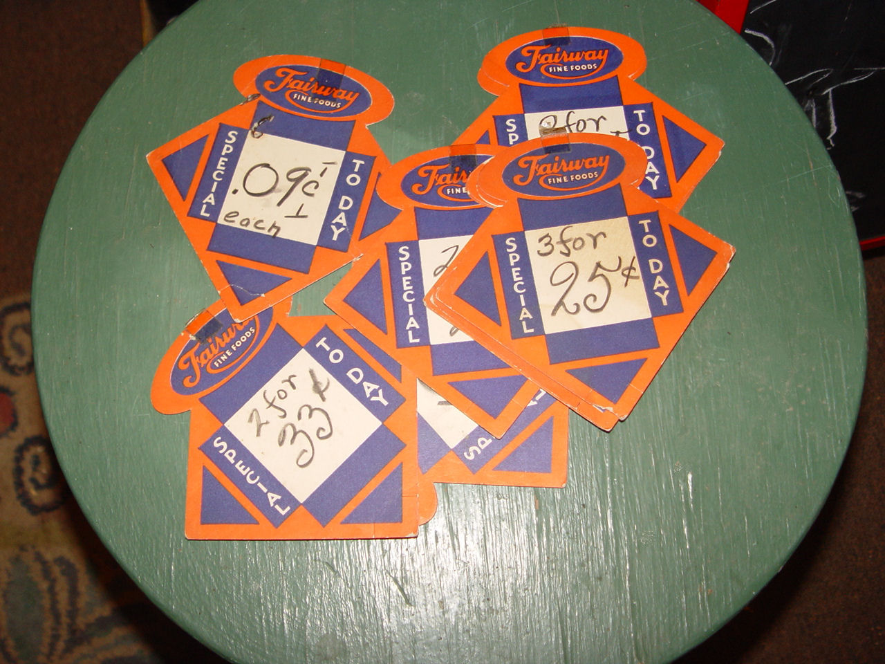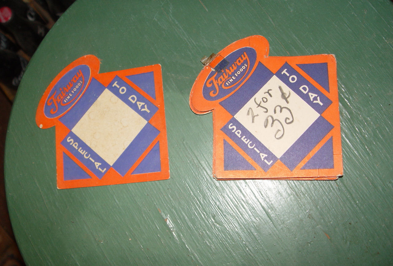 Great find and collectible. Believed to be from around the 1920's or 30's. Two different kinds, these very cool Fairway Food Store Price Tags are NOS (new old stock) or used.
