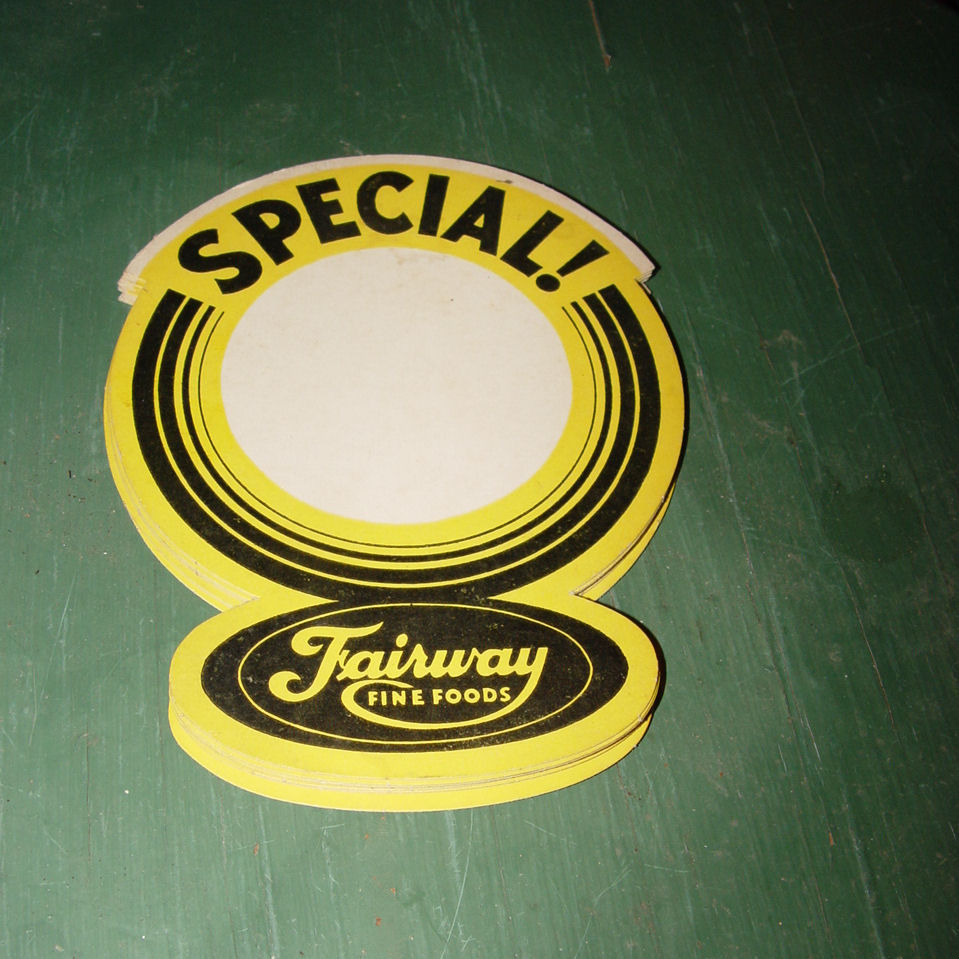 We have an orange, red and blue with white lettering style (6"H x 6"W), and black and yellow in color for the other set (Approx. measurements 6"H x 5"W). They were the kind of price announcement that stood in a metal small clip.The lettering SPECIAL is on one side and TO DAY on the other. Fairway Fine Foods.