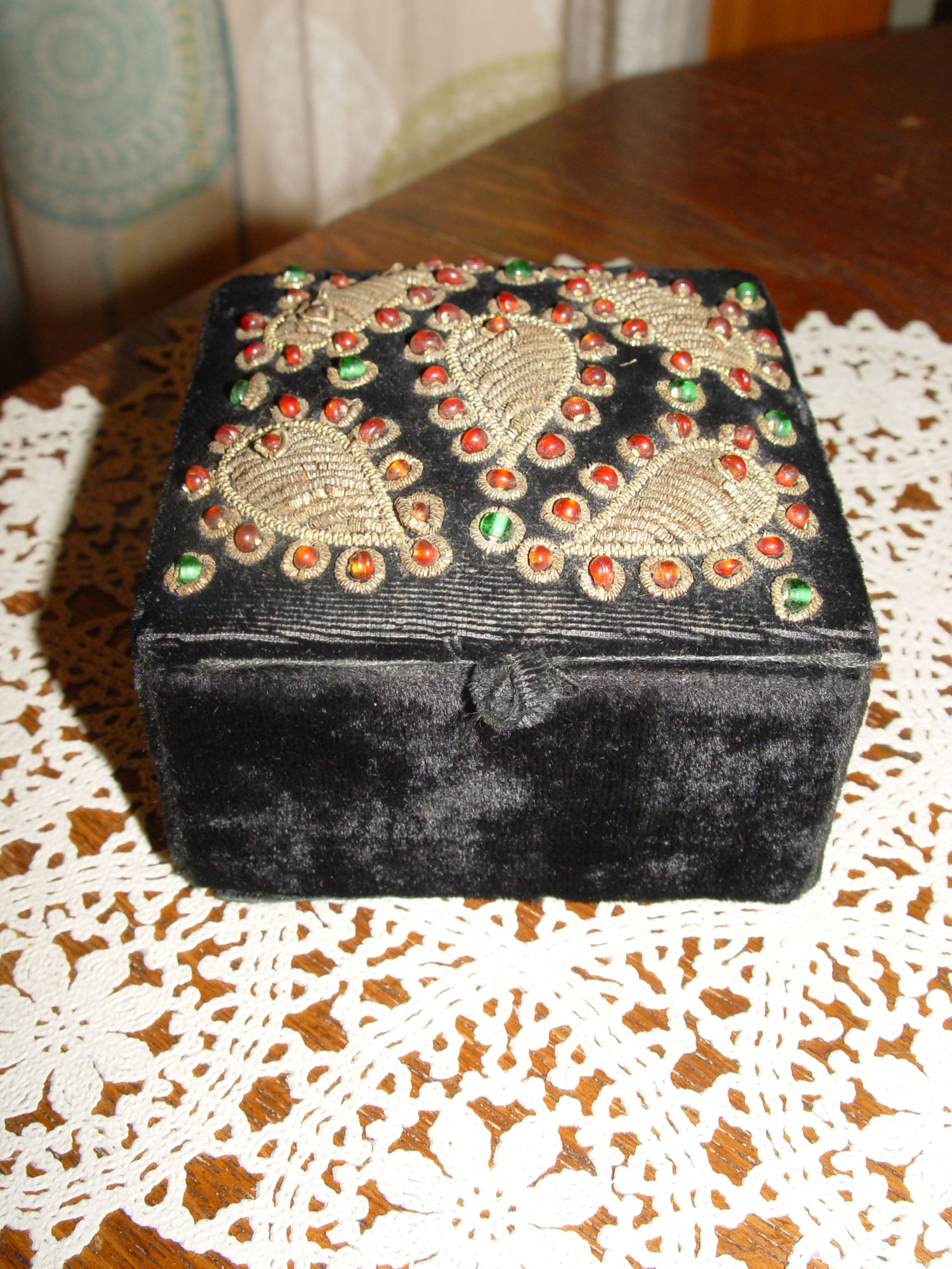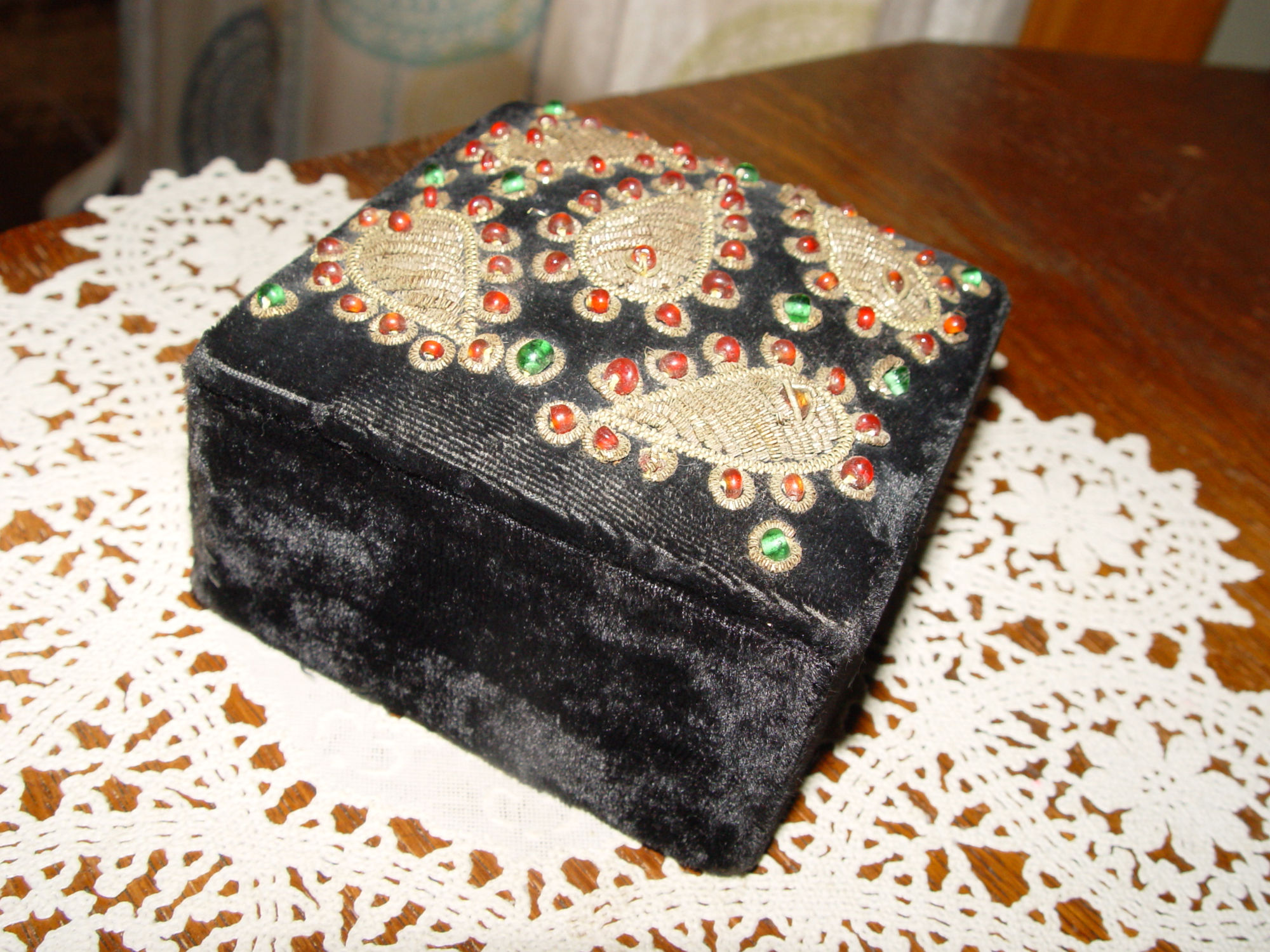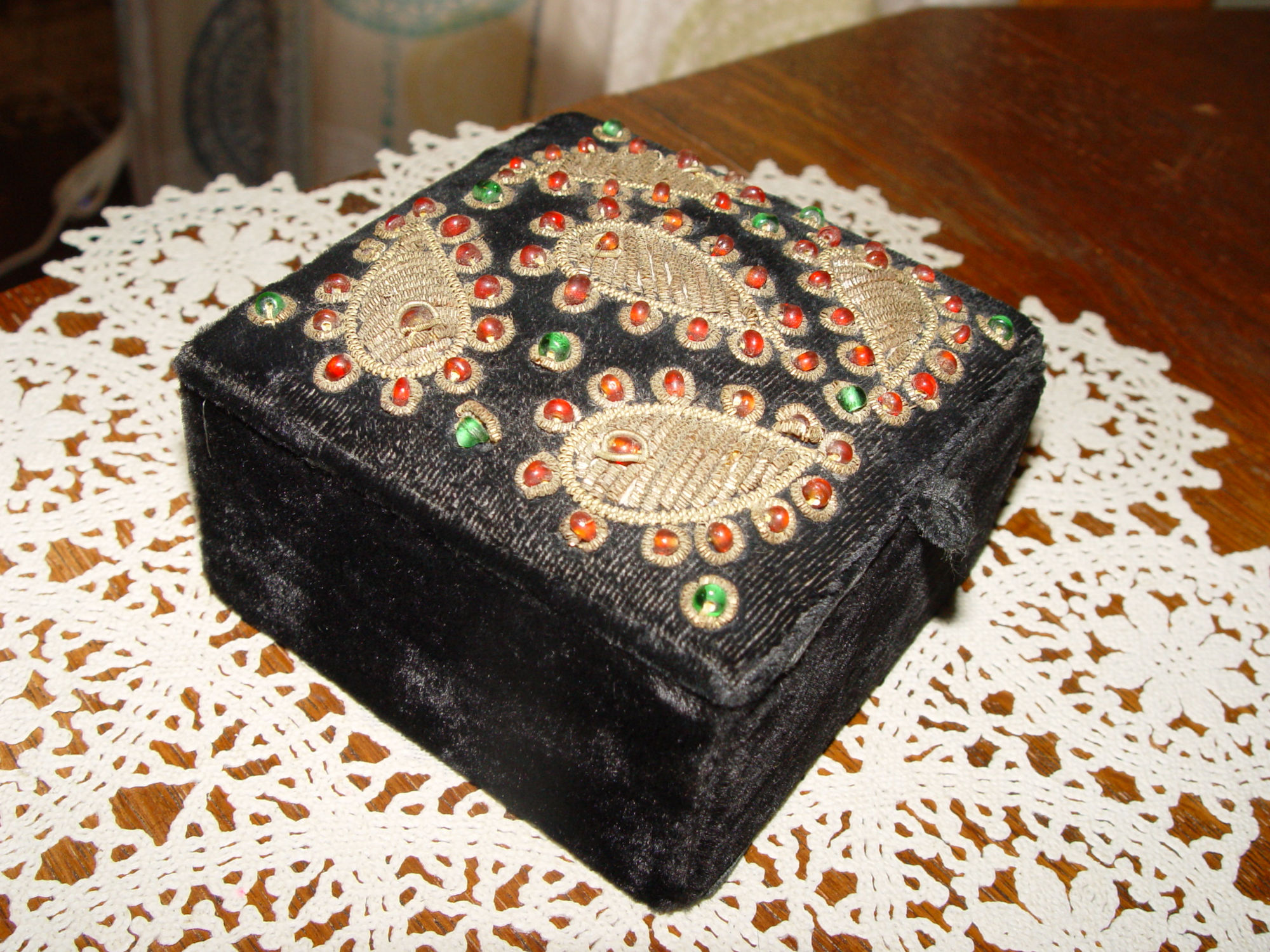 Vintage Zardozi (metal bound threads or beaded thread) jewelry or keepsake trinket box. Luxurious leaf patterned design with red and green glass jewels or larger beads. This box shows 'in India' on the tag inside. At first look, I thought this may be an Iroquois beaded piece as was many items we purchased in the same estate. But it has the appearance of early zardozi artisans work on velvet.
