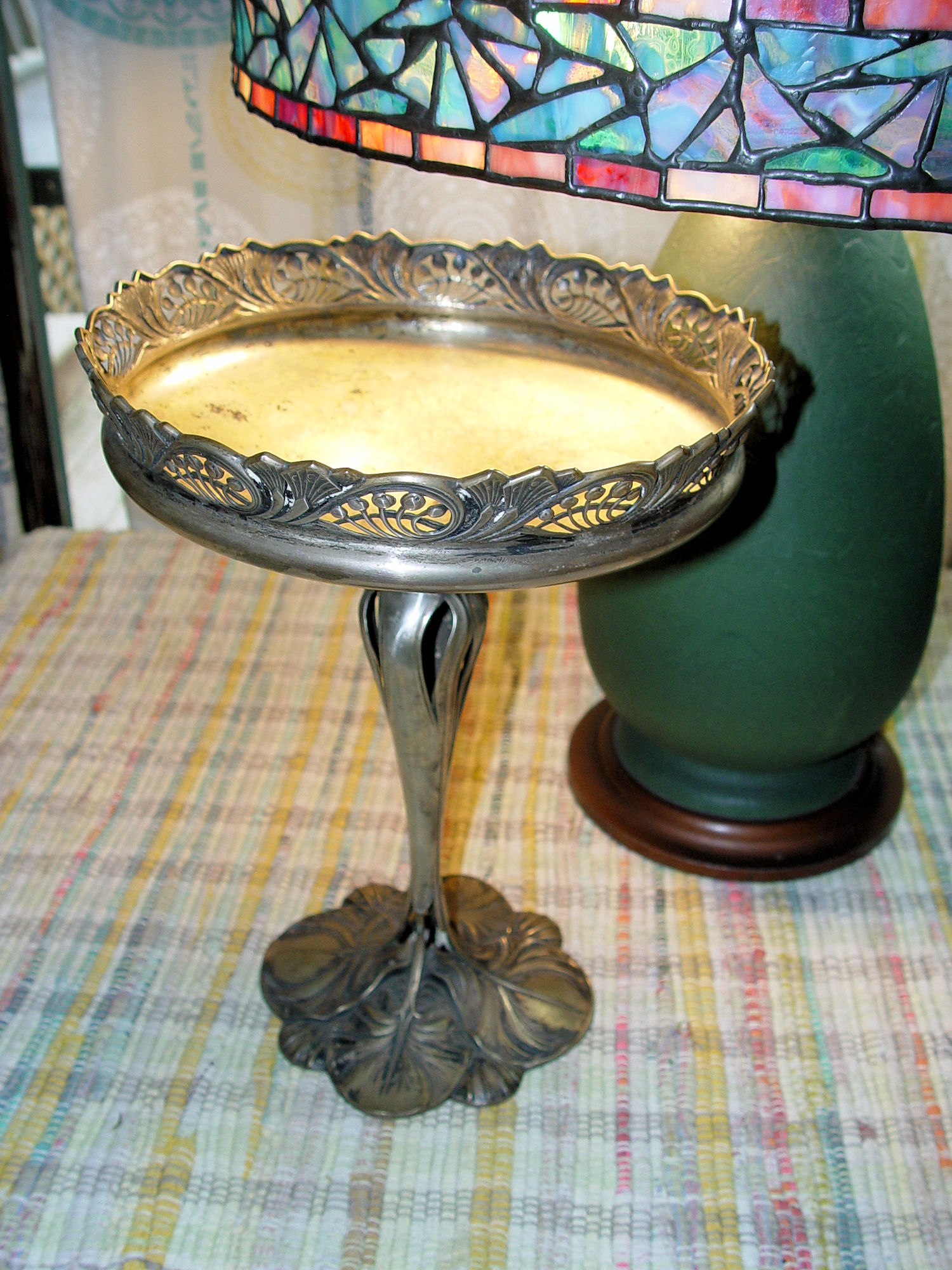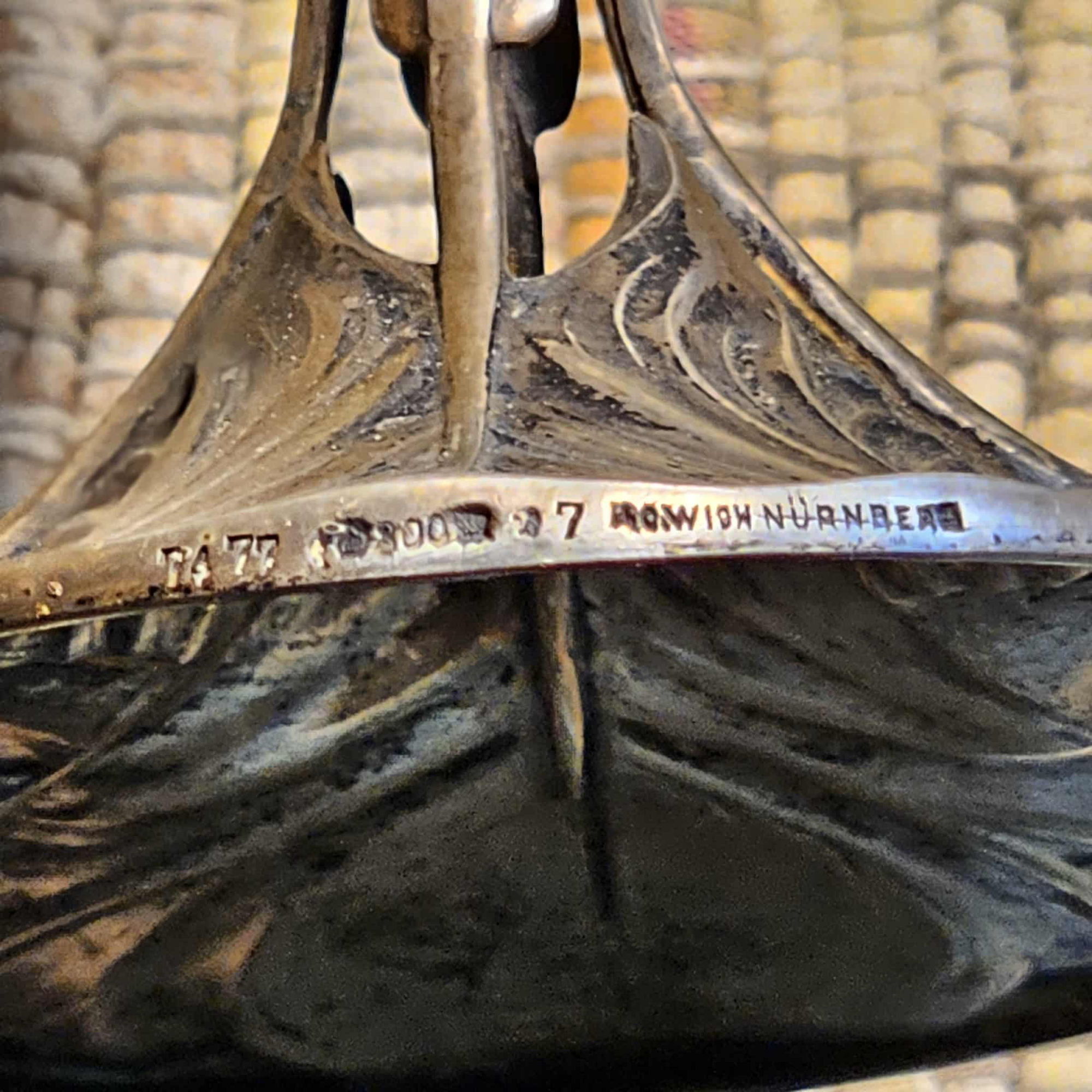 A wonderful and very early organic German hallmarked compote with lovely art nouveau designed patterns and slender pedestal stand. I believe this to be from the Secessionist period. Nuremberg silver has a rich history of silversmith's dating back centuries, often with detailed craftsmanship. This particular piece features a scalloped edge with pierced rim and engraved detailing around a shallow dish, and a stunning leaf relief base. Beautiful flowing organic design. The piece dates from the late 19th century to the early 20th. Popular decorative centerpieces or to sit on a sideboard. I'm sure this was made for serving nuts, candies, fruits or ornamental items. 800 silver & maker's hallmarks along the bases edge. See last photo.