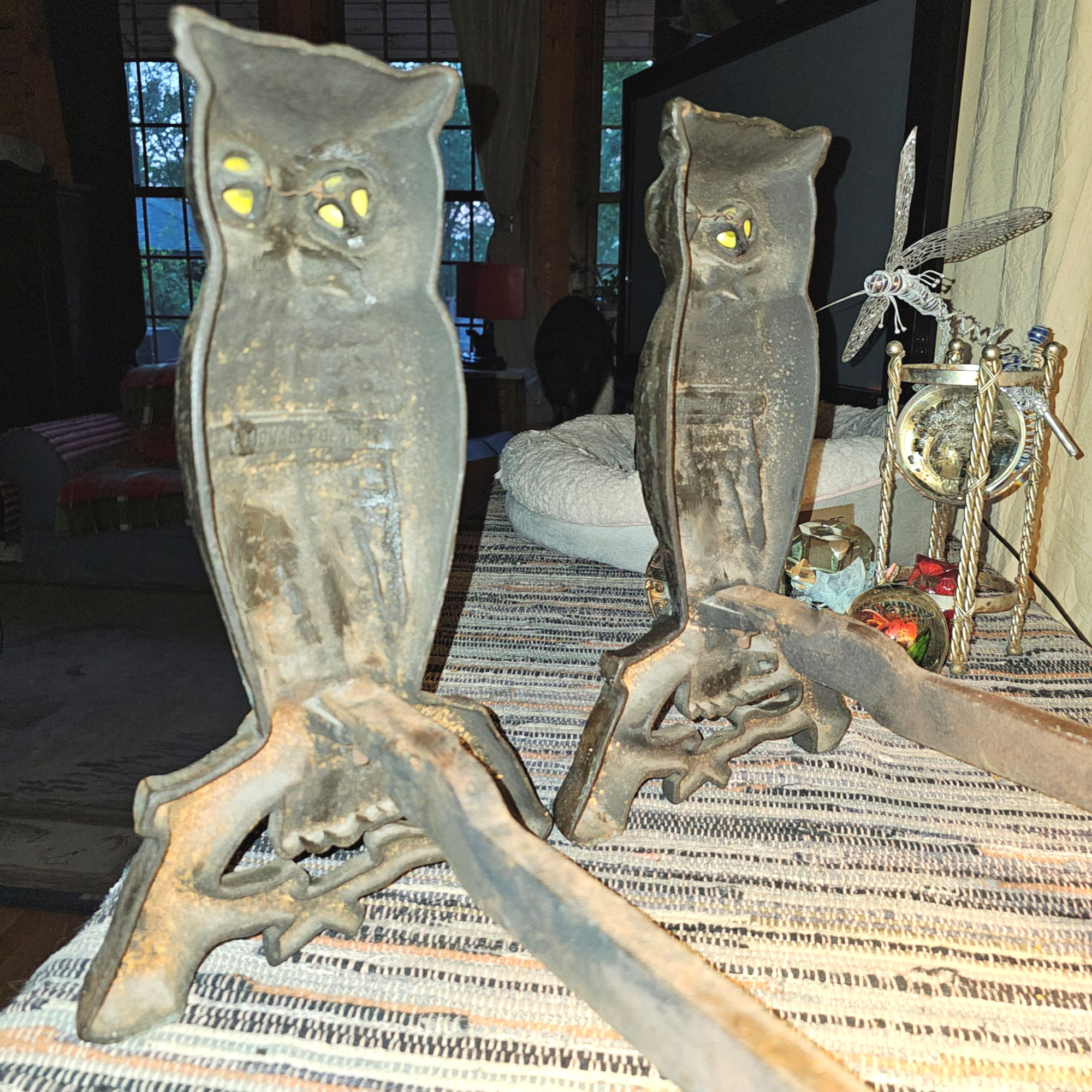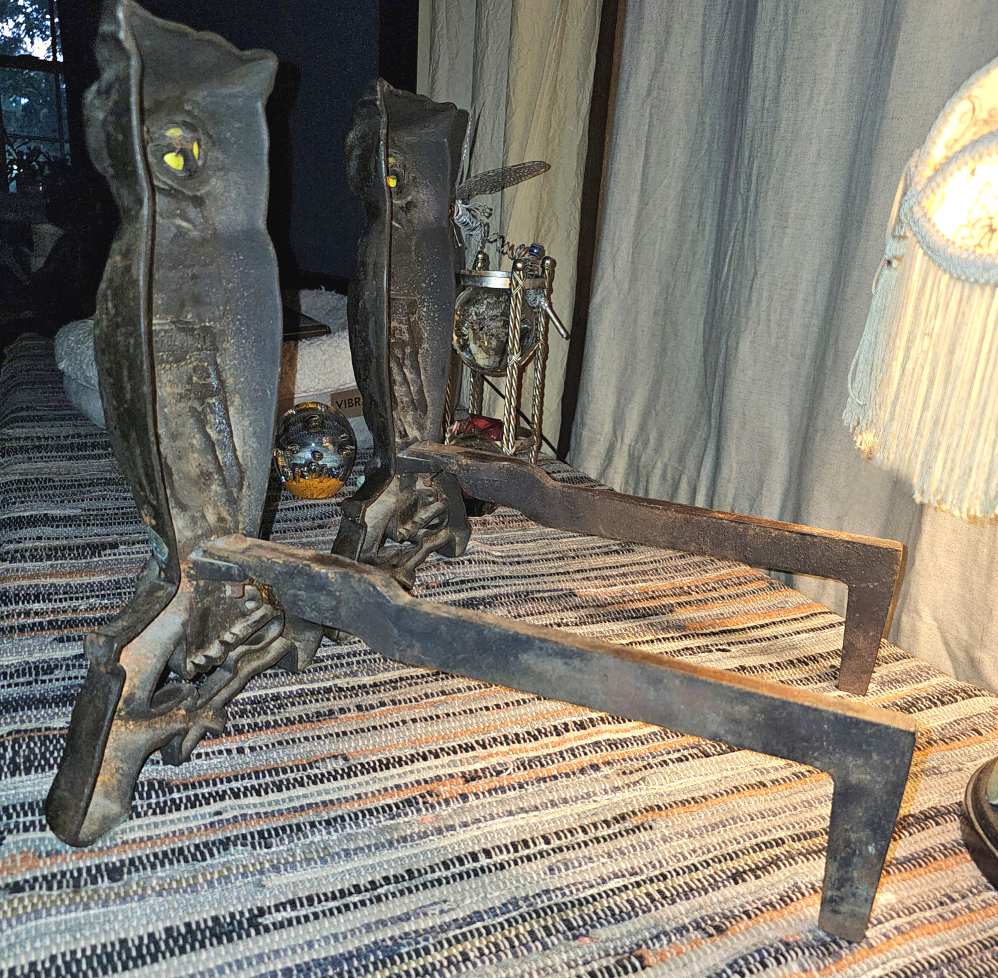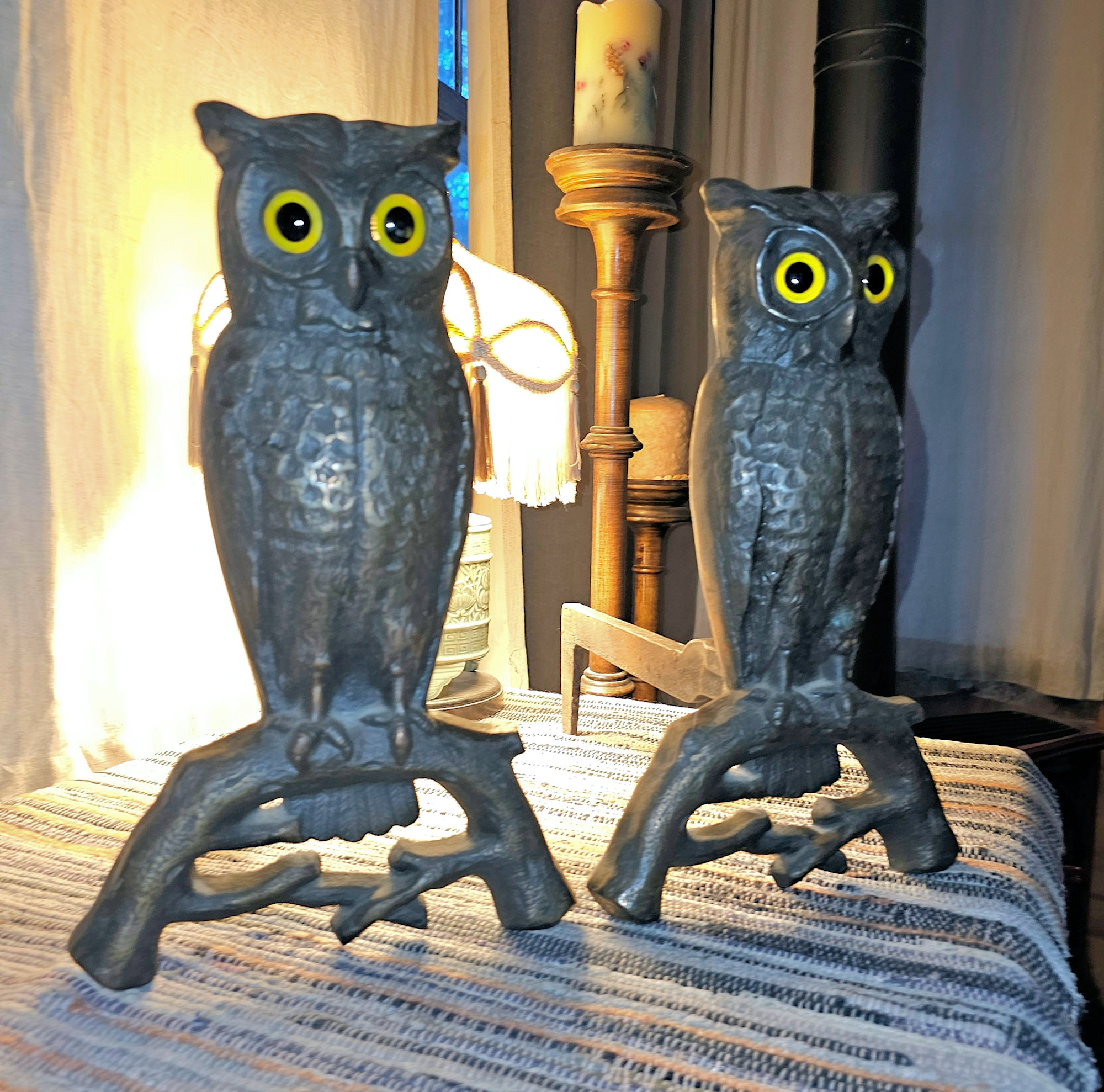 Cast Iron Andirons Glass Amber Eyes c. 1900 (Halloween)