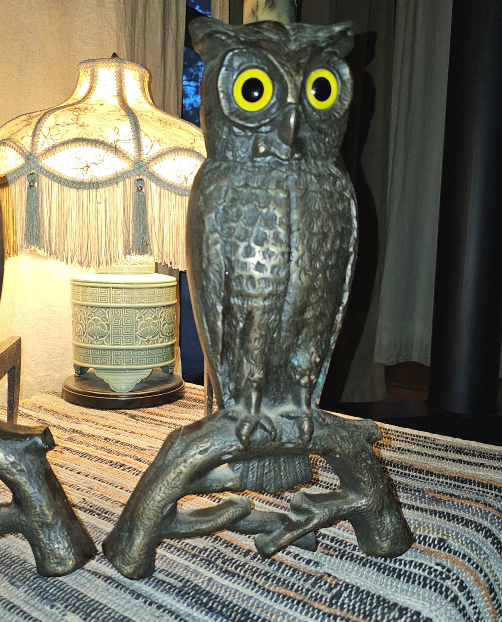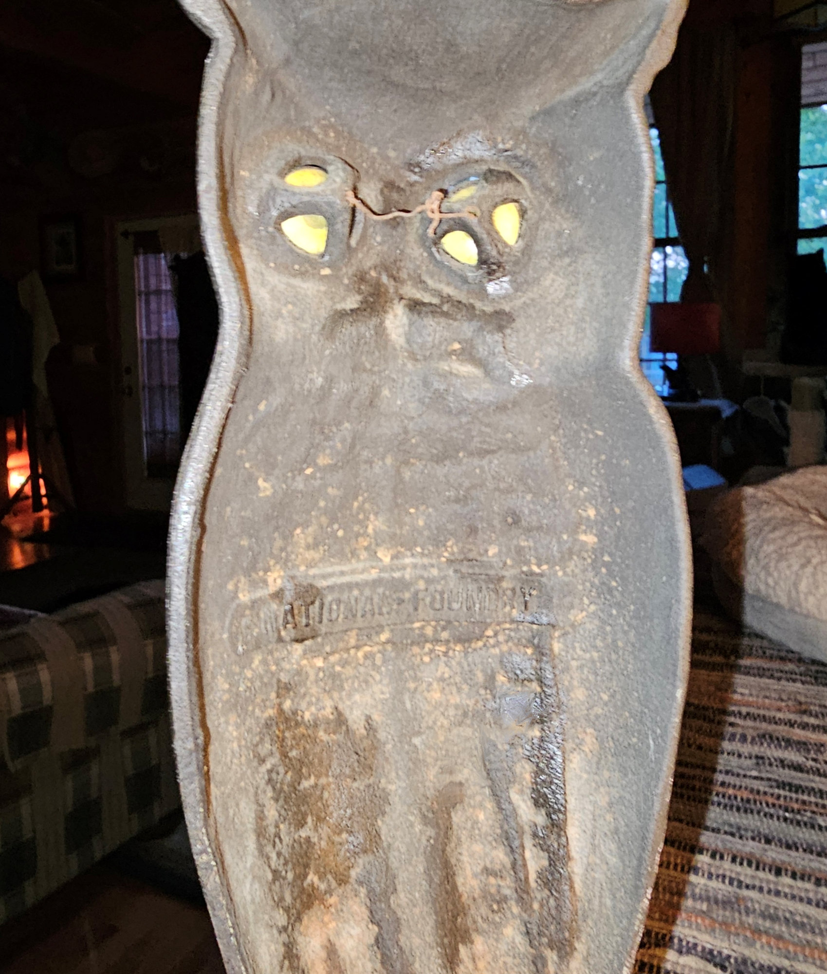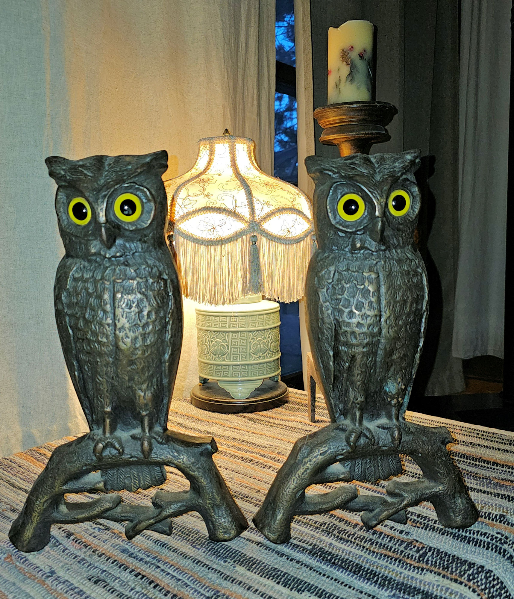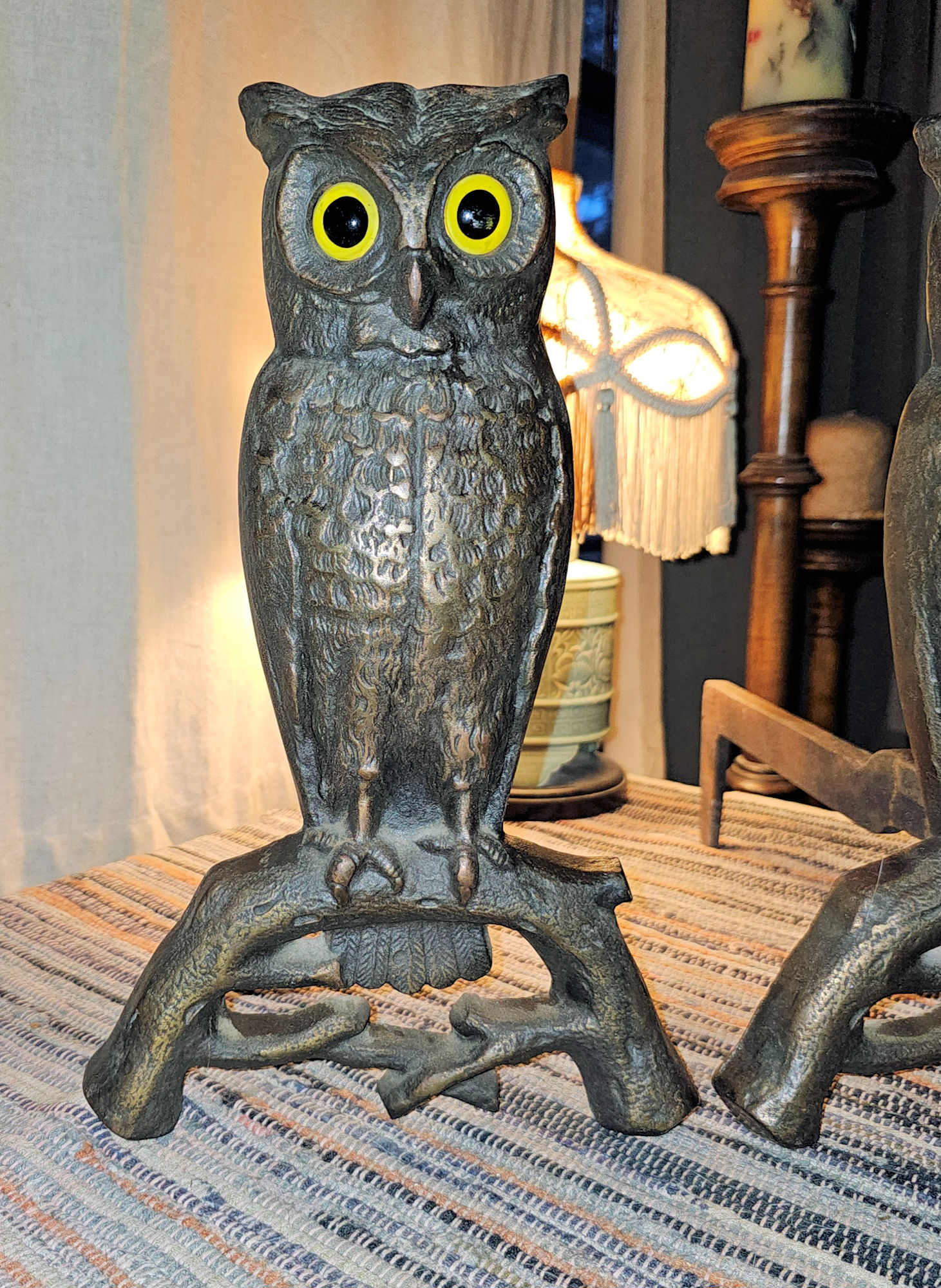 Cast Iron Andirons Glass Amber Eyes c. 1900 (Halloween)
