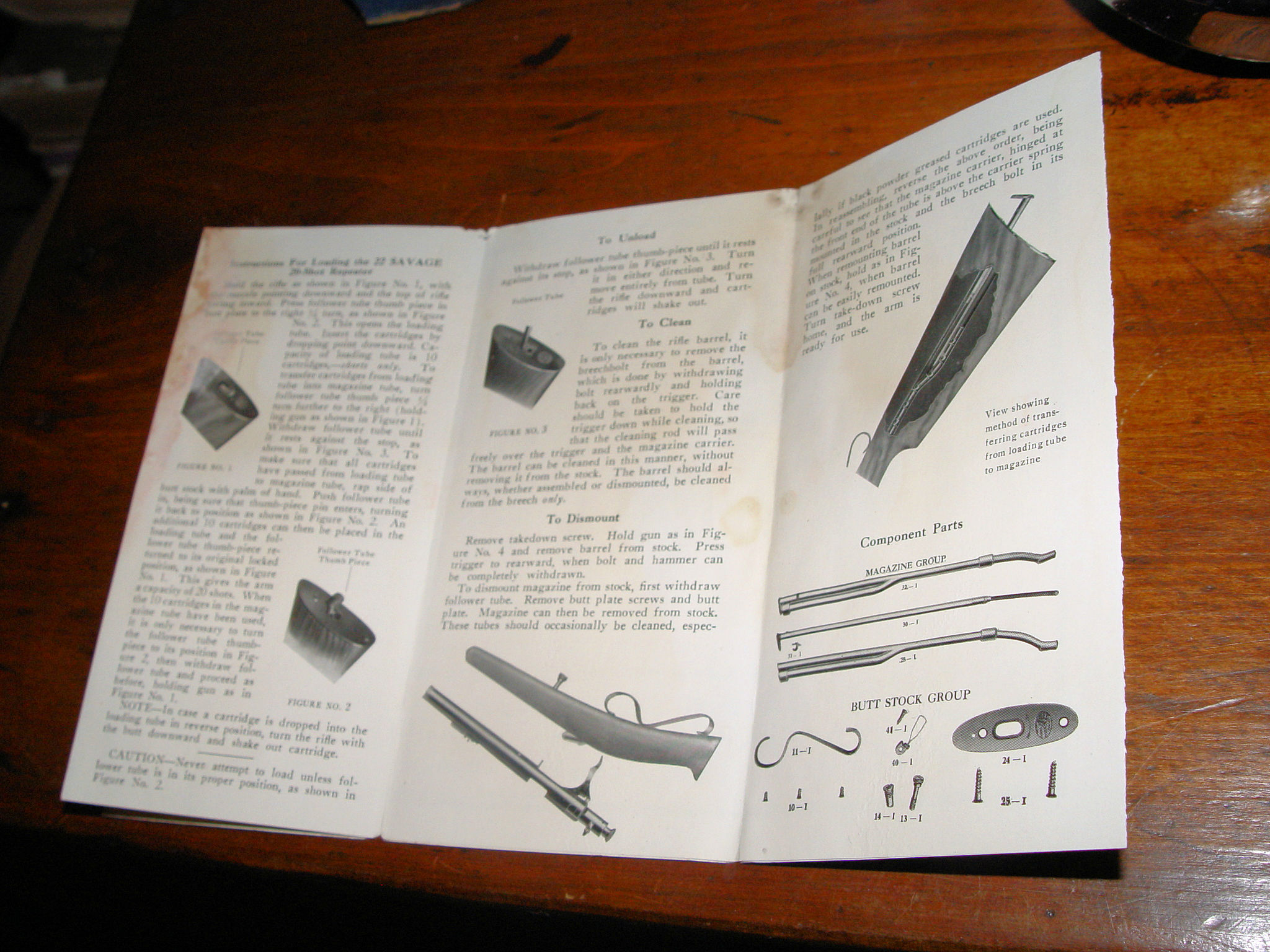 This shows the exterior of the 22 Caliber Savage 20 Shot Repeater on one side and a Phantom view of the gun on the other. Original item. Measures approx. 19" folded out by 6" high. When folded up it is 6" by 3.25"