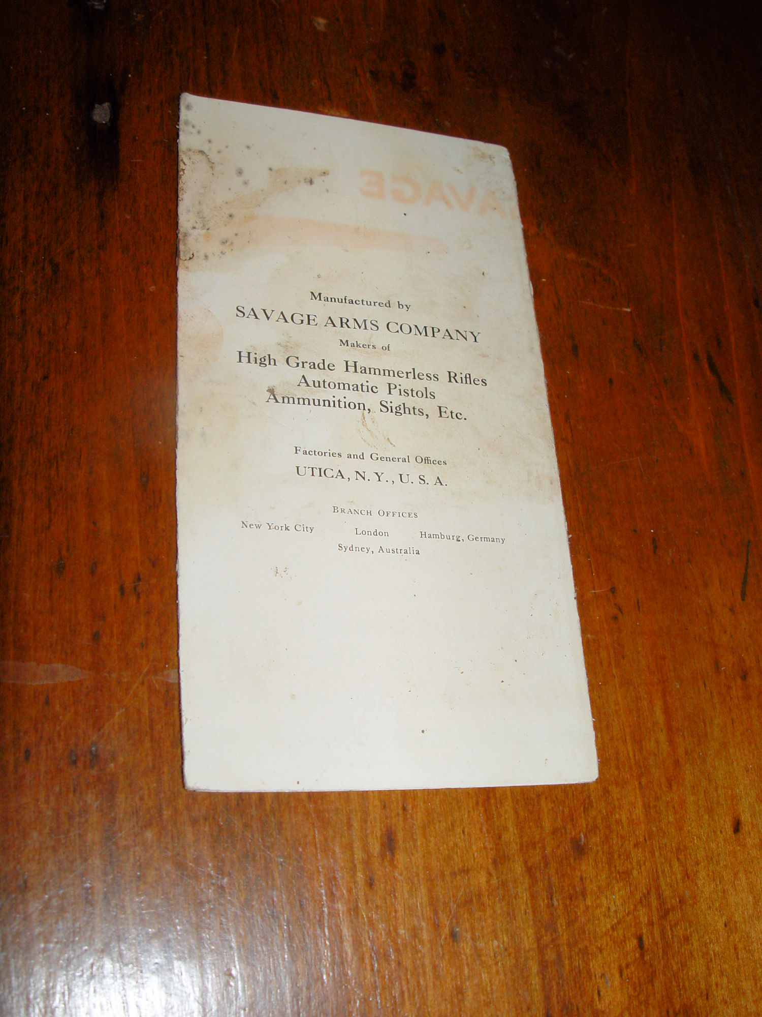Put out by the Savage Arms Company, Utica, NY - Maker of High Grade Hammerless Rifles, Automatic Pistols, Ammunition, Sights Etc.