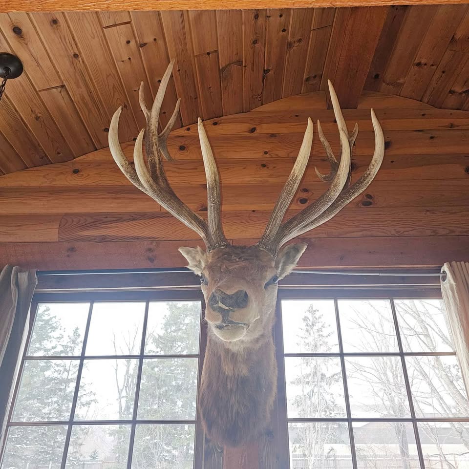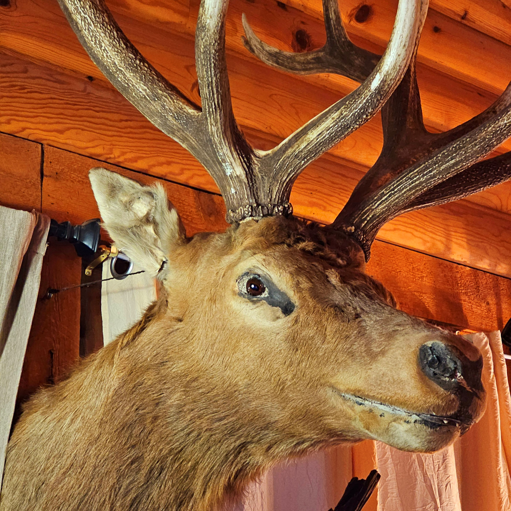 A very large Elk shoulder mount that came out of a Minnesota collectors estate. This monster is vintage and as you can see, the cape needs repaired. Stored for years in the cabin after the owner passed. The story is it is from Montana and brought to Minnesota many years ago. The mount was done sometime in the 1910s. The speculation was it was graded then but we cannot varify anything as again, 2nd hand mentions.