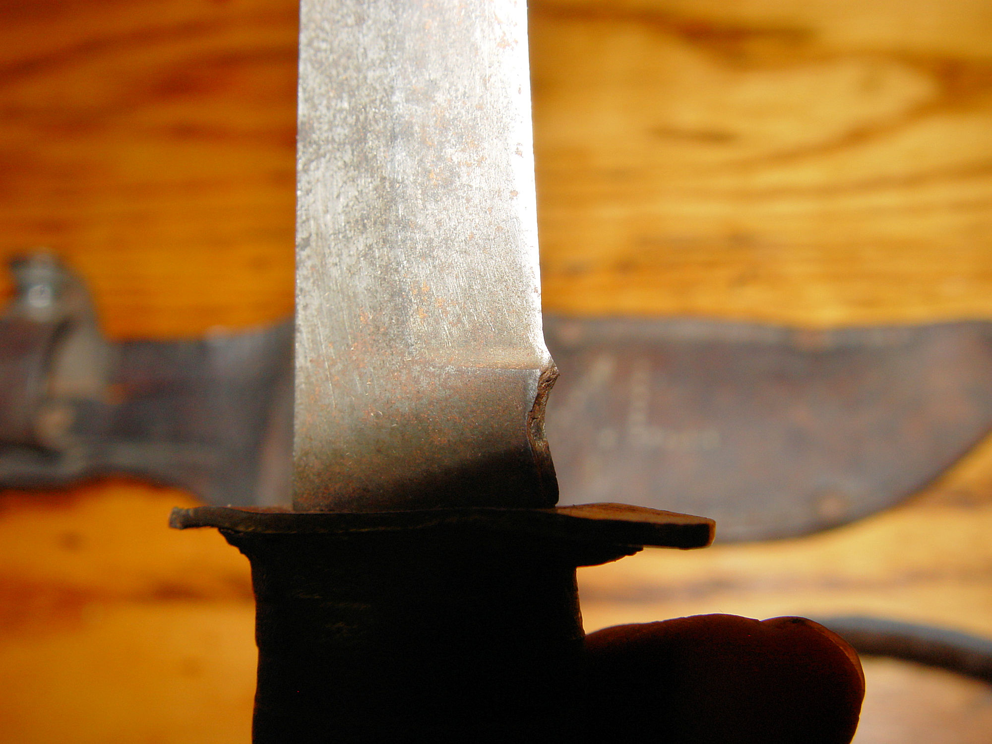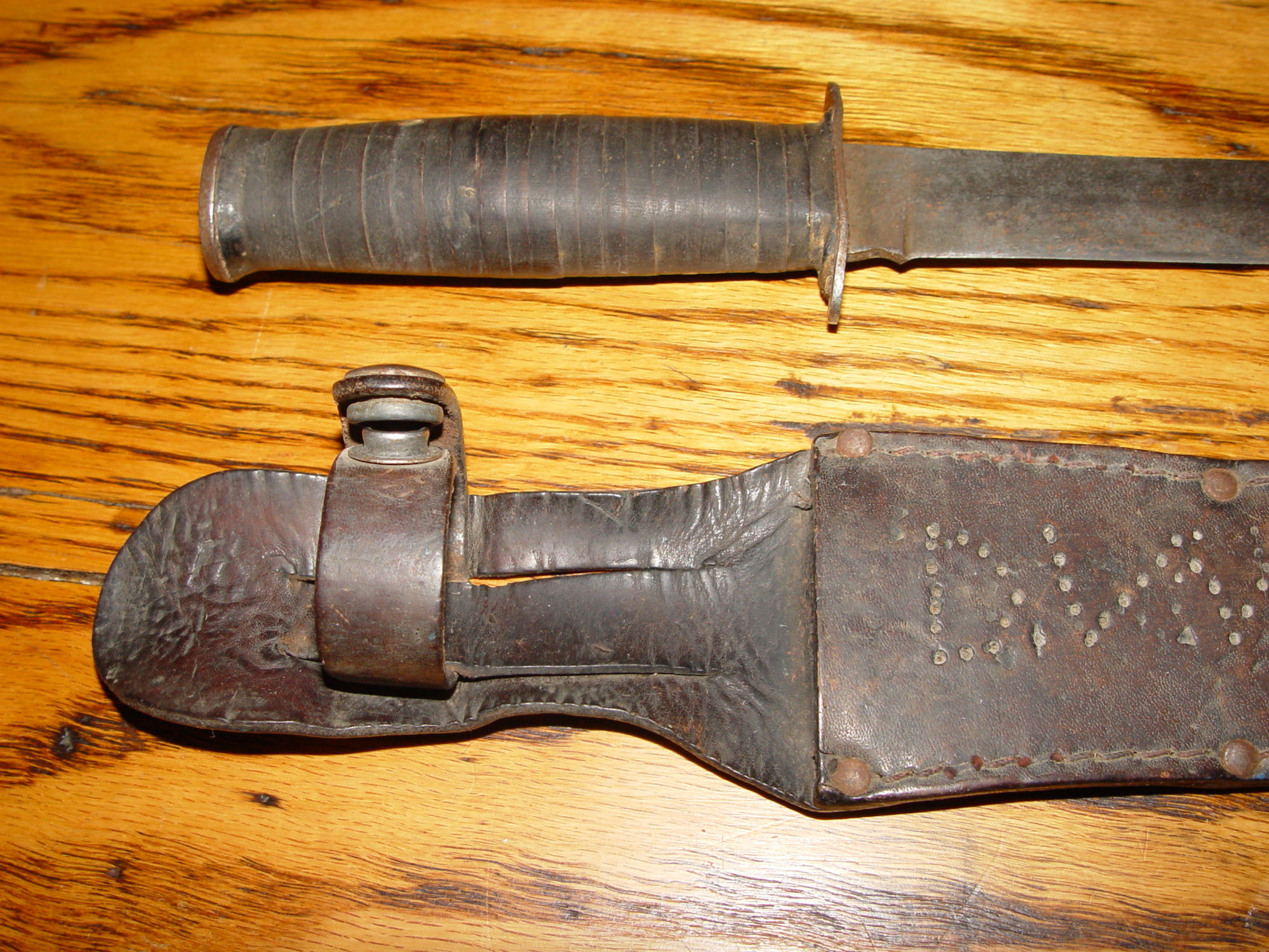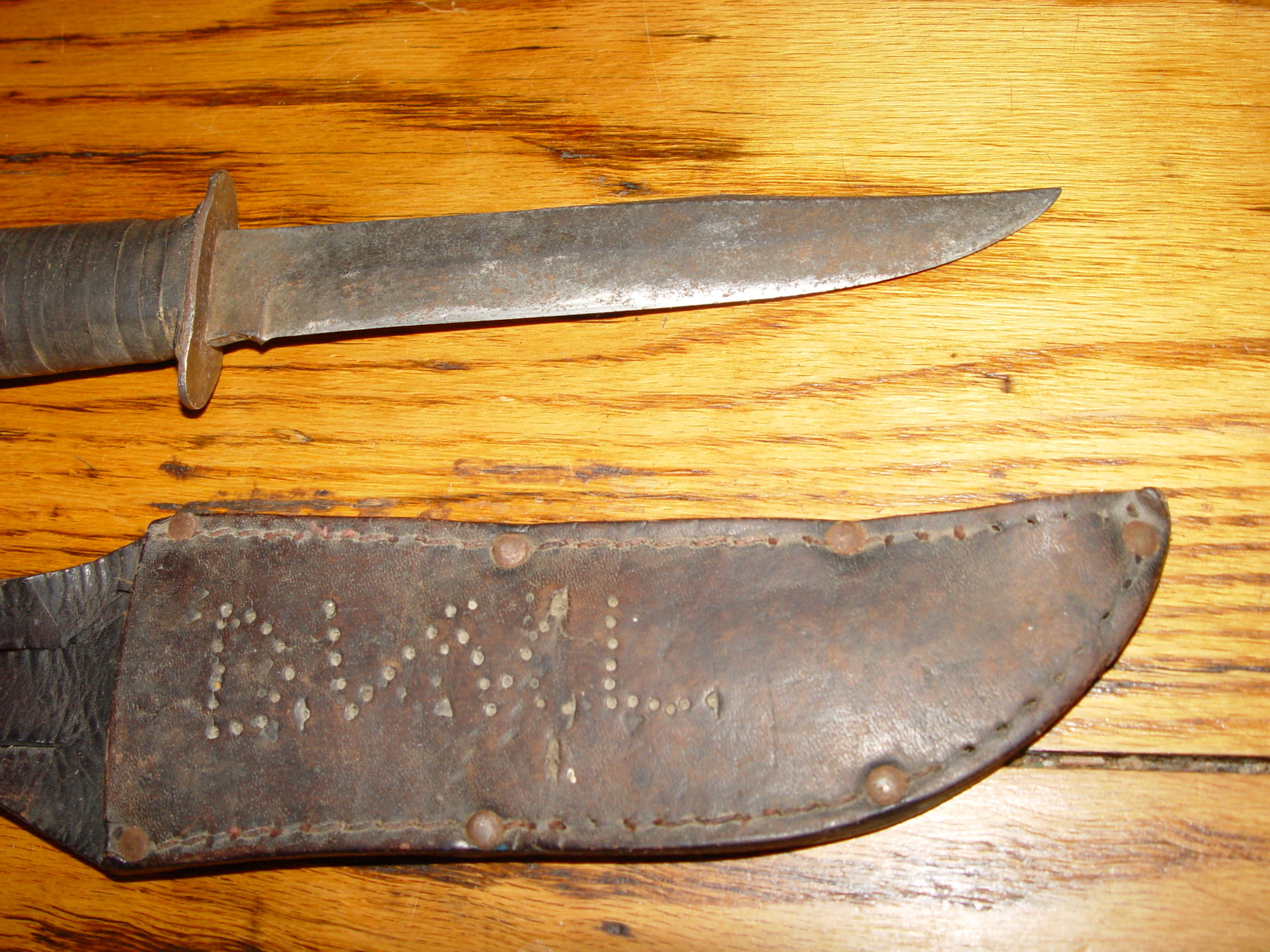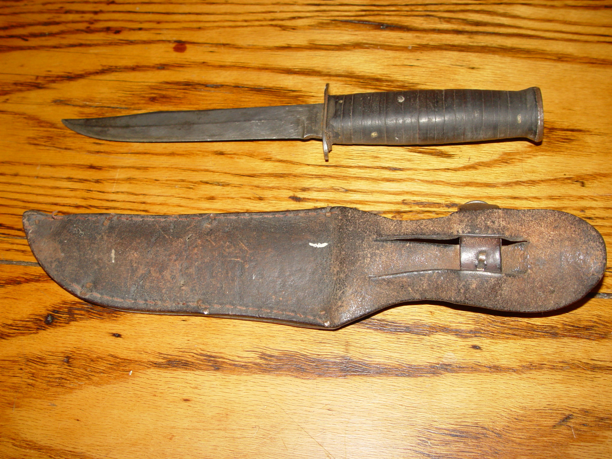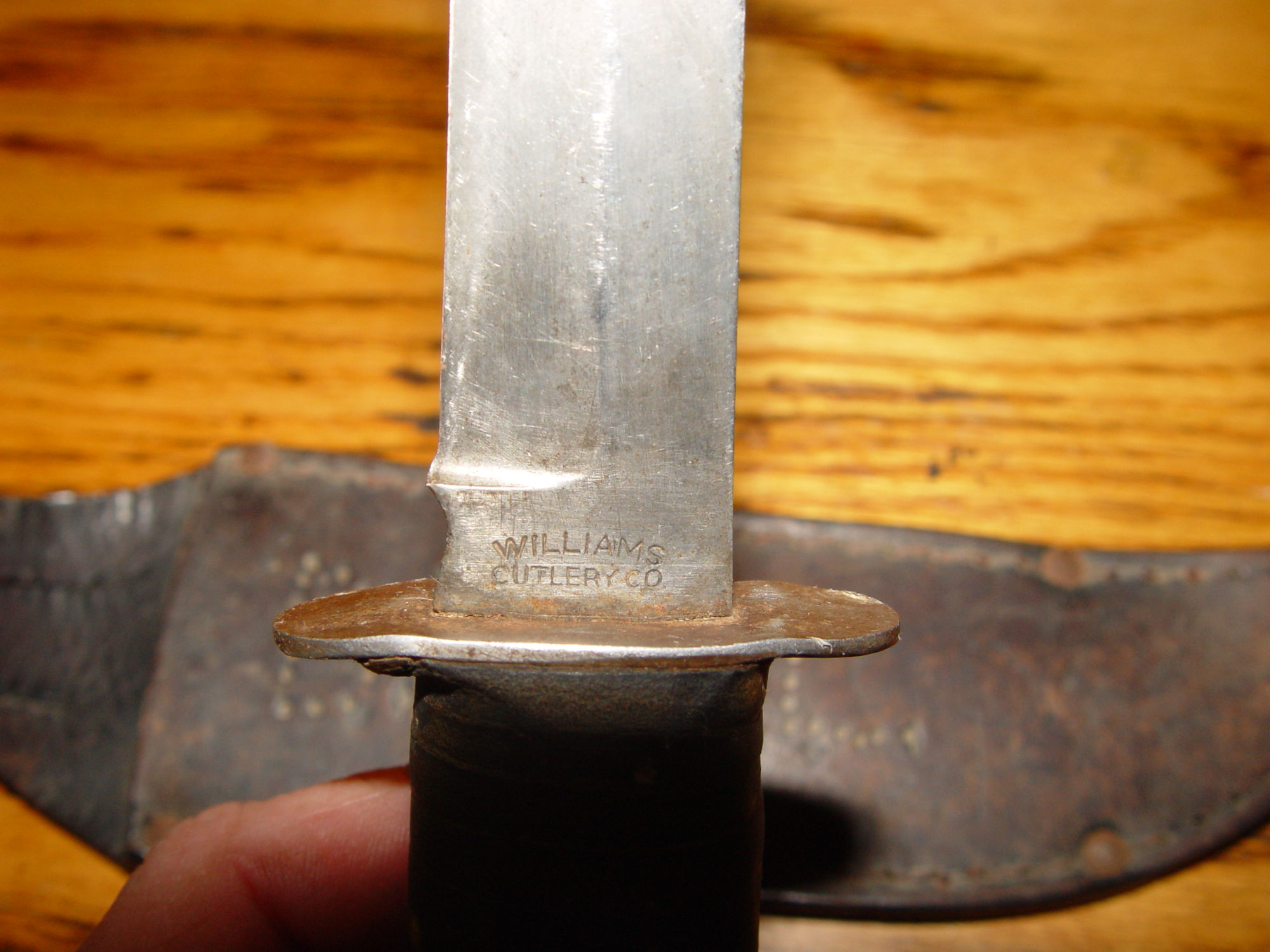 Neat old original US World War II Williams Cutlery Commercial Fighting Knife. This has it's original sheath or scabbard but the previous owner added his initials as can be seen in photos one and two. The makers name is showing above the guard. The knife is very tight and strong. The handle has a leather wrap. The blade is measuring approx. 6 inches and is still very sharp. Minor signs of sharpening but look to be a while ago. The overall length of the knife is approx. 10.25" long. Great piece to add to your collection.