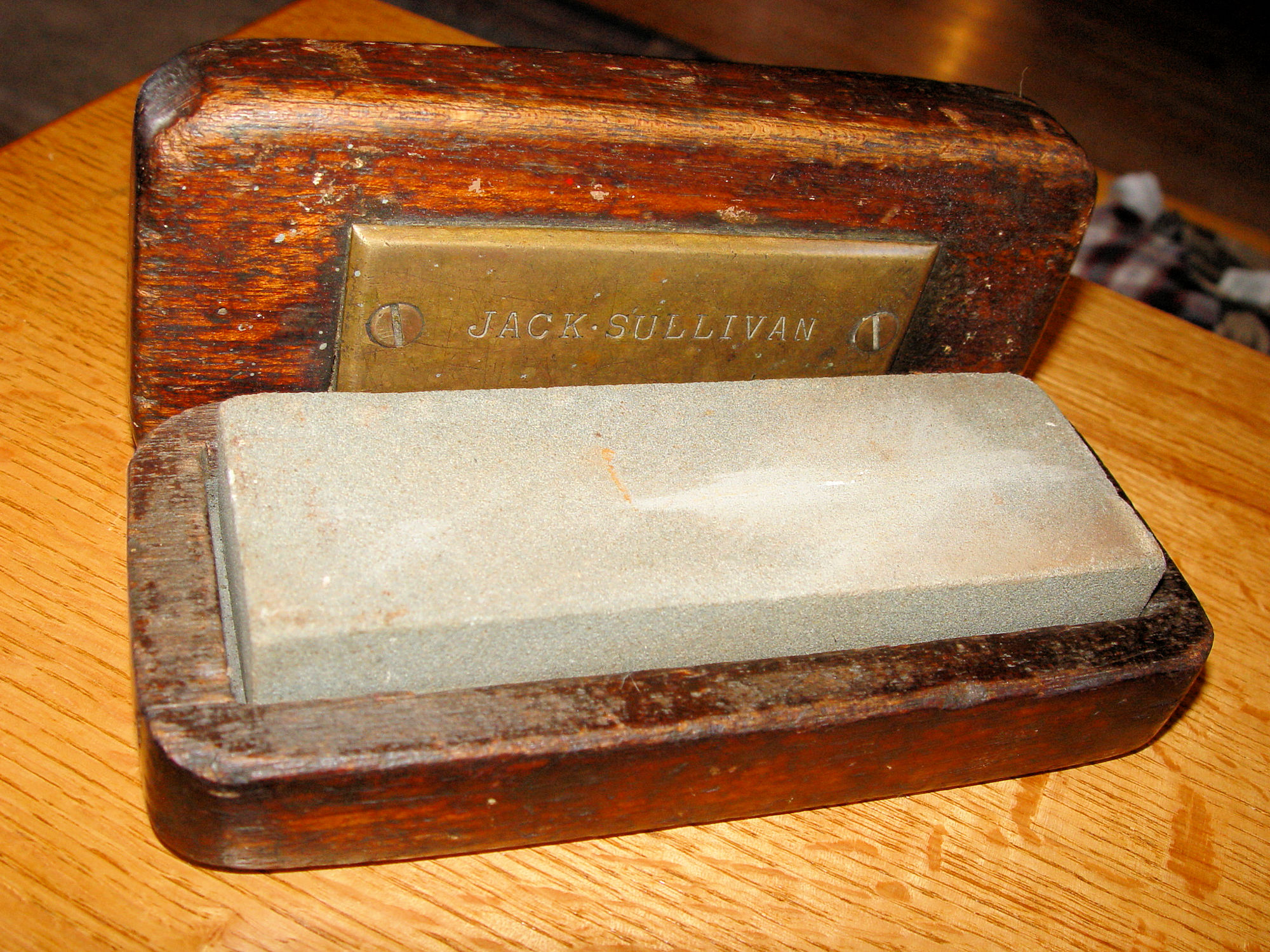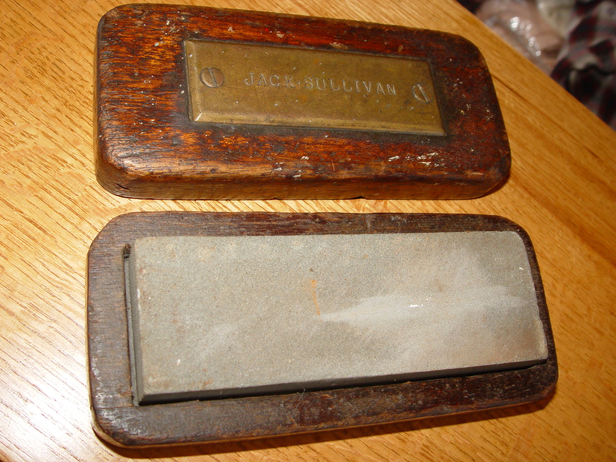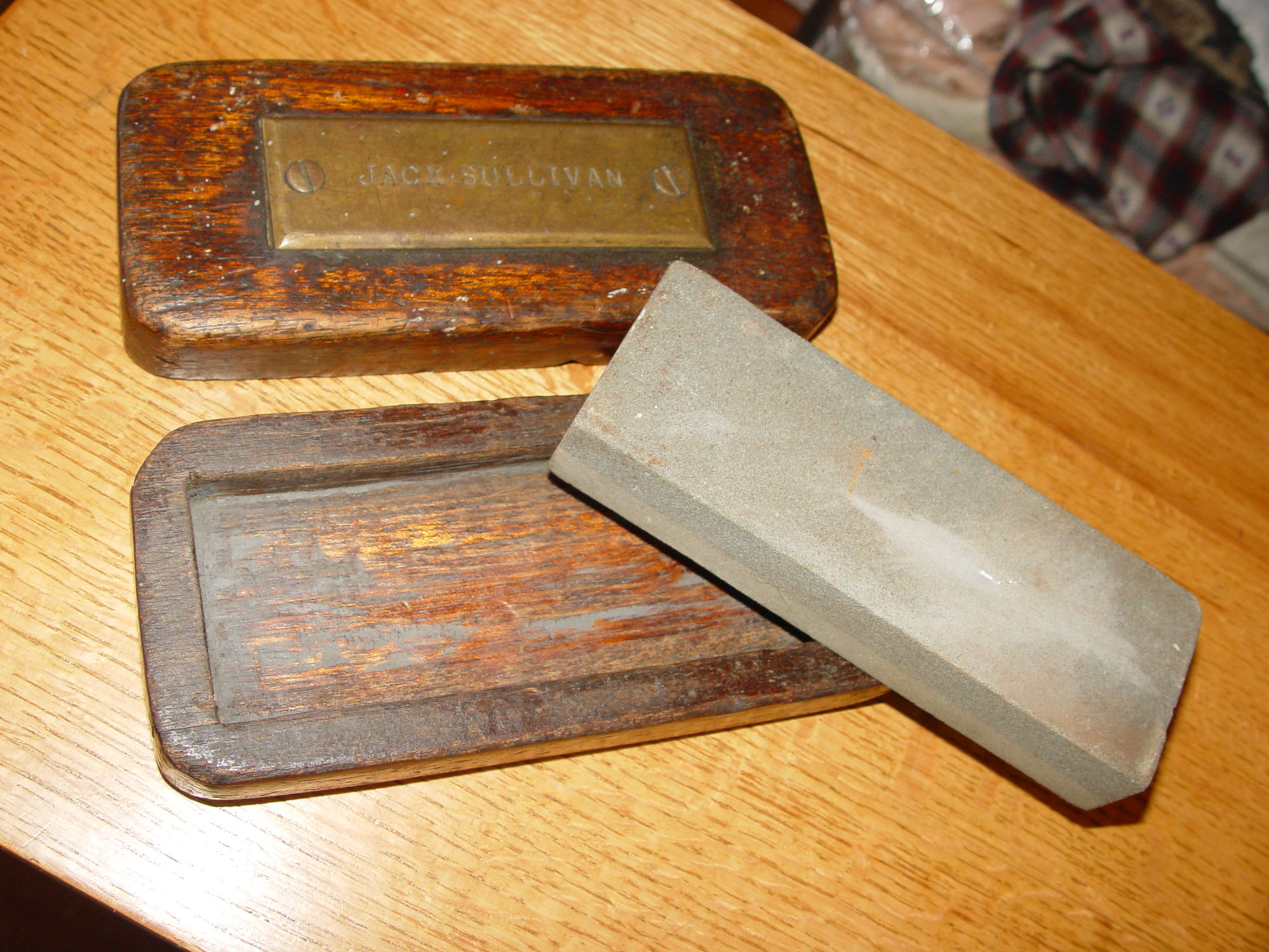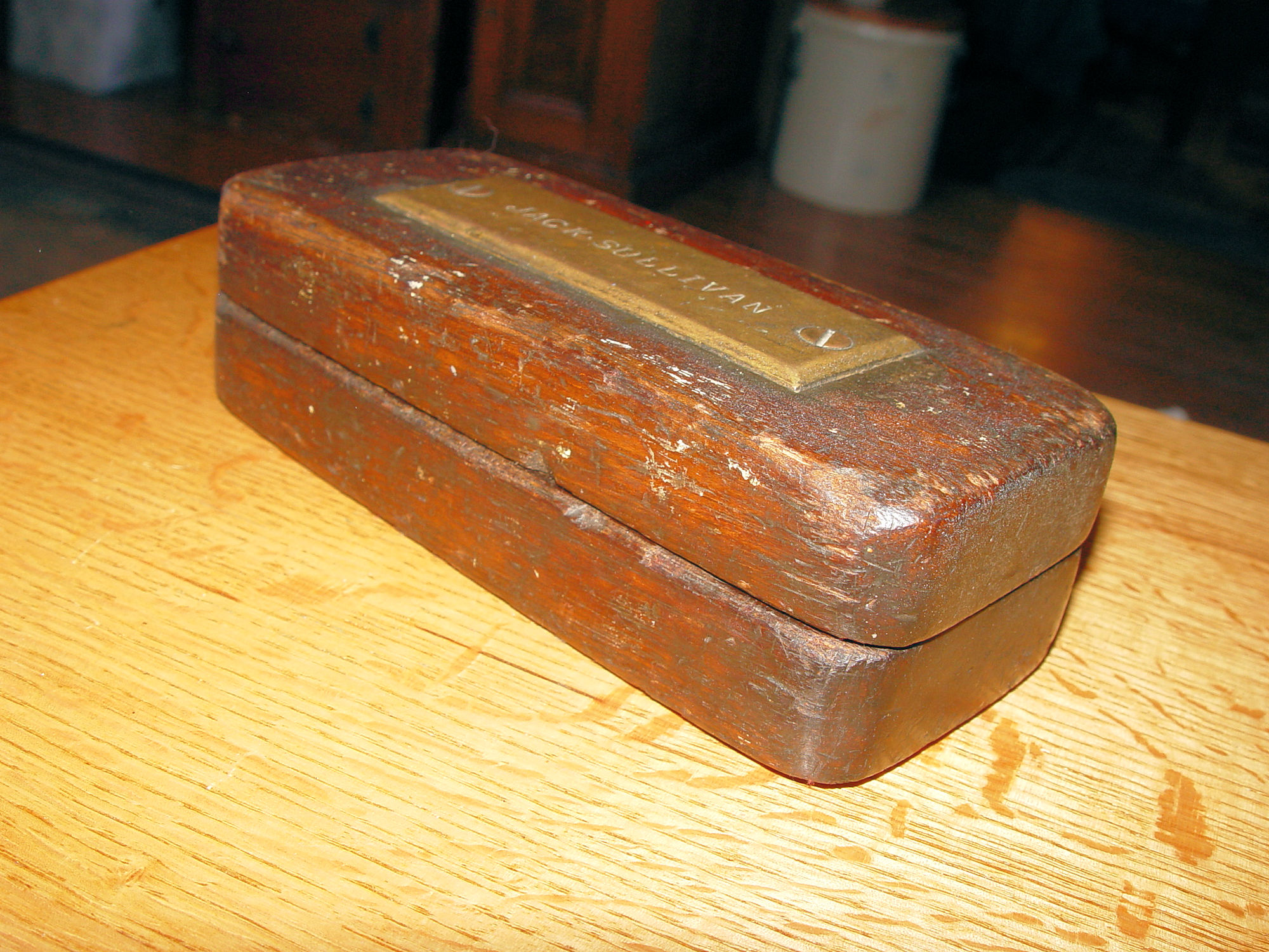 Handsome early Mahogany wood box case with brass name plaque on top for the maker and previous owner. Crafted to hold a large 6 by 2 by 1 inch carvers sharpening stone. This was found in Northern Minnesota in an estate purchase. The owner was believed to be a close friend to Jack Sullivan. The wood case measures 7 1/8" long by 3 1/8" deep and 2" tall. Both stone and case are in very good condition. The case has an old repair on one end, note photos. Great collectible for the carver or knife collector. Pretty just to have on display.