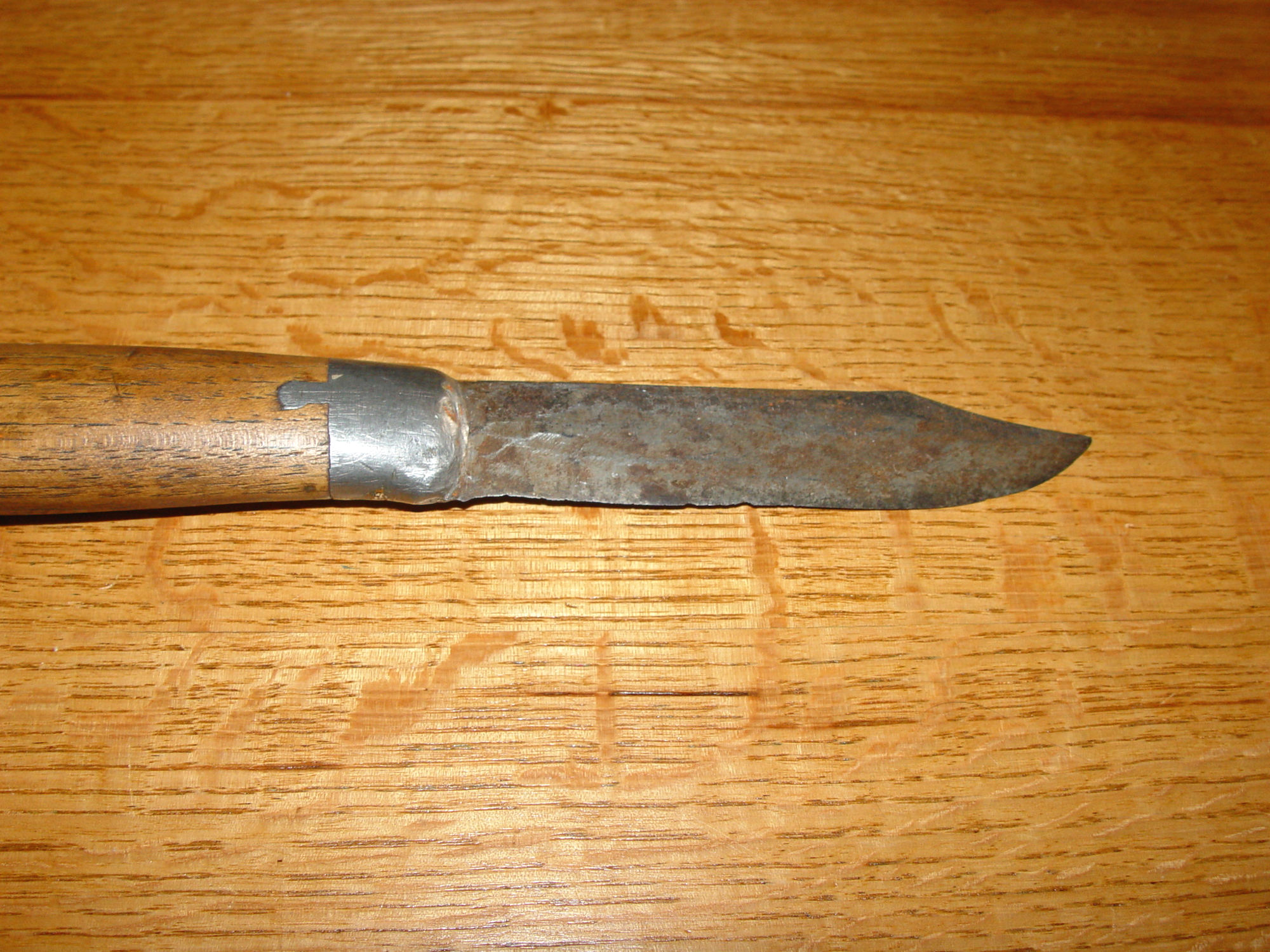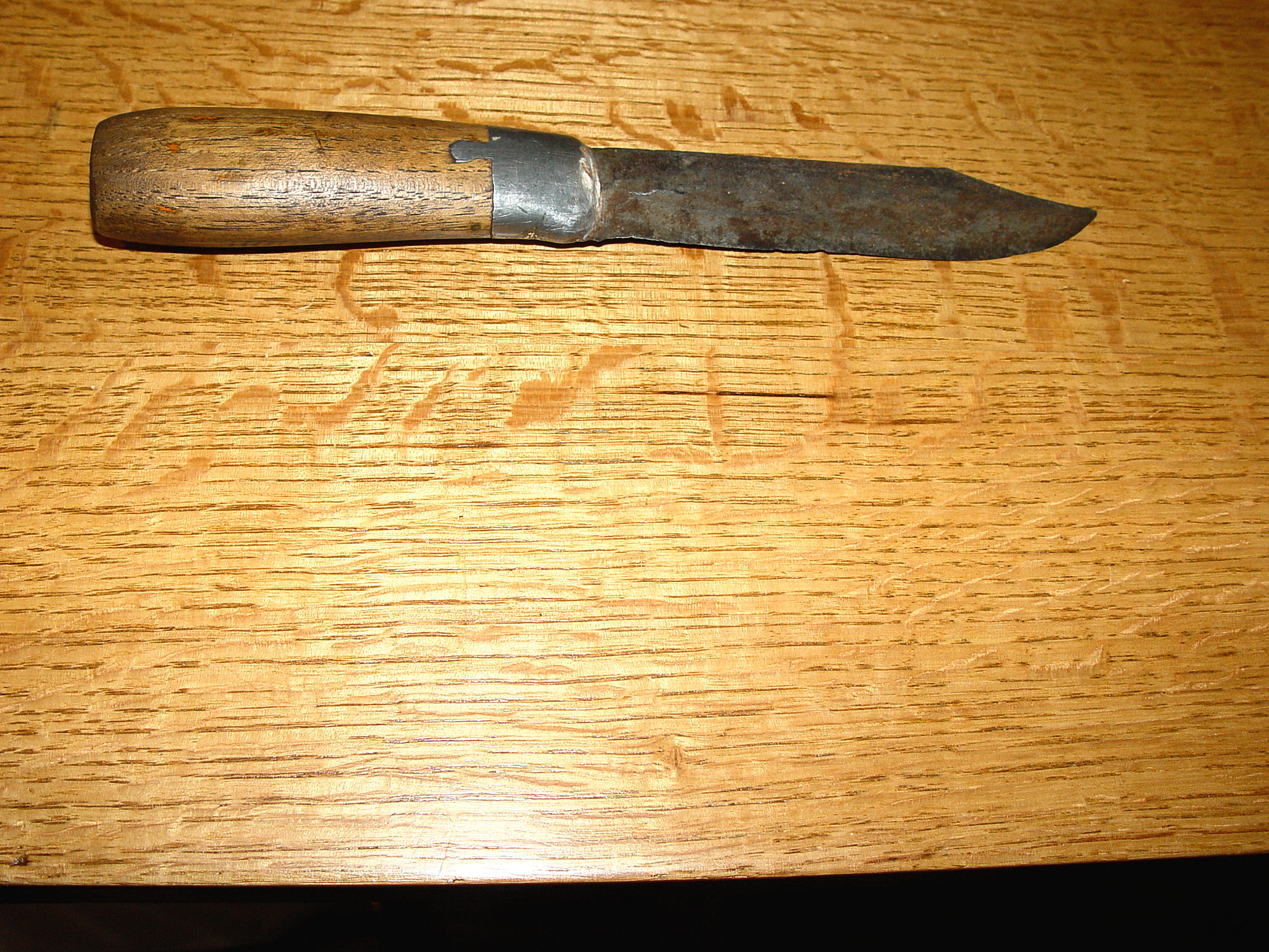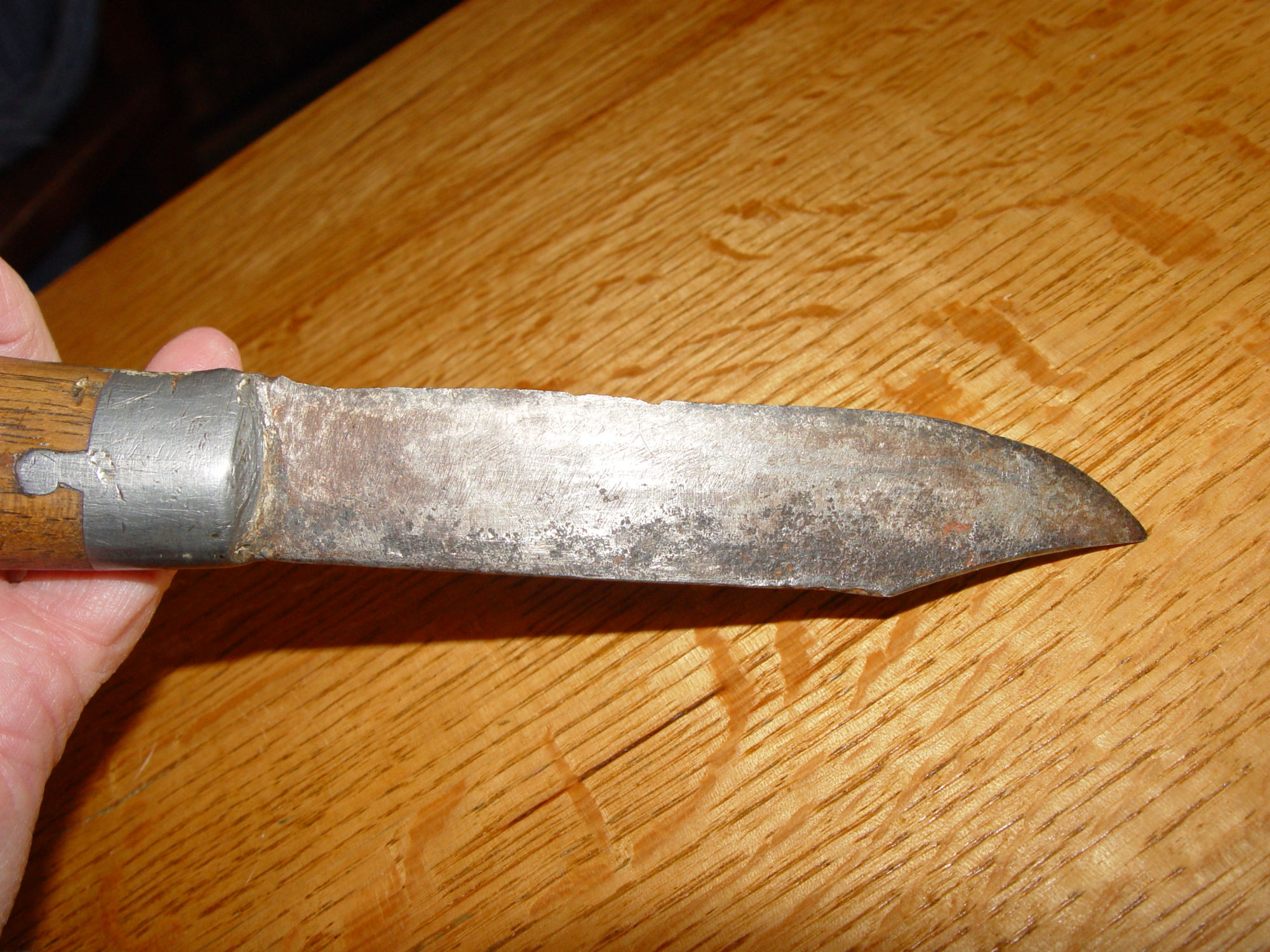 Well worn and used Norwegian knife, handmade. Very attractive handle with Pewter inlay. Looks like a butternut wood handle. The blade is again, well worn. Thinking a knife maker would have fun with this. Very early piece. Still attractive enough to make a great display or used as a prop.
