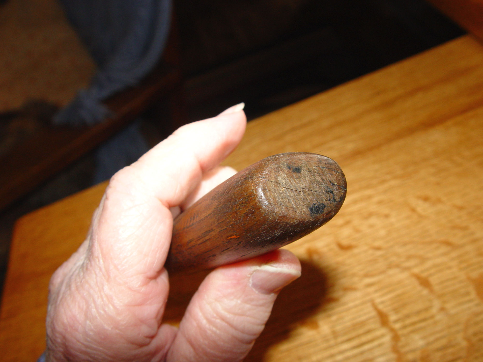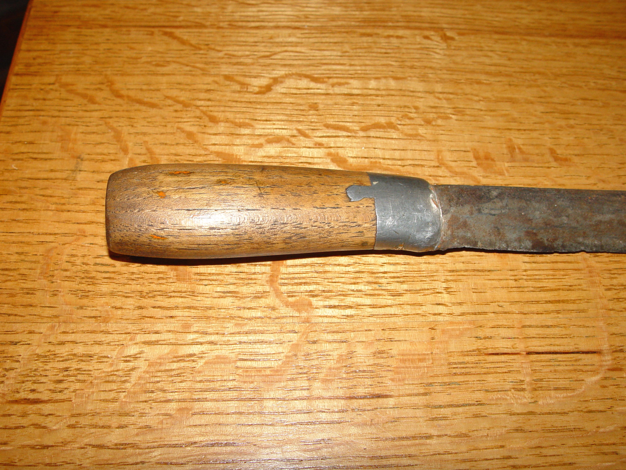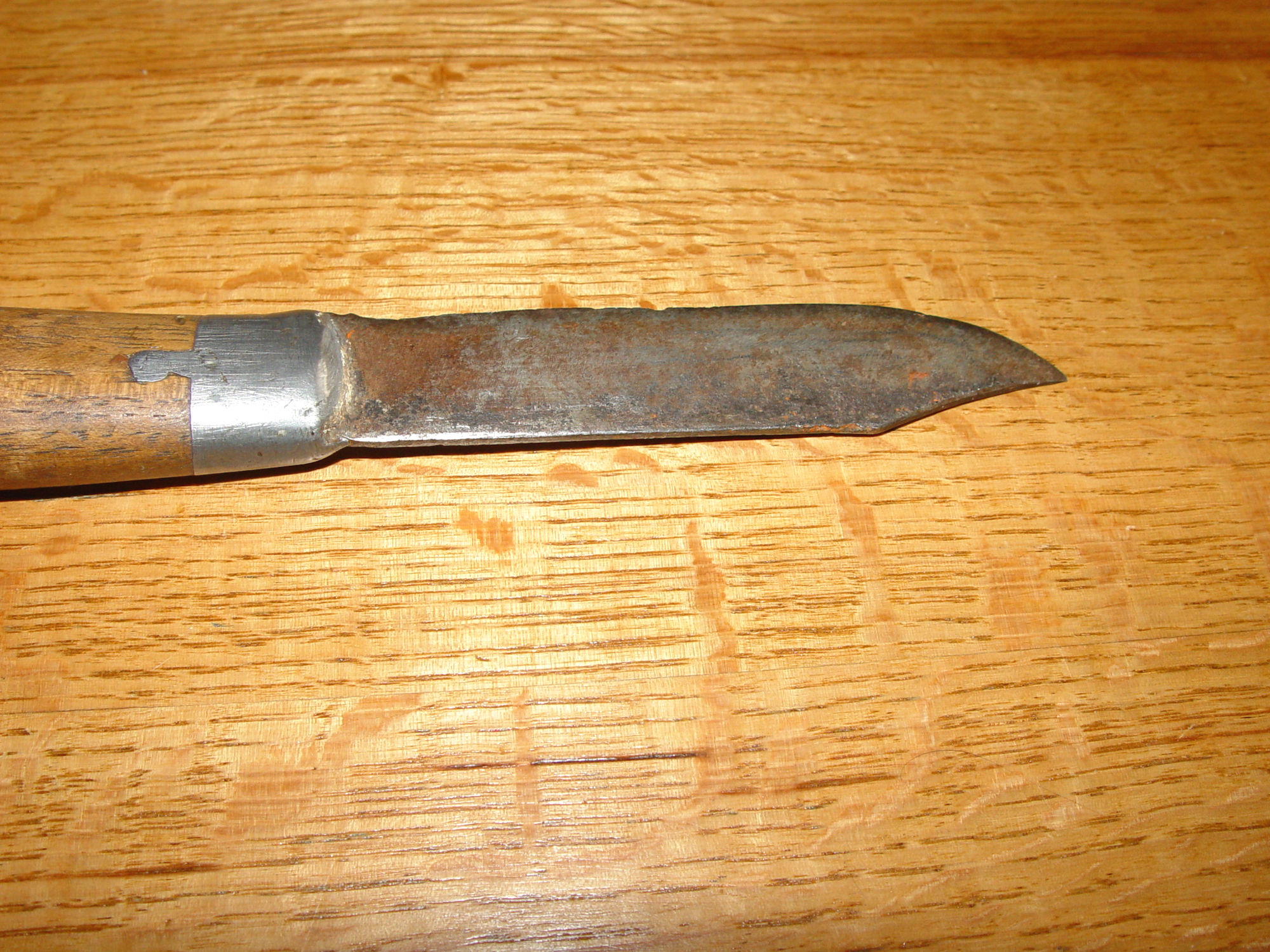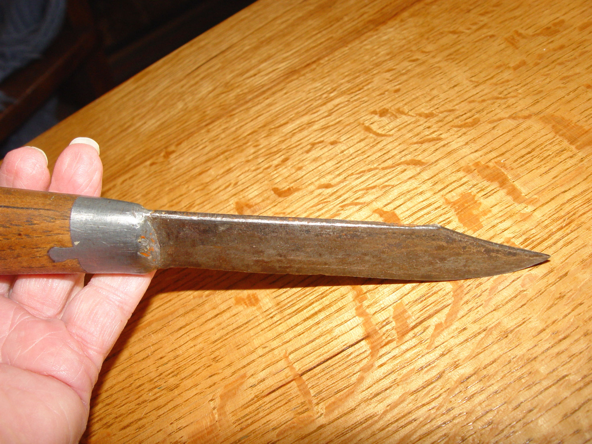 Well worn and used Norwegian knife, handmade. Very attractive handle with Pewter inlay. Looks like a butternut wood handle. The blade is again, well worn. Thinking a knife maker would have fun with this. Very early piece. Still attractive enough to make a great display or used as a prop.