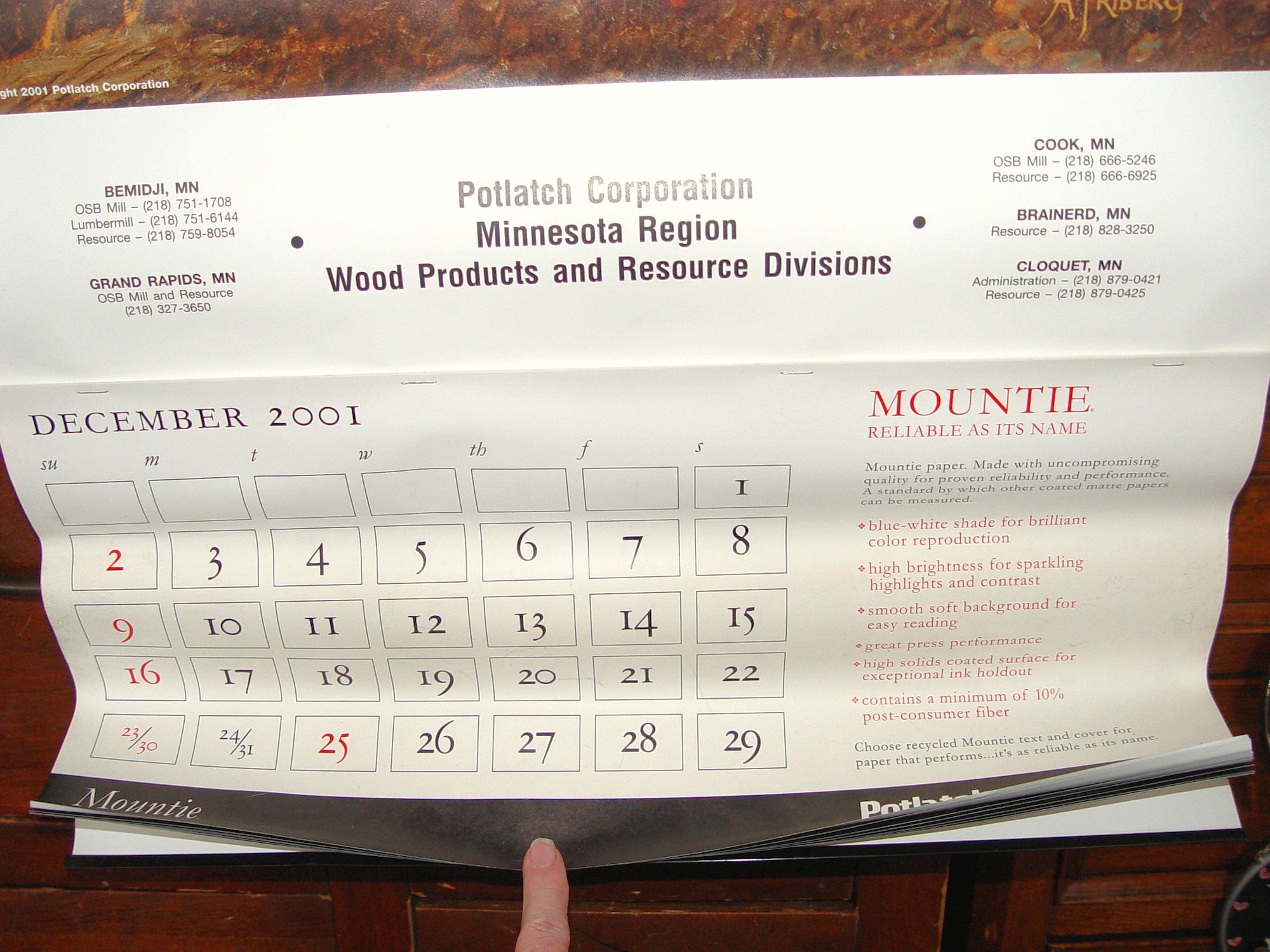 This was the kind of calendar that was often given to clients, vendors, or employees as a promotional item. It is promoting 'Mountie Paper', a historic brand of printing and writing paper. Both decorative and collectible appeal, especially for people who enjoy Mountie art, or Potlatch memorabilia.