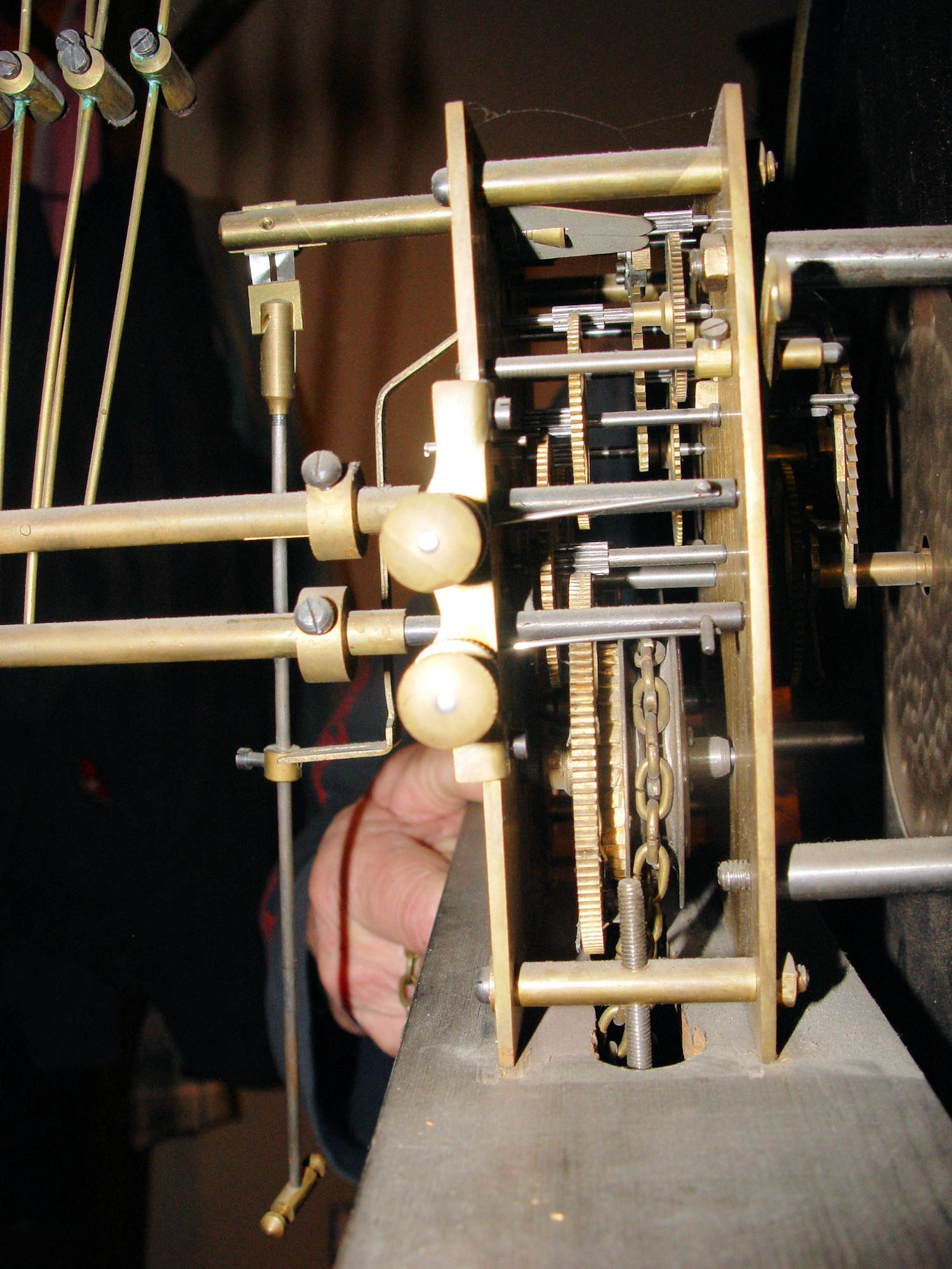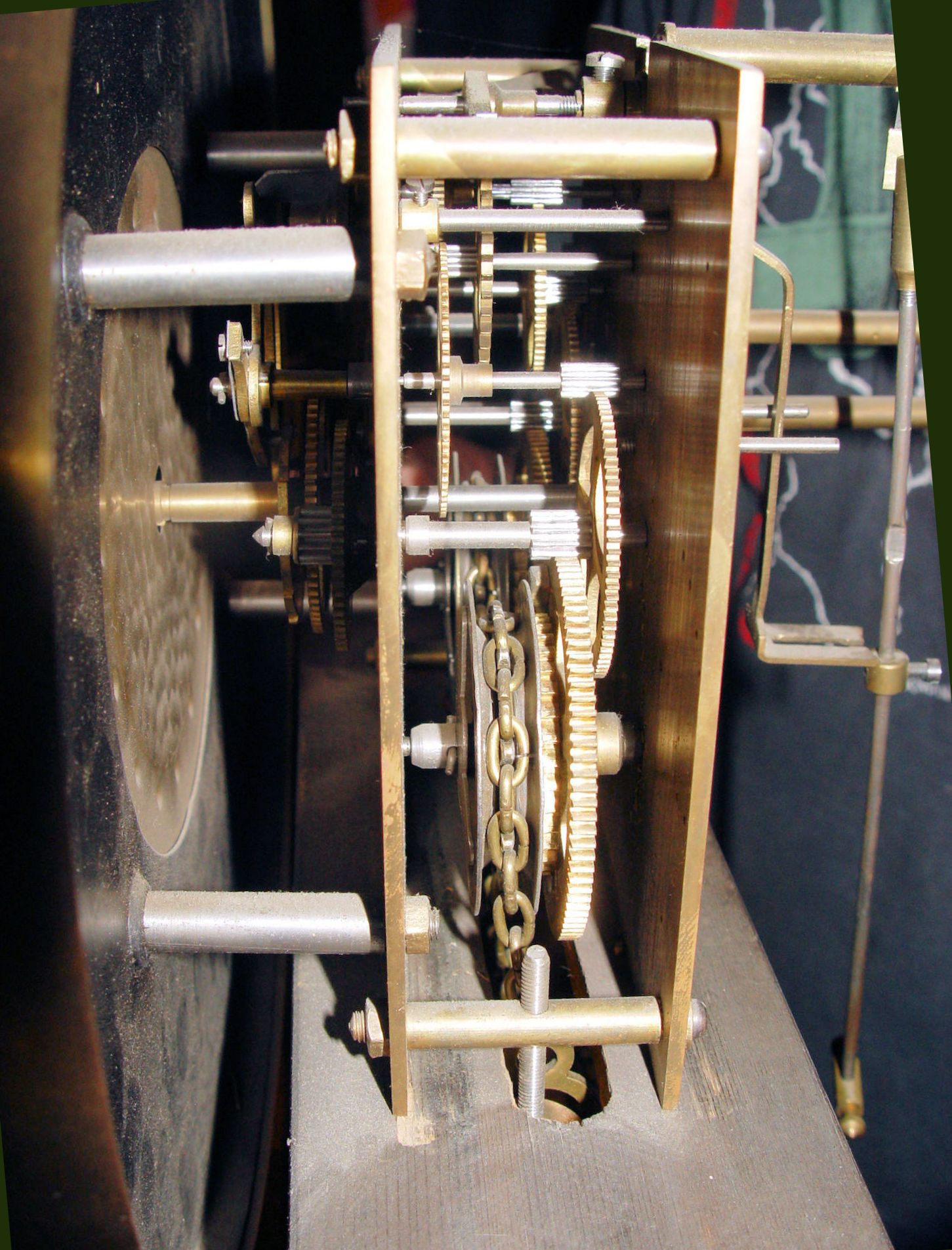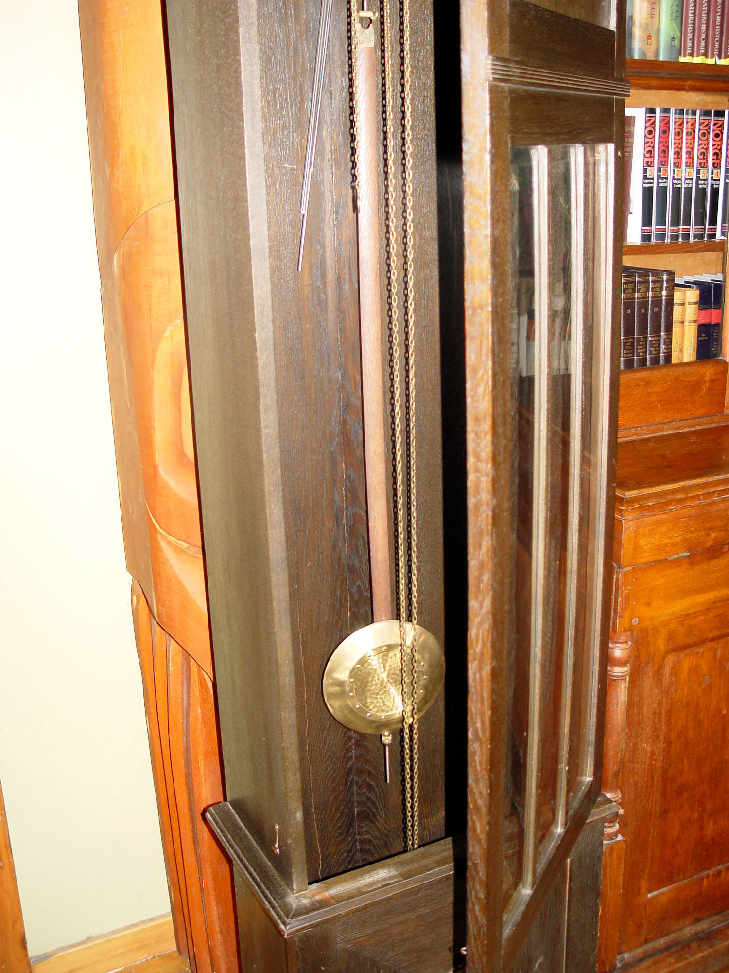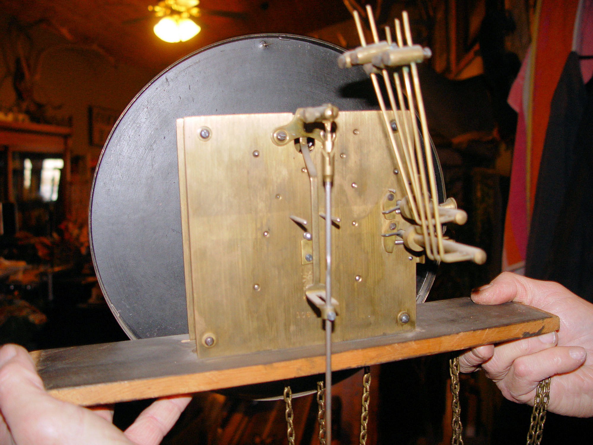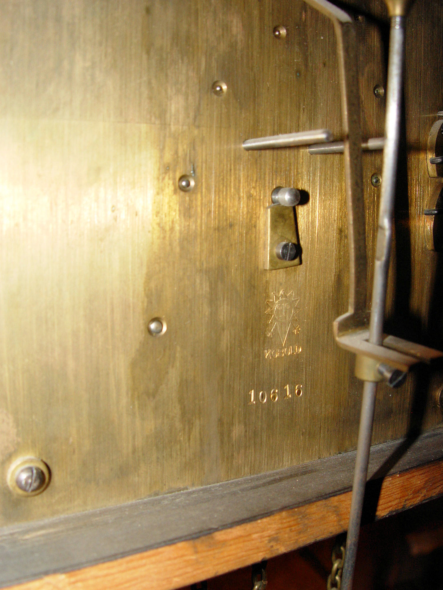 Beautiful Grandfather clock that came to us in a estate purchase. The above information was found about the maker and I'm guessing this clock dates to the 1920's. Nice heavy movement. Very thick plates and gears. I took off the clock weights as we were moving the piece and wanted to secure the mechanism. Please note that the previous owner cut the hook part of the one weight for reason's unknown. Believe this can be replaced. (See photos). Also they show some minor dents. Heavy brass. The pendulum stem and the suspension spring etc. are in very good condition. Overall it looks like a heavy duty movement, lots of brass. The face is a brilliant brass with black hands. he back of the clock works has a makers mark, Kobold, the numbers 10616 and there is also a funny little guy that looks like a sun god (just my interpretation.