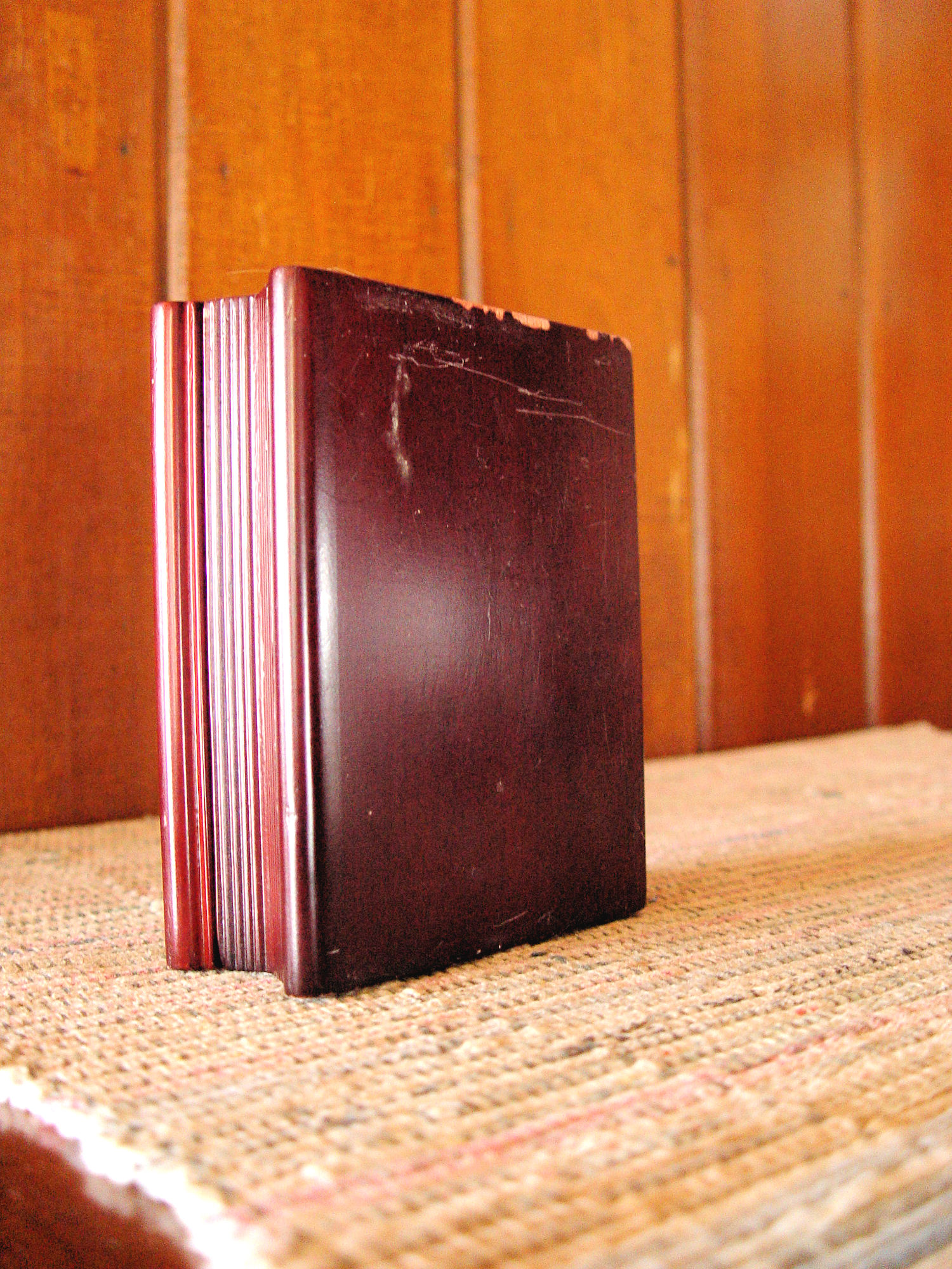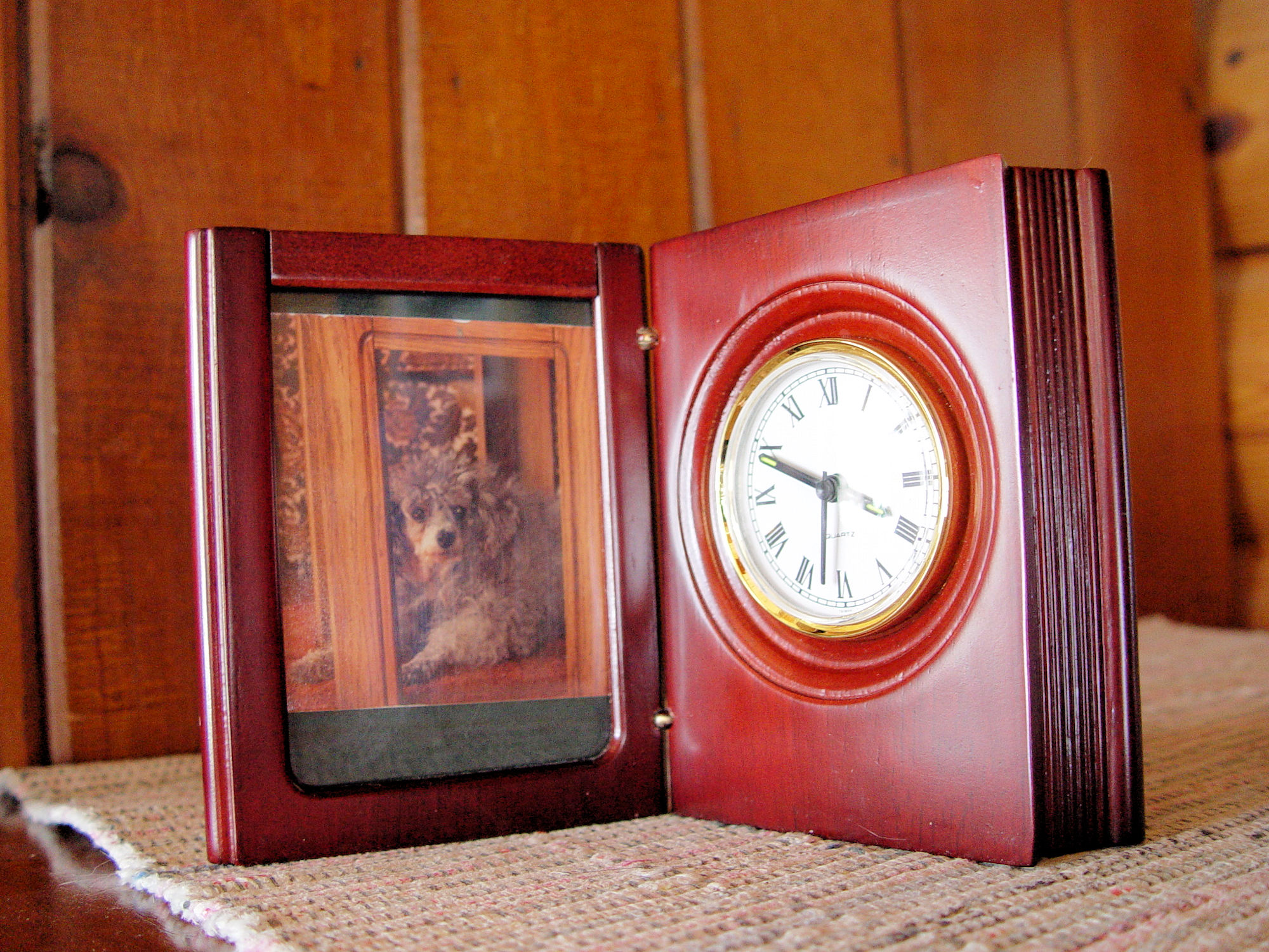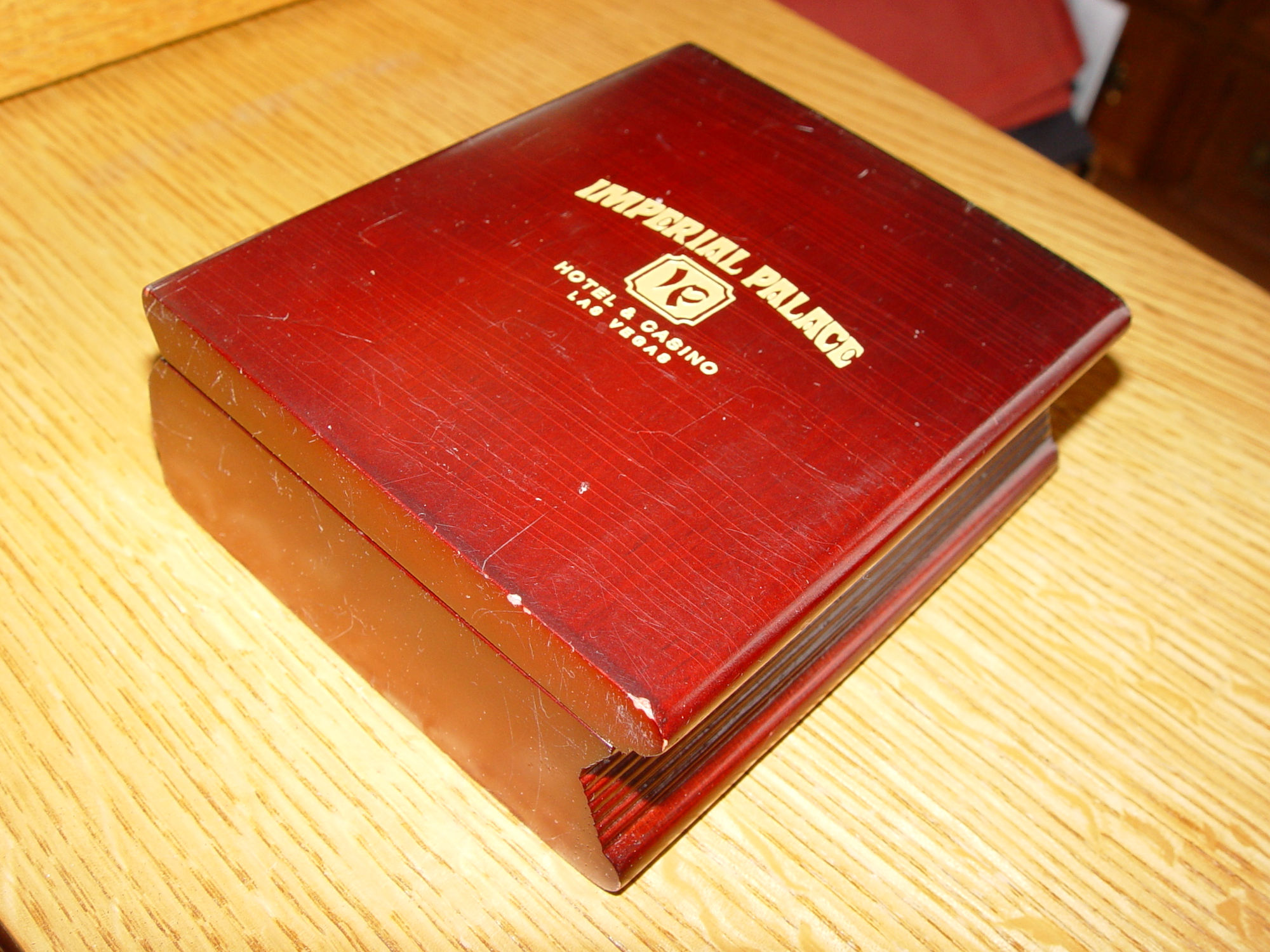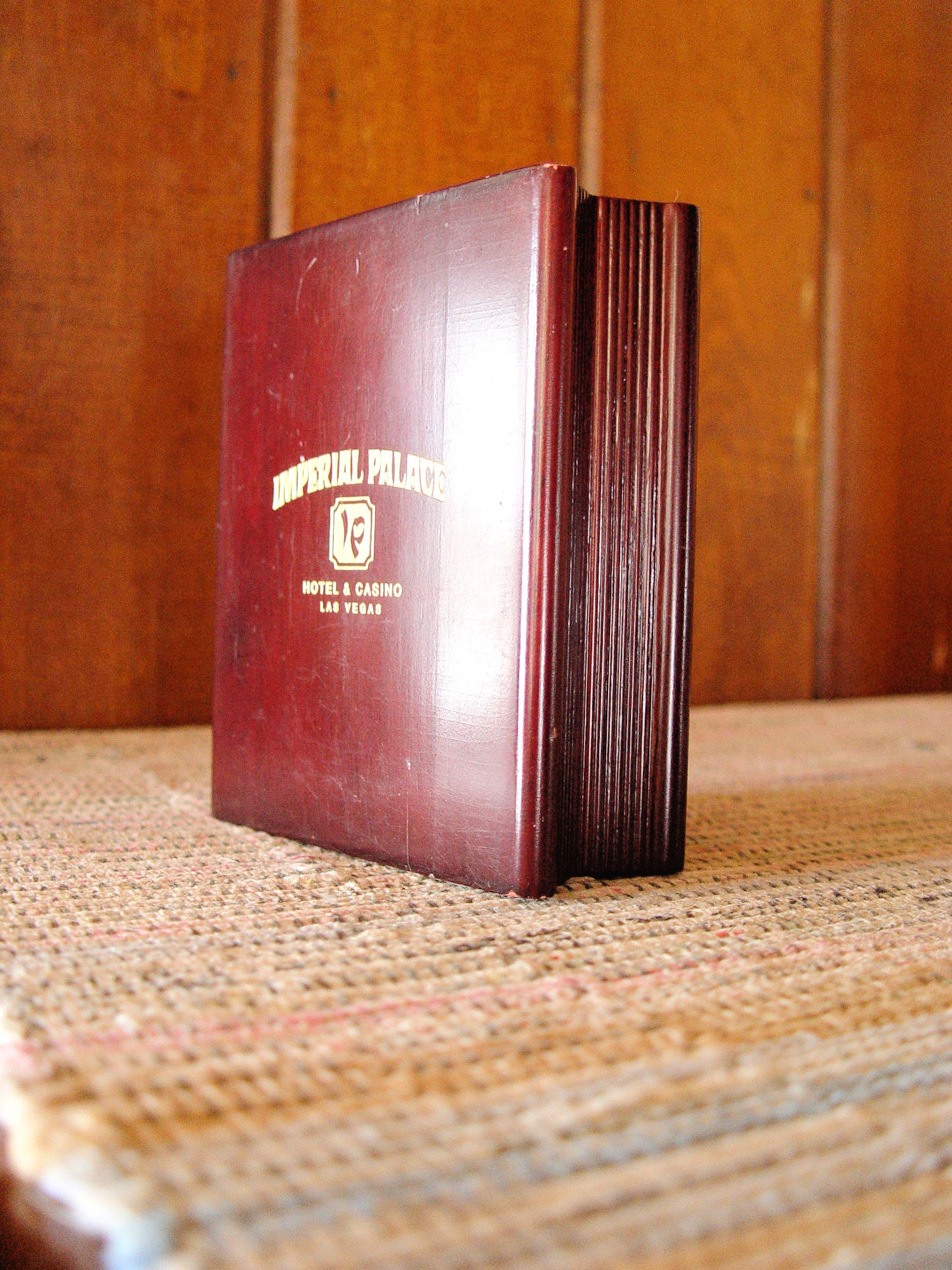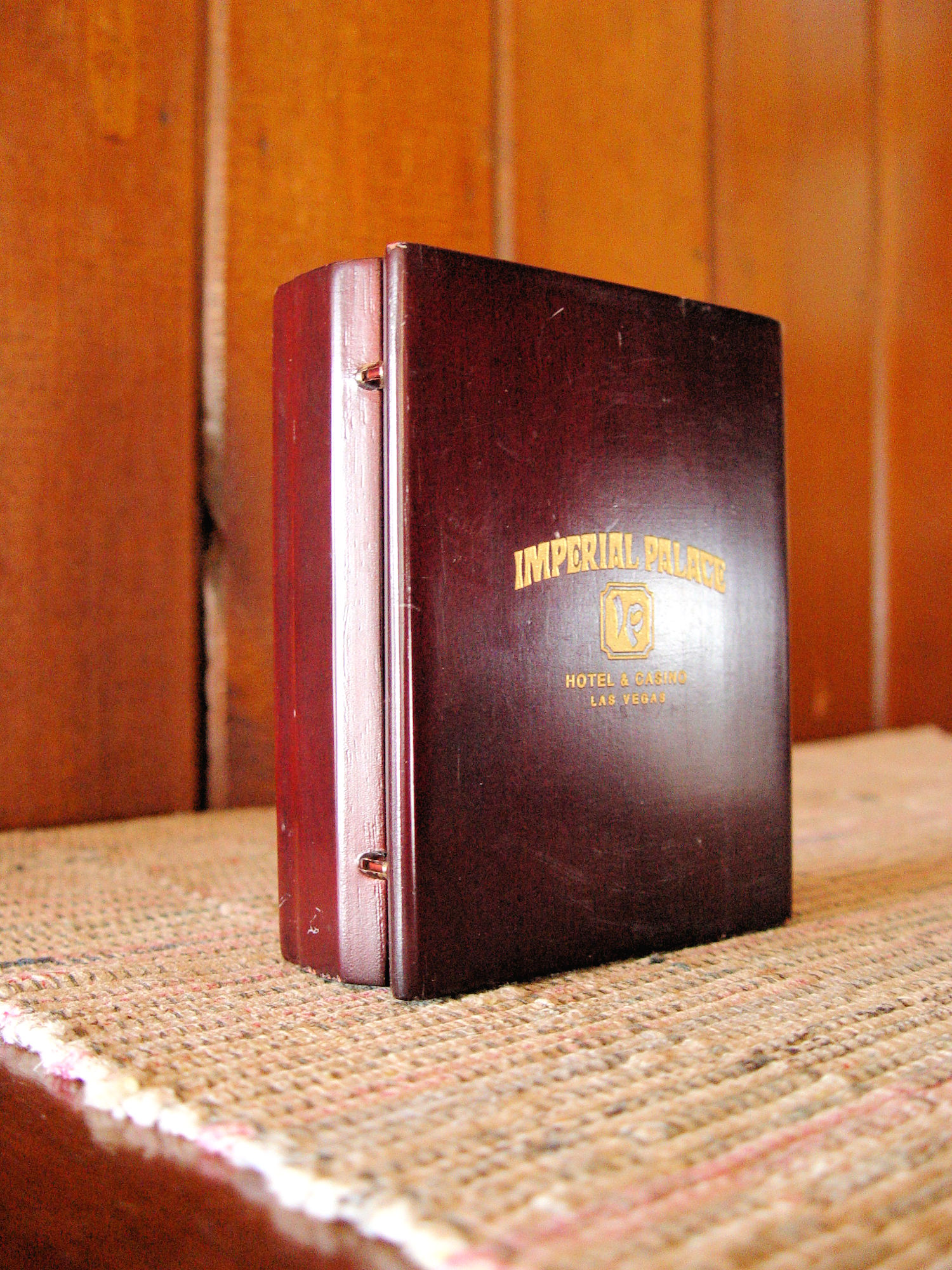 Imperial Palace was an Asian-themed hotel and casino located left of the Flamingo on the Las Vegas Strip in Paradise, Nevada. It operated from 1979 to 2011 and was owned by Harrah's Entertainment (now Caesars Entertainment). The hotel is currently known as the Linq. This is a quartz clock that is hidden in what looks to be wooden book covers. Gold gilt lettering on the front shows Imperial Palace, Hotel & Casino - Las Vegas. Inside you find a place for a photograph ( the sweet pooch was in this when I found it ). And the clock simply states Quartz on the face. I have not removed the clock to find out if it works. It looks pretty clean. As found in estate.