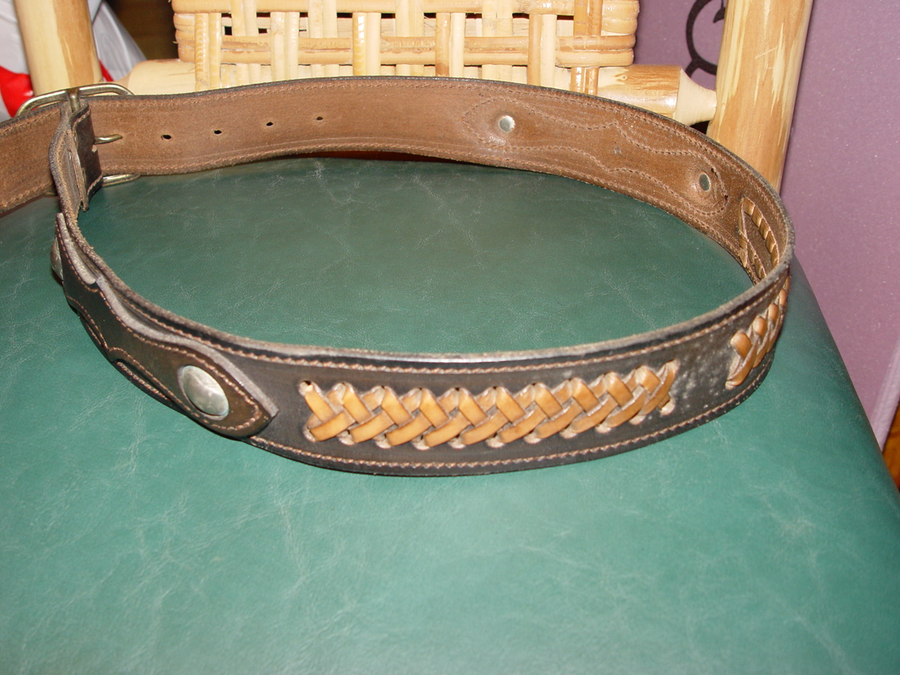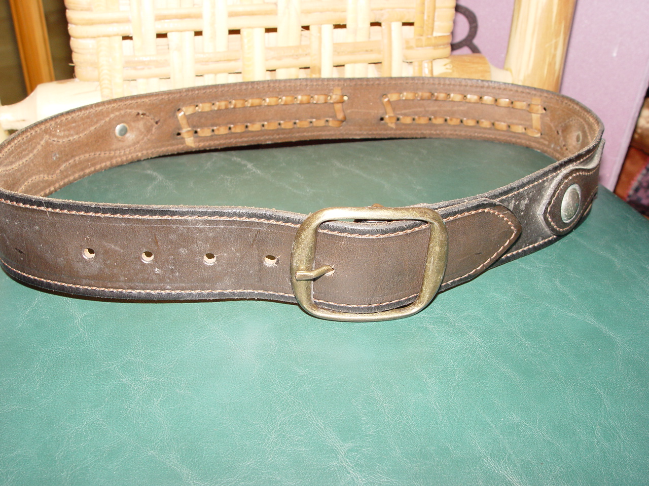Warm and in a good condition that looks not to have been worn very much, but perhaps has light and minor wear. The nickles do show wear but more than likely placed worn. the belt has an applied leather to the belt and also show a cross pattern leather stitch.