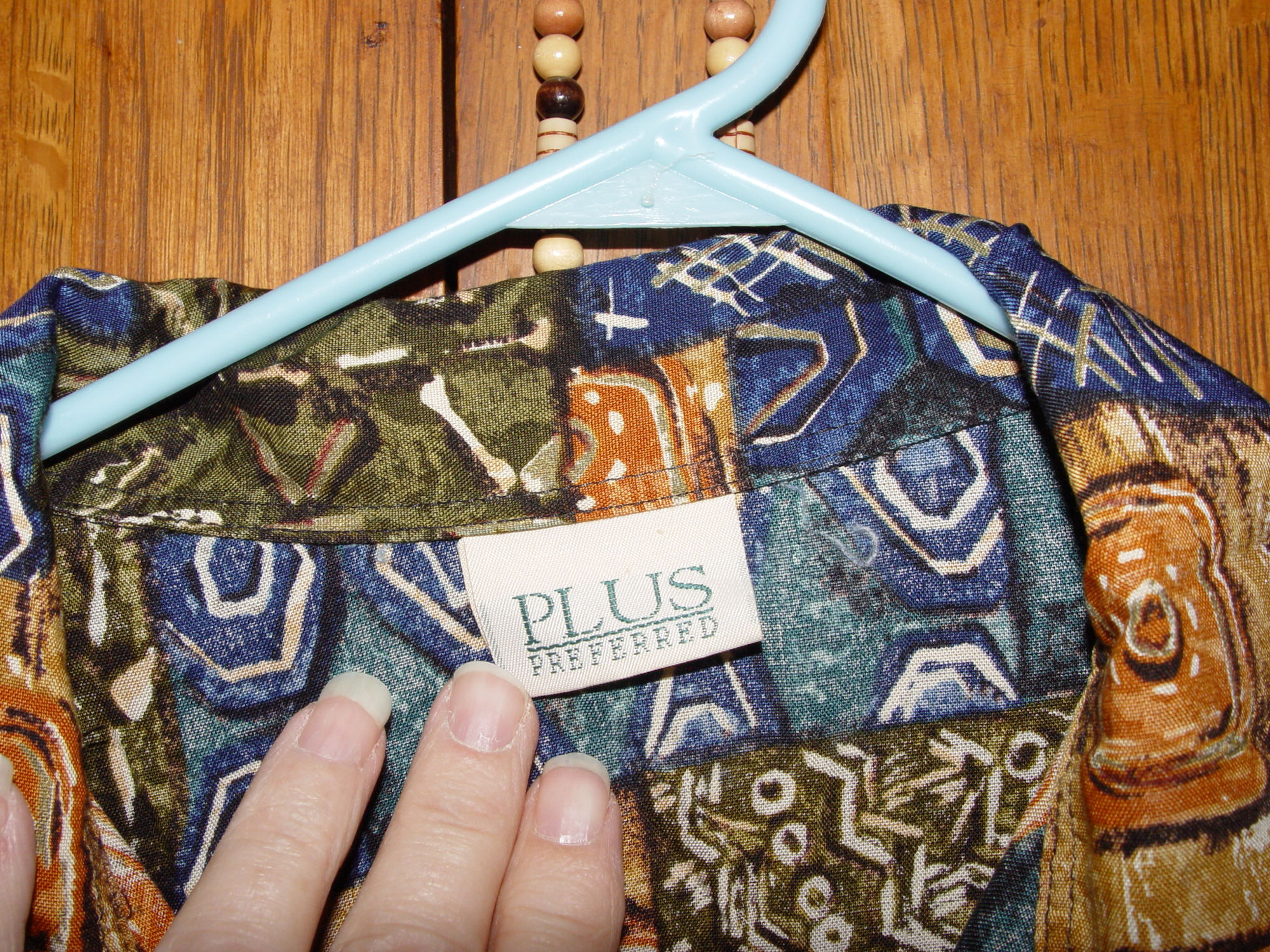I can't find a size on the shirt but see the approx. measurements to help with fittings. No other tags other than what's shown....see measurements for approx. size. Material is soft and may be rayon cotton blend but not sure.