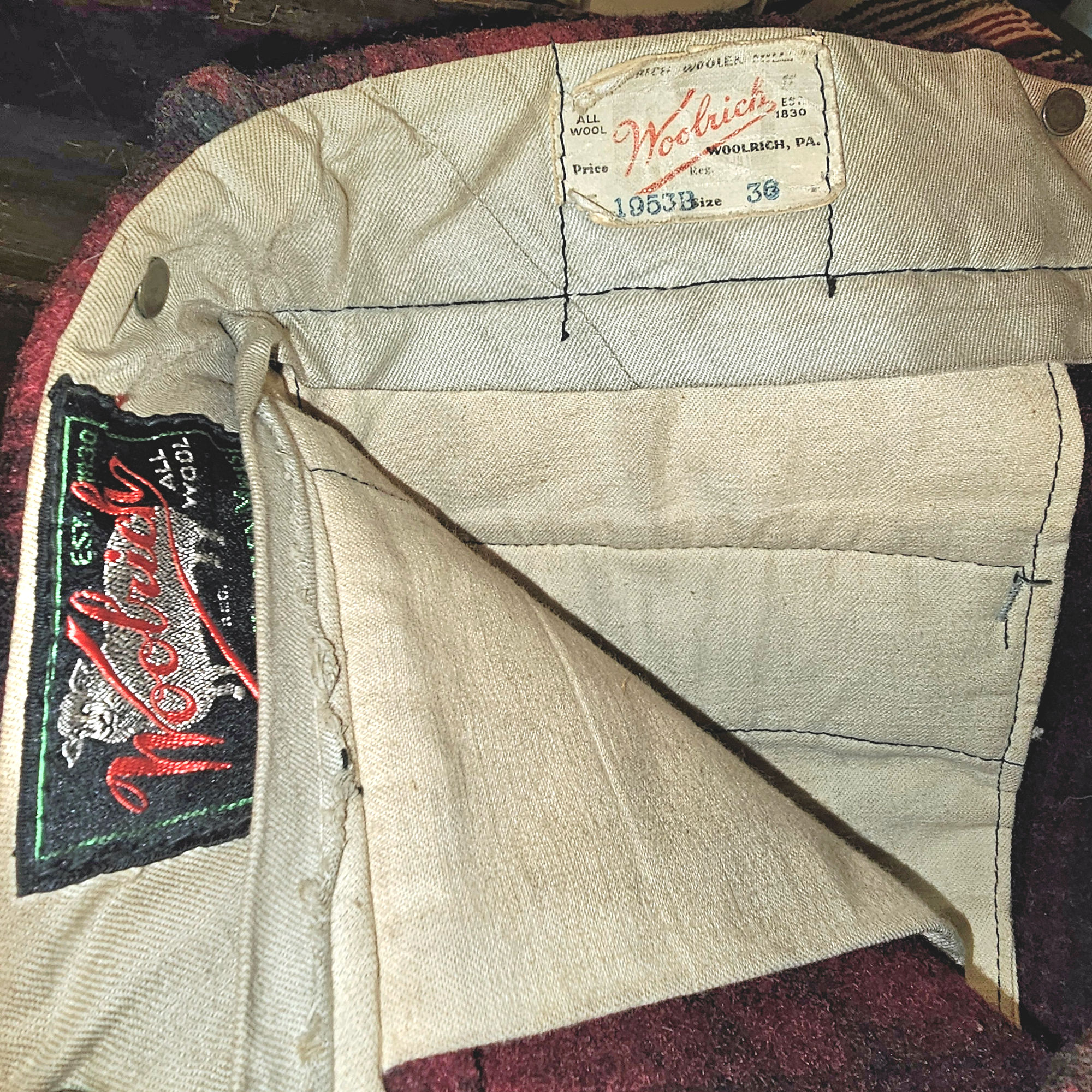 Rare to find a whole outfit, the pants are in extremely nice shape as well. Very attractive with a lace-up feature at bottom of legs. Both jacket and pants have original Woolrich labels and show the sizes at 38. I believe L or XL.