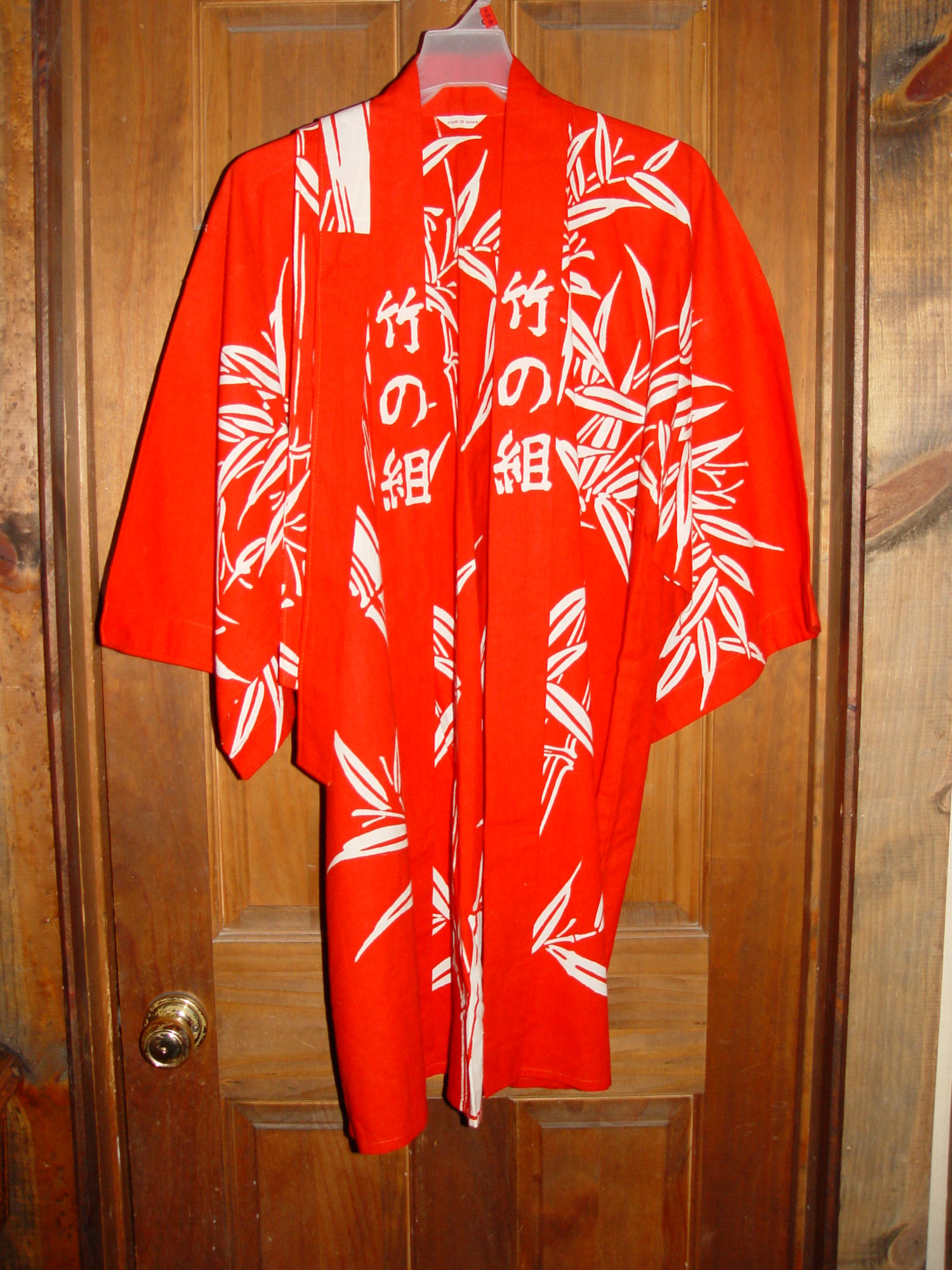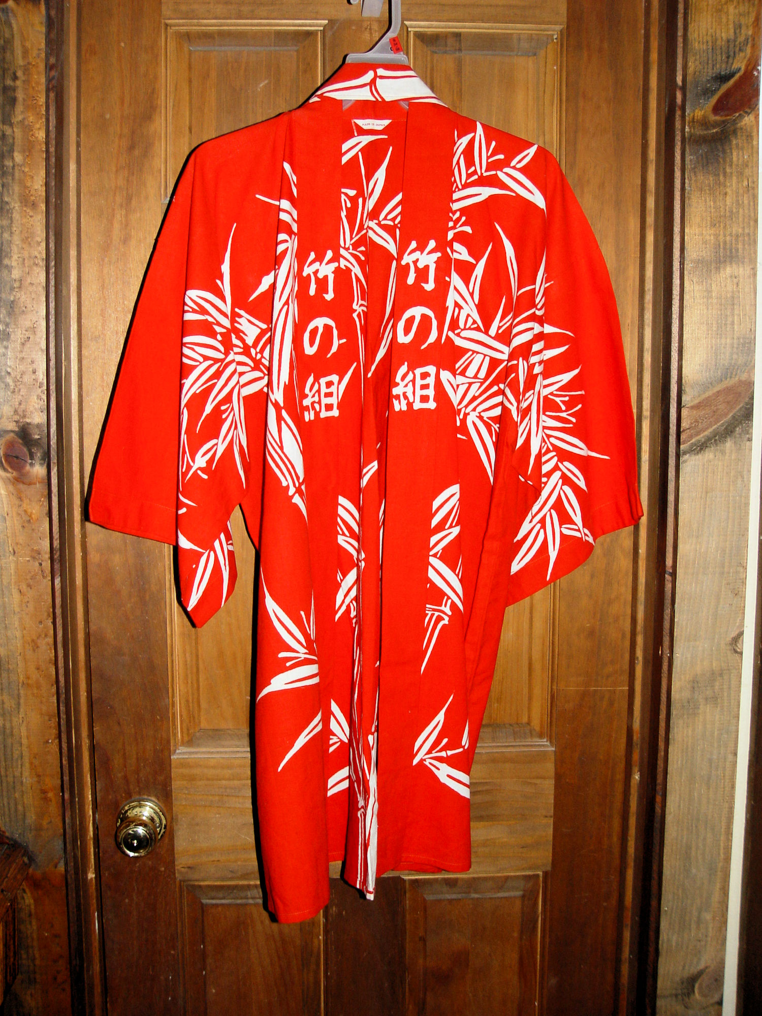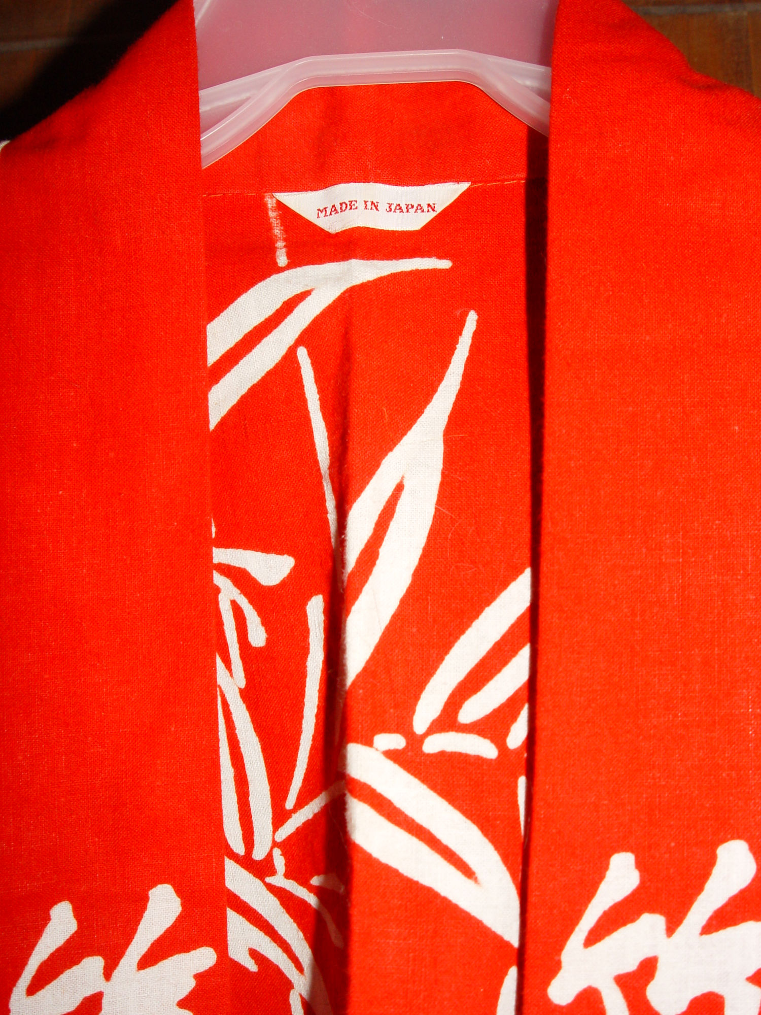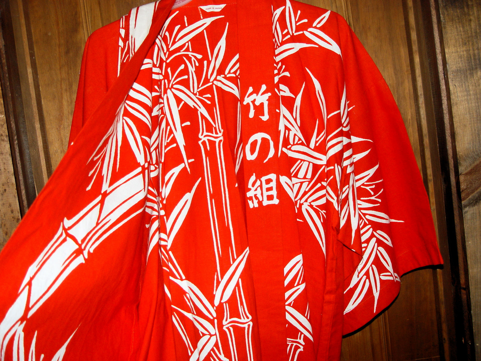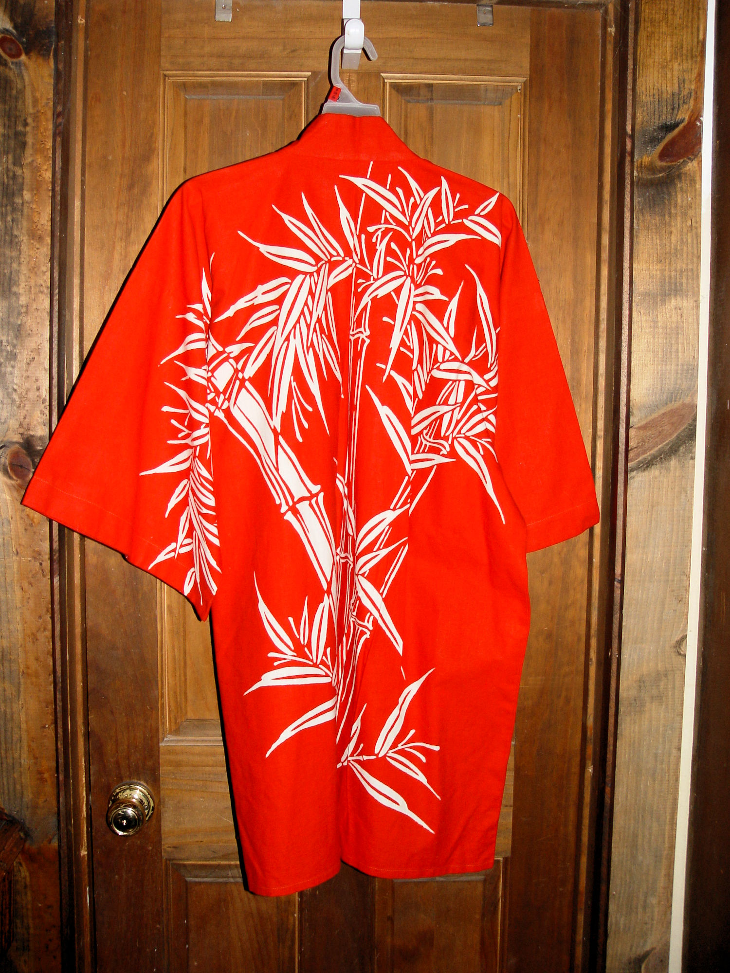Very attractive Kimono I believe is from the 1970s, early 1980s. Striking hand printed red and white batik fabric. This was found in a collection with many unique clothing pieces. Looks never worn, brand new. The label reads Made in Japan.