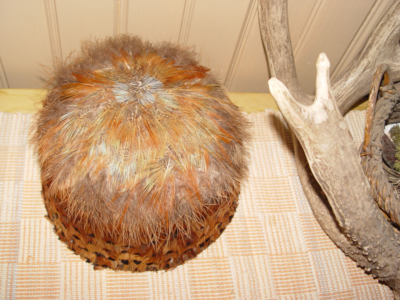 around. 4.25" tall. Very good condition. Feathers look