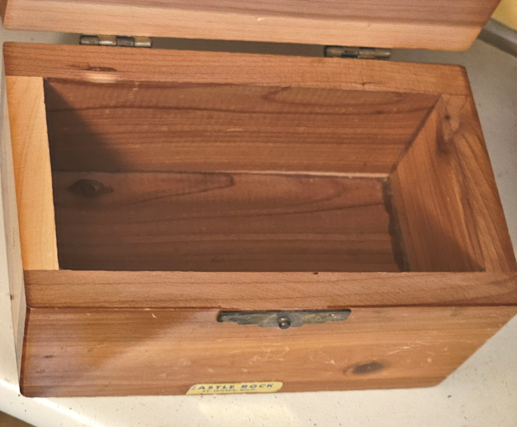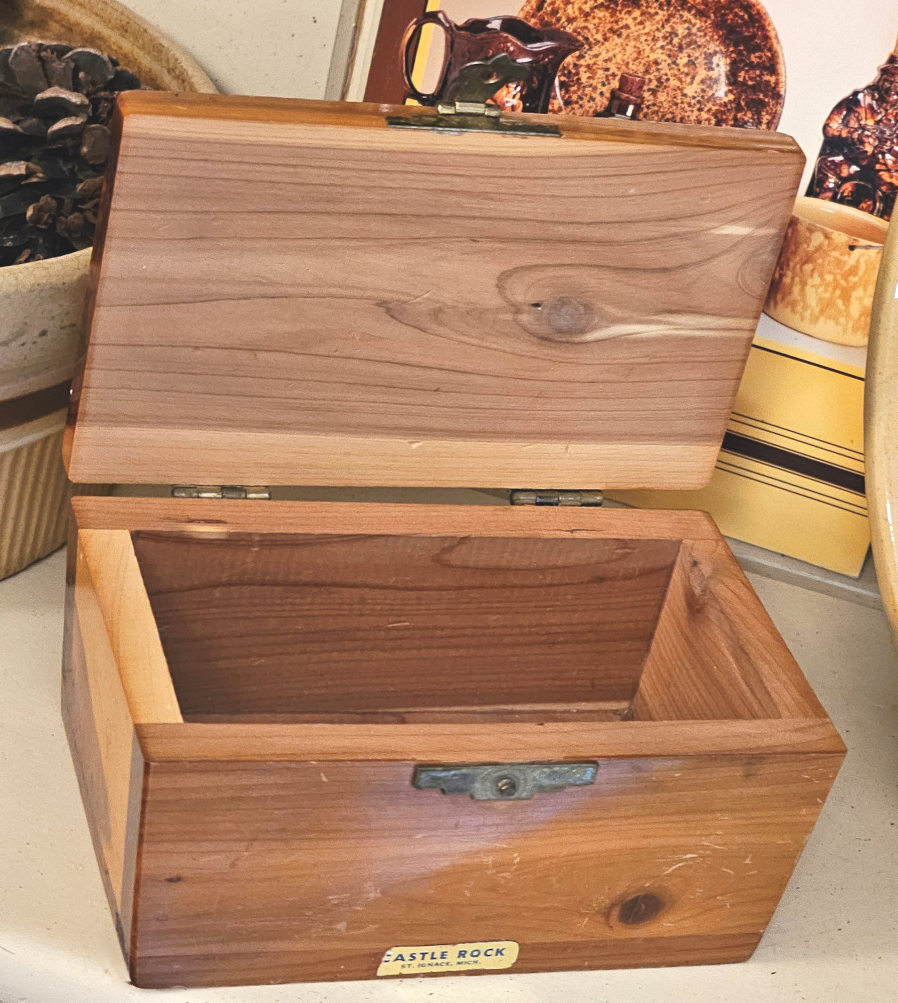 In the mid-century, you could always find some souvenir made from cedar while you were traveling. This cutie is showing Castle Rock, Mich. It is the oldest lookout point near St. Ignace, Michigan...known as "Pontiac's Lookout" by the Ojibwa Tribe. All made from cedar wood, looks like a small chest. Working hinges and latch. Small sticker with town name still on the front lower edge.