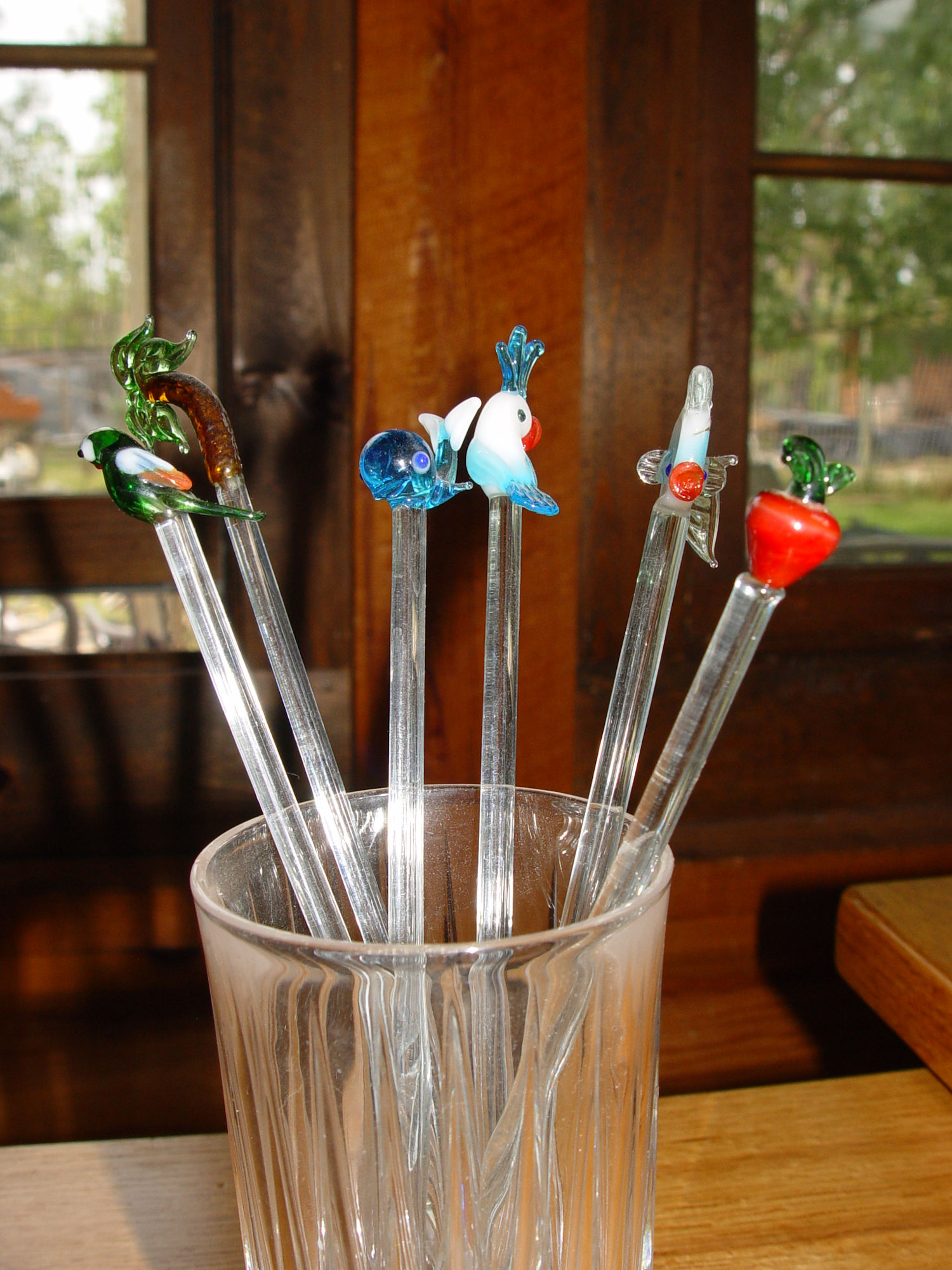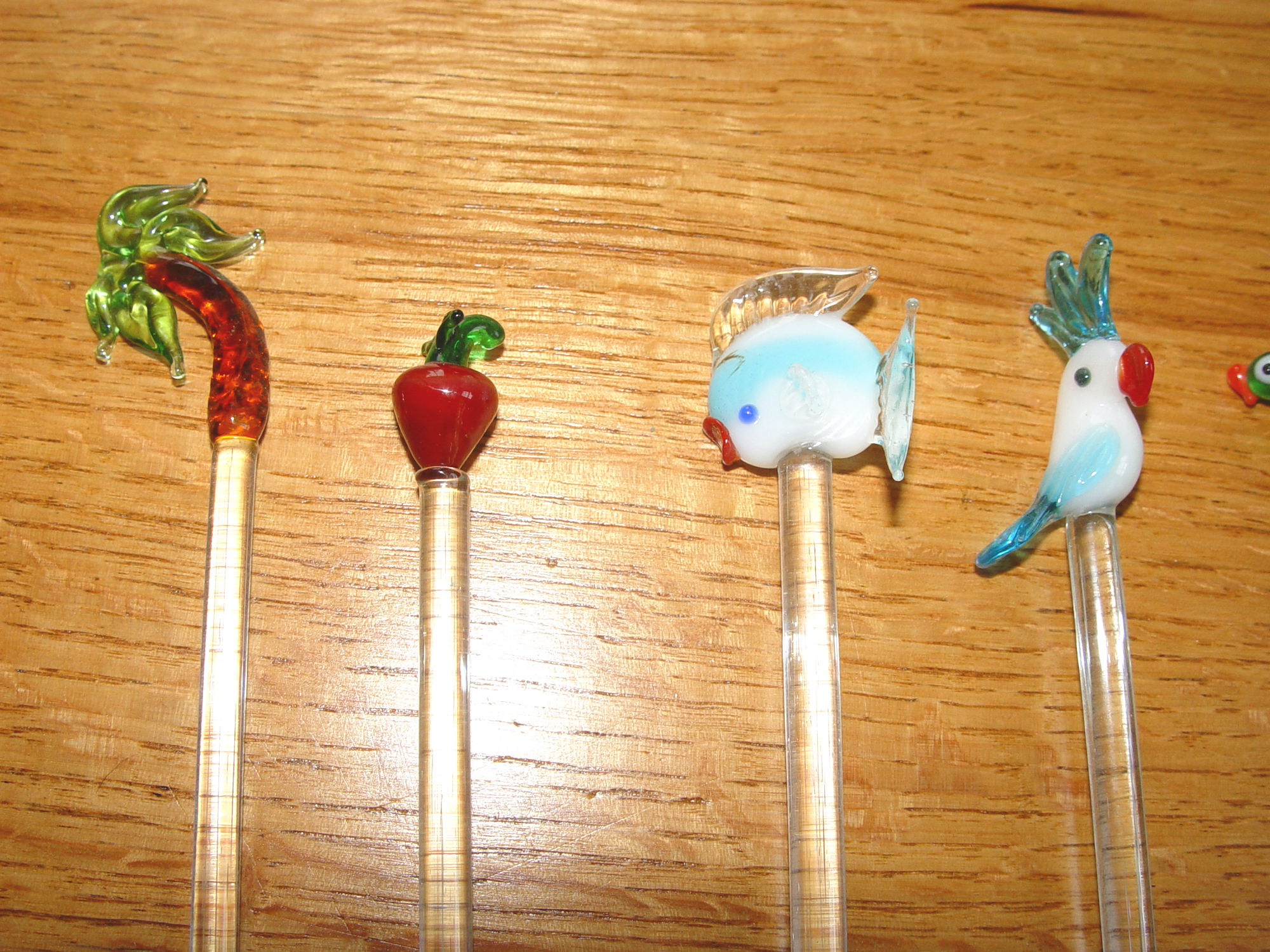 Six delightful glass-blown swizzle sticks—each one a tiny work of art perfect for happy hour. Your guests will light up and have a fun conversation with one of these pretty piece's placed in their drinks. All show vibrant examples of the tropics. One is an apple, he's along for the ride!