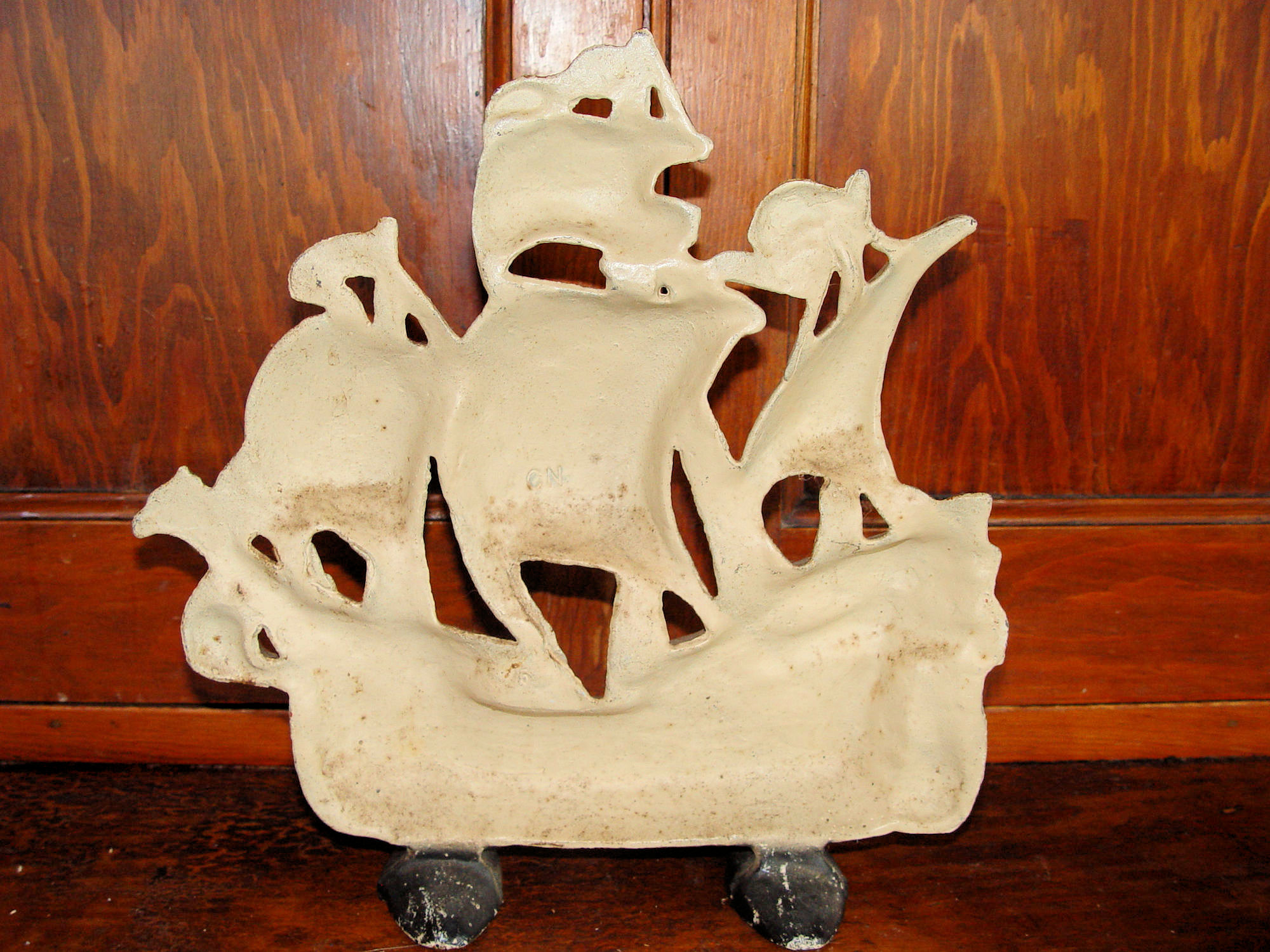 A neat early, heavy cast iron sculptured doorstop in the shape of a Galleon sailing ship. Believed to be made by the Creation Co. This is a unique ship with a bird figurehead. It is showing its attractive original painted finish.