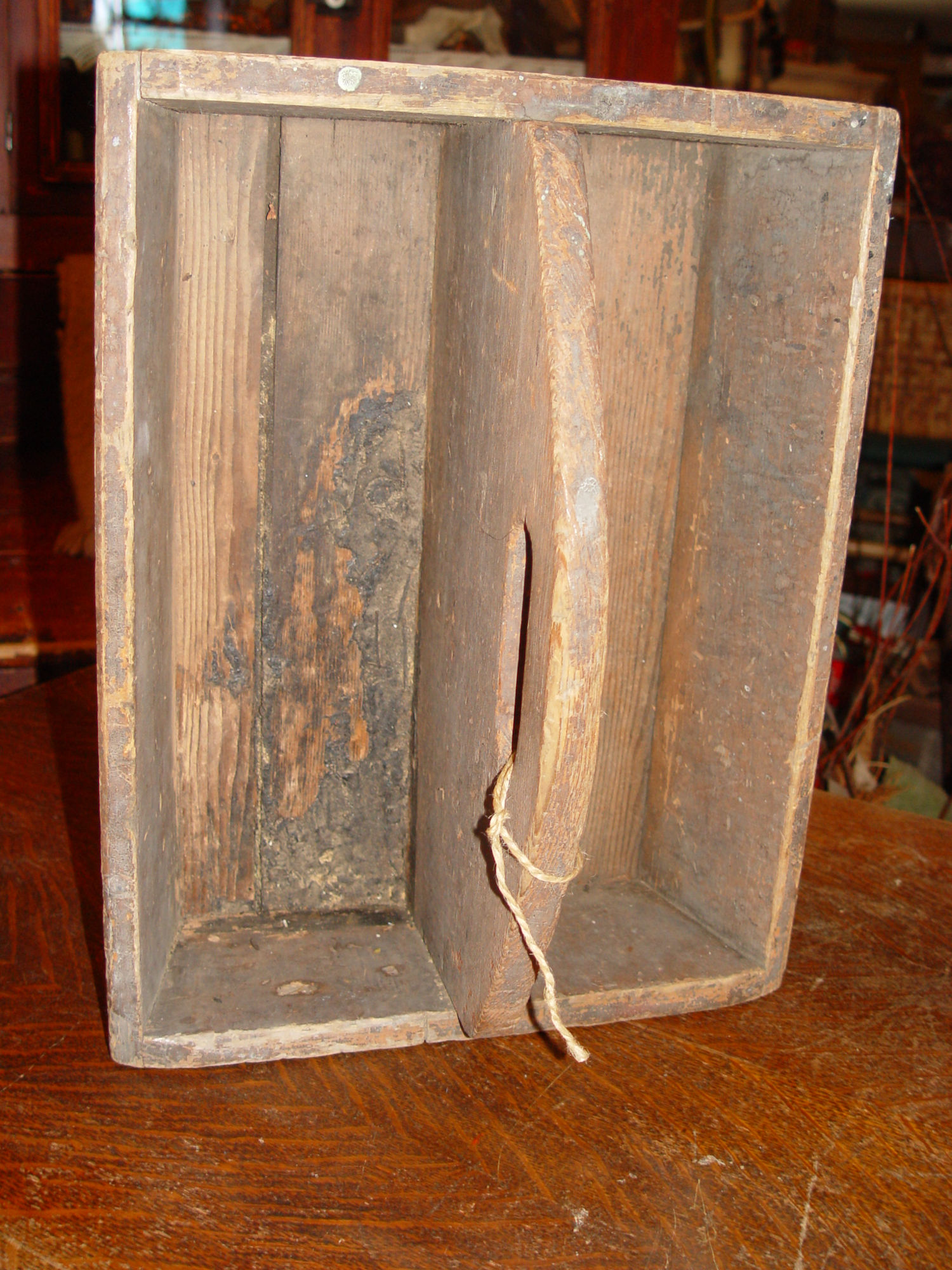 A terrific farm tool that helped carry many items. It's size warranted that nothing would fall out. This carrier box shows old dusty red paint and a center carrying handle. A great piece for the center display on your table filled with fruit or for a porch stuffed with seasonal color. In nice vintage condition. Does have typical usage & wear marks throughout. Note the black tar like substance inside...it is very old and hard and you could either try to remove or leave it as is...a conversation piece.