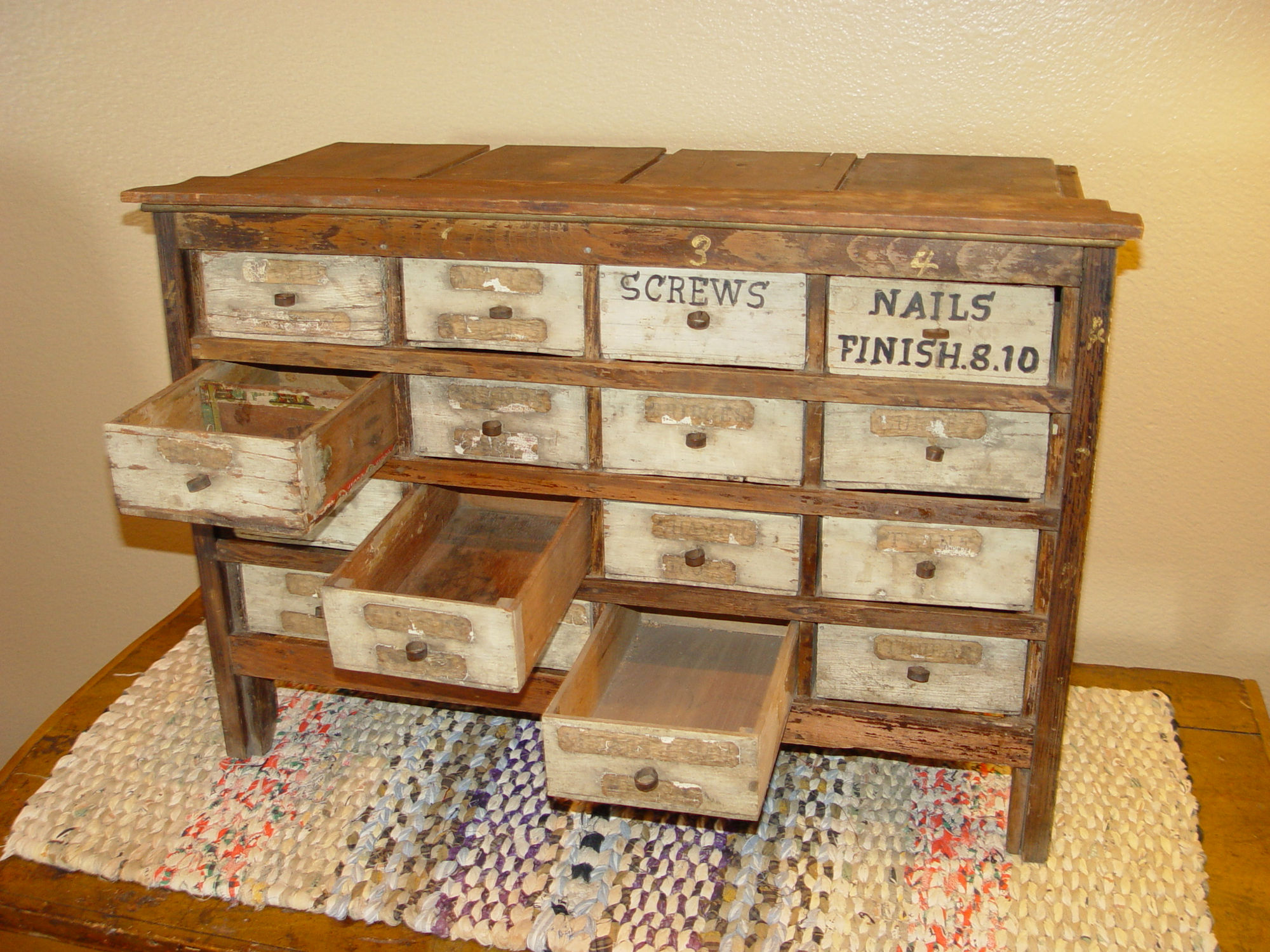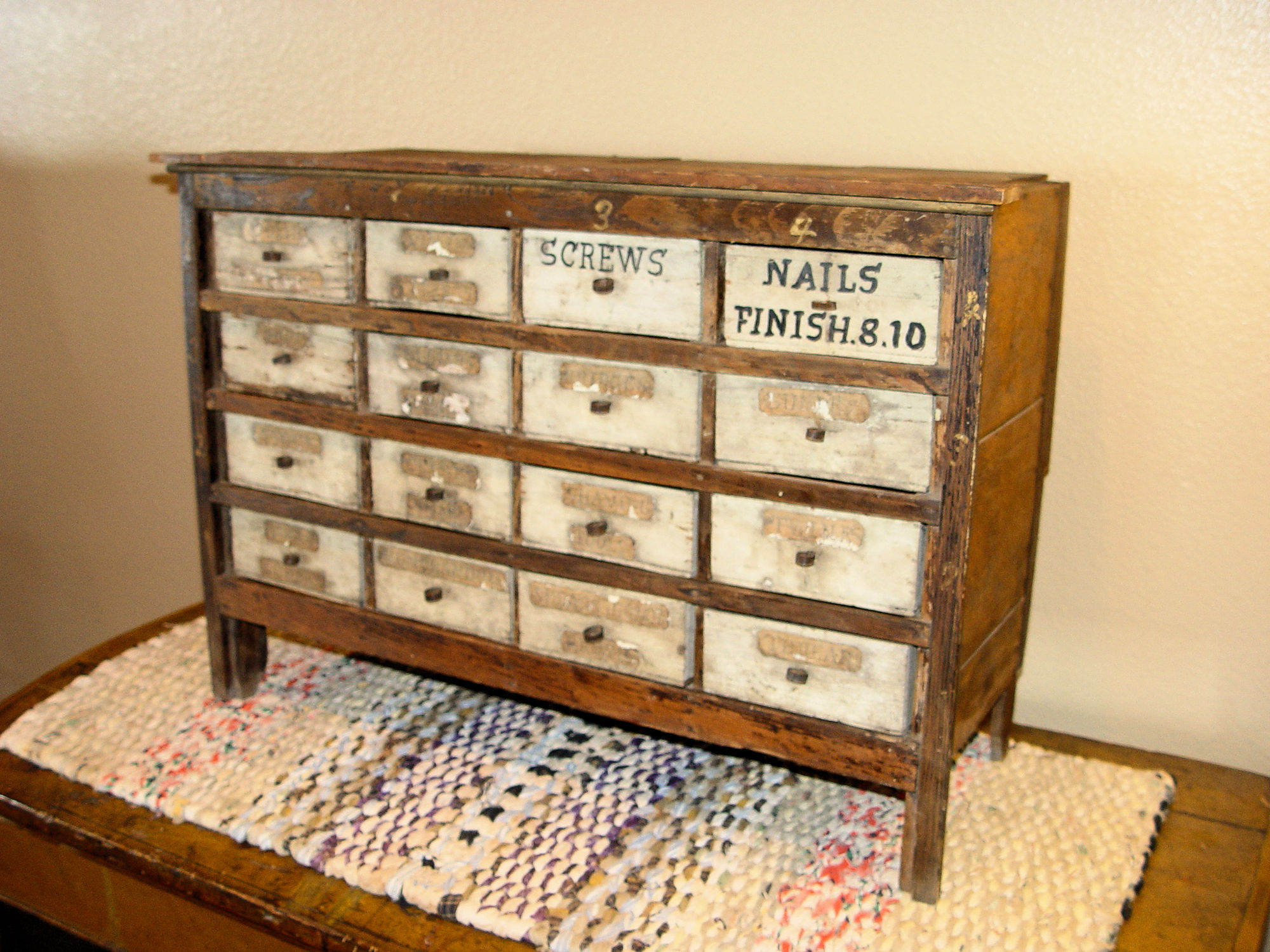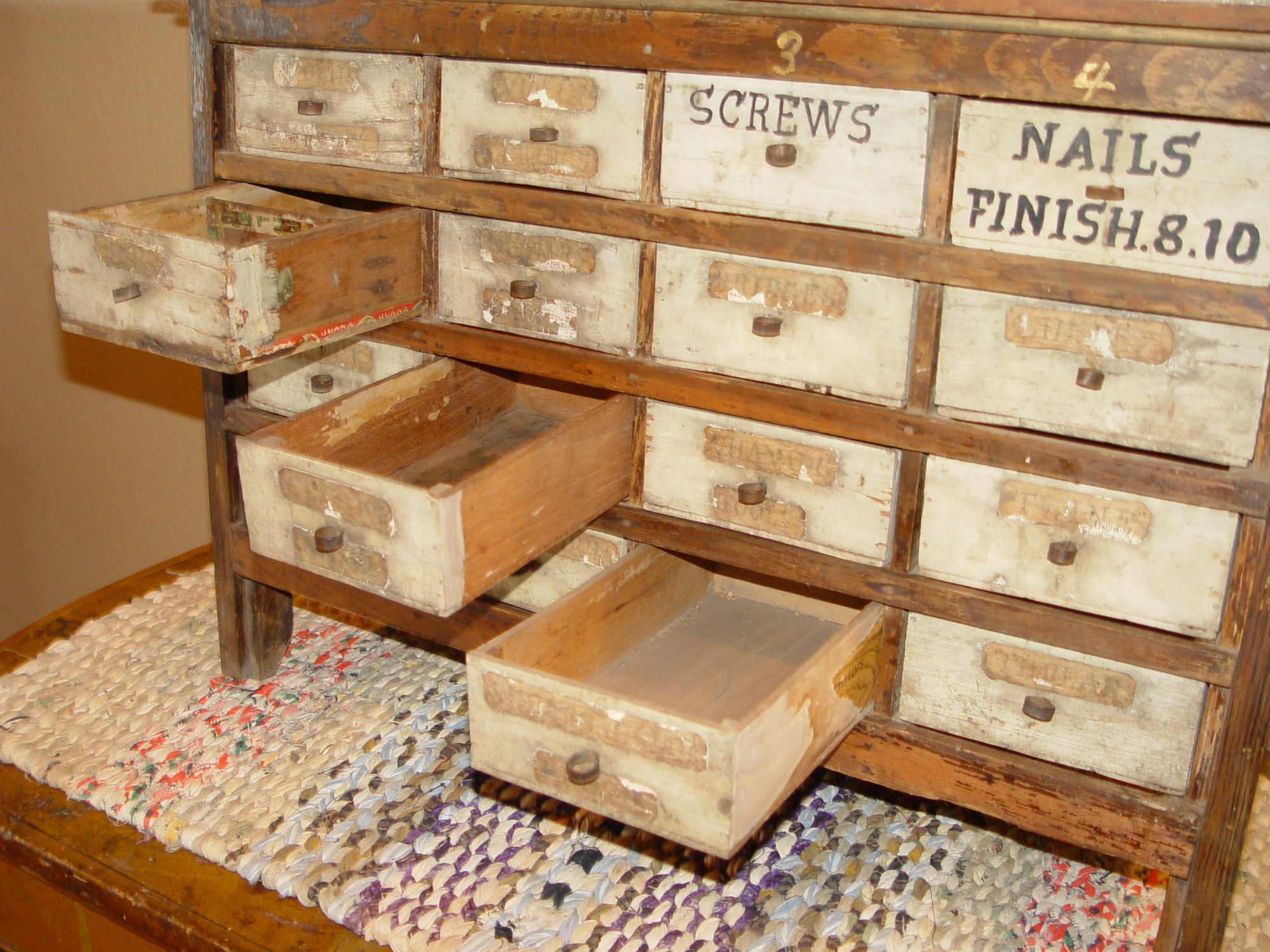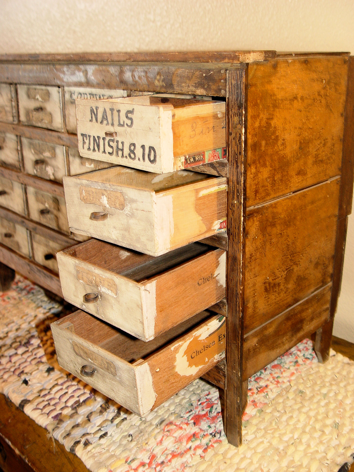 Perfect addition to the folk art or tramp art collection or unique home decor in a kitchen, sewing room or industrial setting. This held items such as nails, screws -- paper labels state Shaving Tools, Stock, Sundries, Bridges, Violin strings, thread and more. The cabinet is nicely proportioned has retained a very nice patina over the years. All drawers slide easily in and out. Desirable country primitive.