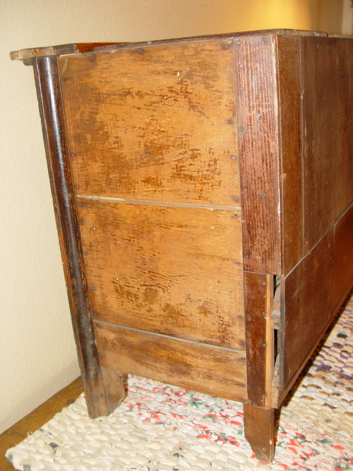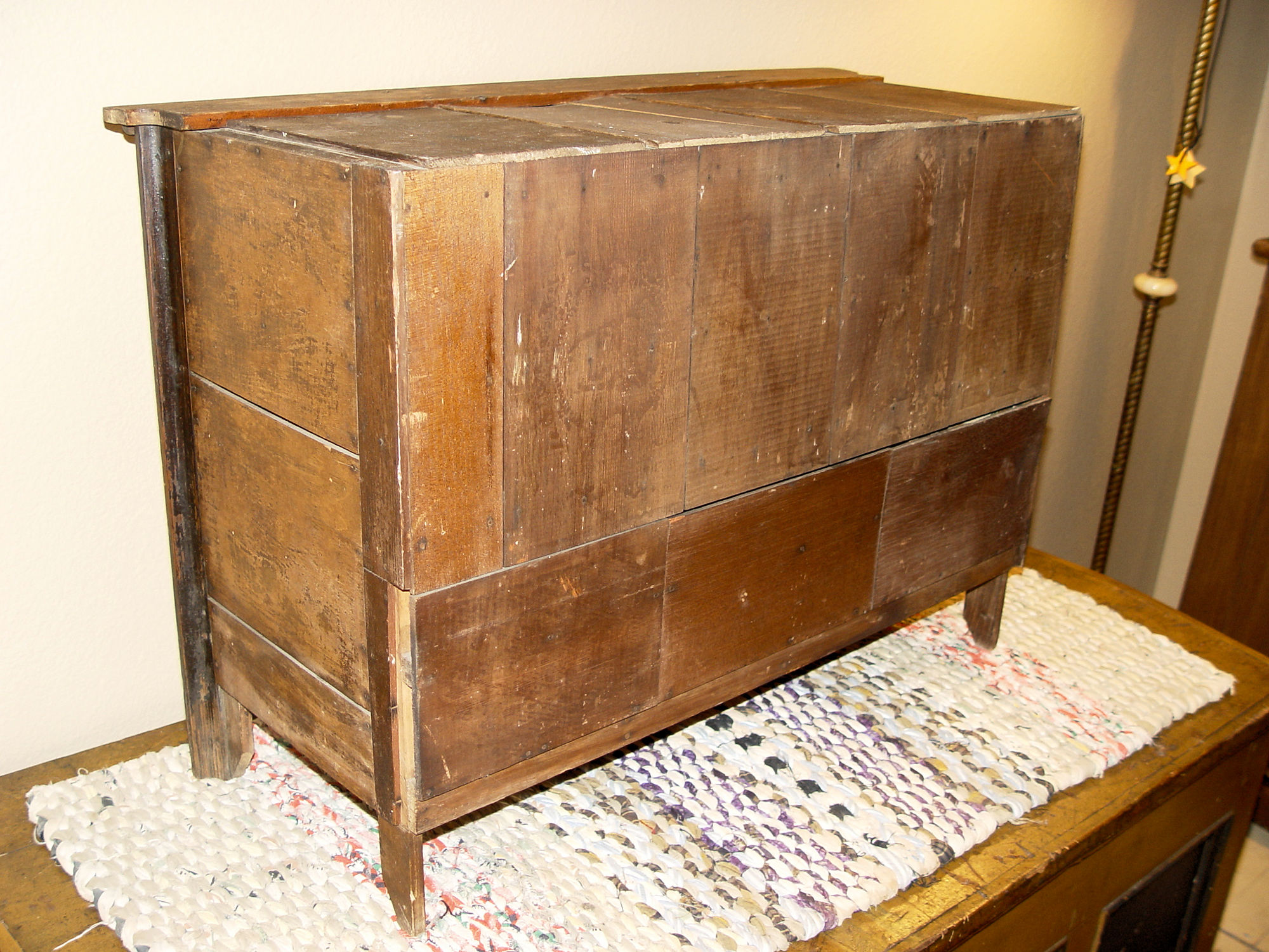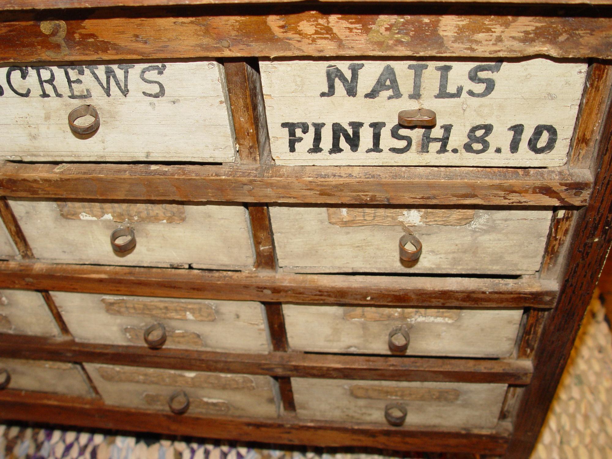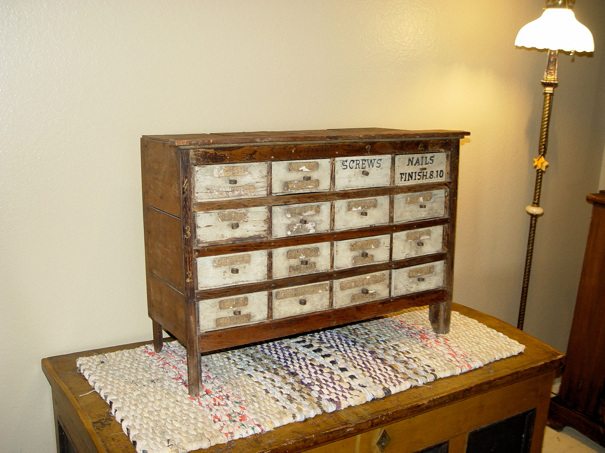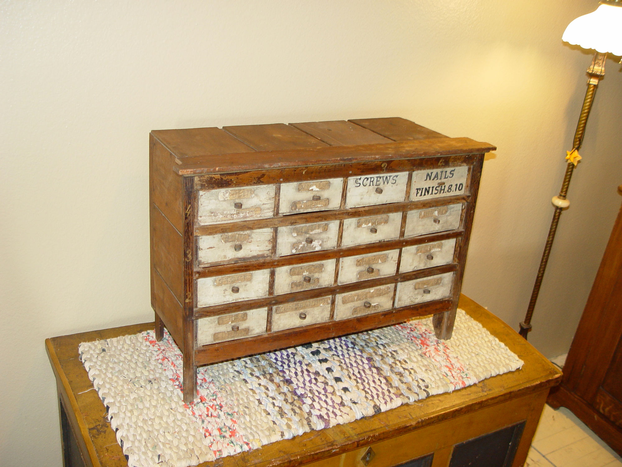 Perfect addition to the folk art or tramp art collection or unique home decor in a kitchen, sewing room or industrial setting. This held items such as nails, screws -- paper labels state Shaving Tools, Stock, Sundries, Bridges, Violin strings, thread and more. The cabinet is nicely proportioned has retained a very nice patina over the years. All drawers slide easily in and out. Desirable country primitive.