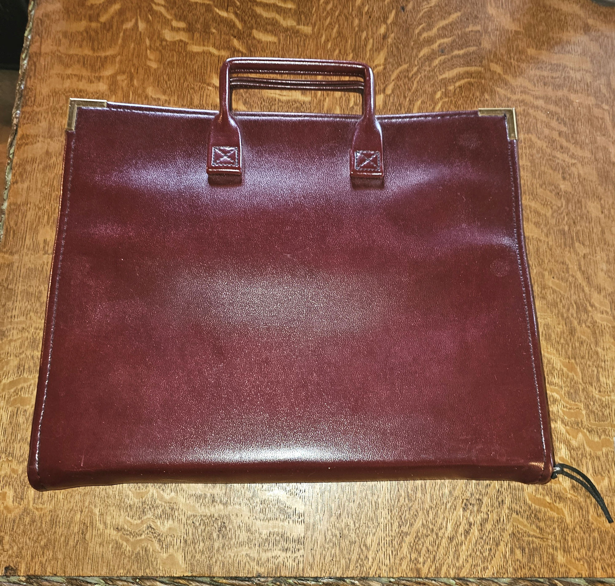 Vintage Hazel briefcase in burgundy leather dark red, very attractive. Believed to be from the mid 1970's. Pre-owned in very good vintage condition. No rips, tears or stains. Has not been used in a long while and the zipper, although works well, it is a bit stiff. Just needs to be used again. Minor wear, but hard to find blemishes. Zipper encloses 2 interior storage areas with pockets. Hard plastic divider for binder. Retractable padded handles on top of bag.