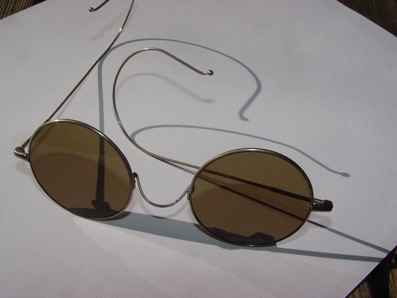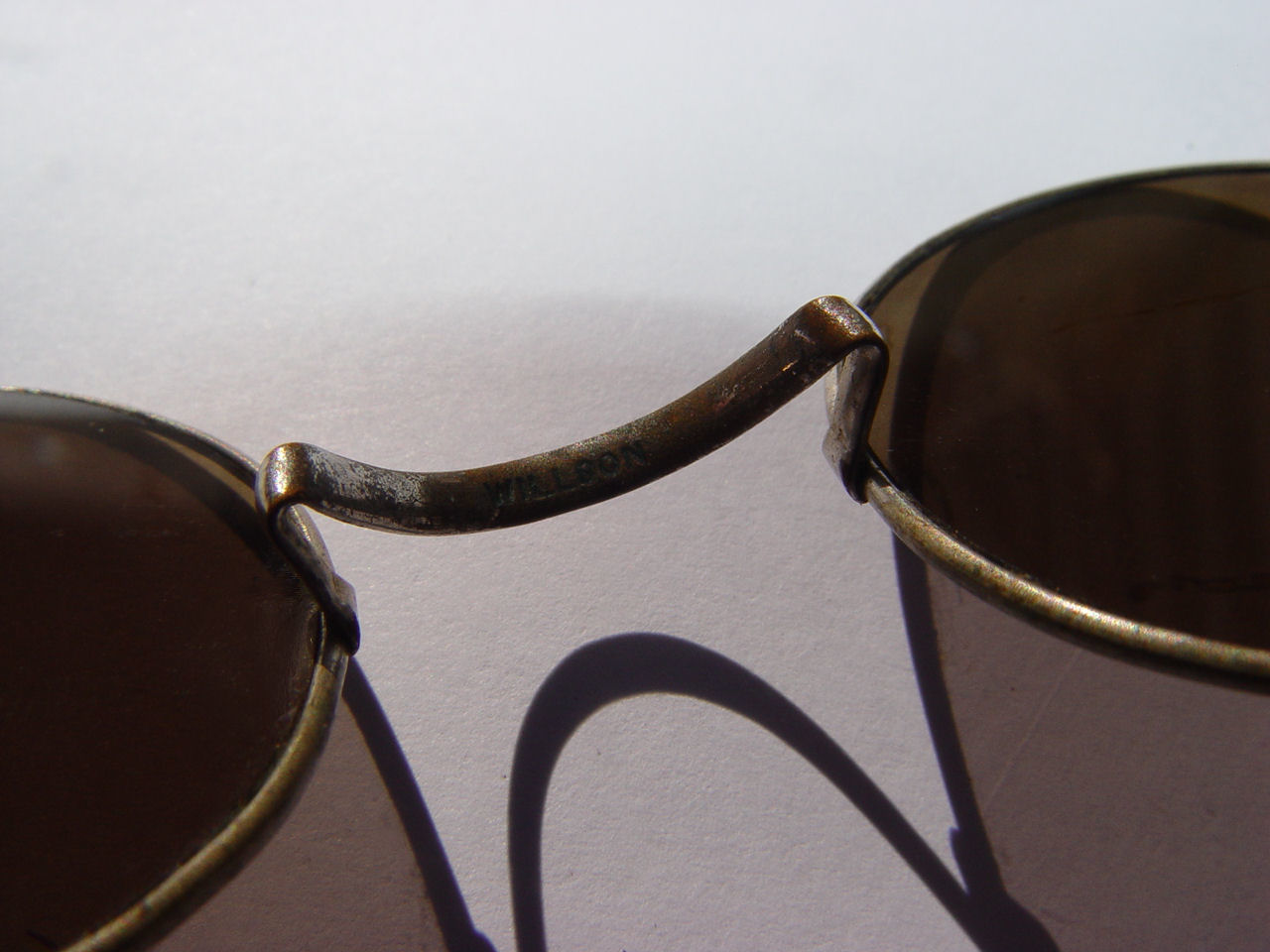 These are very nice, one of a kind, hard to find sun glasses from the 1920's. They appear to be non rx lenses and are a pretty subtle green. Very fine brass frame with twisted adjustable coil cables. Saddle bridge with the name Willson.