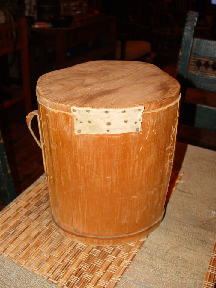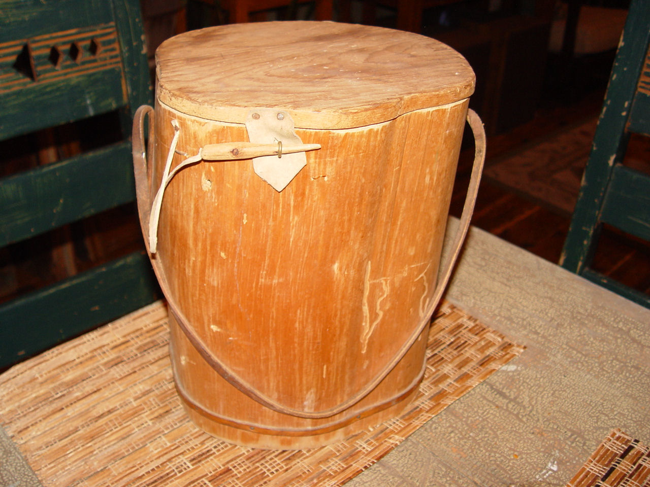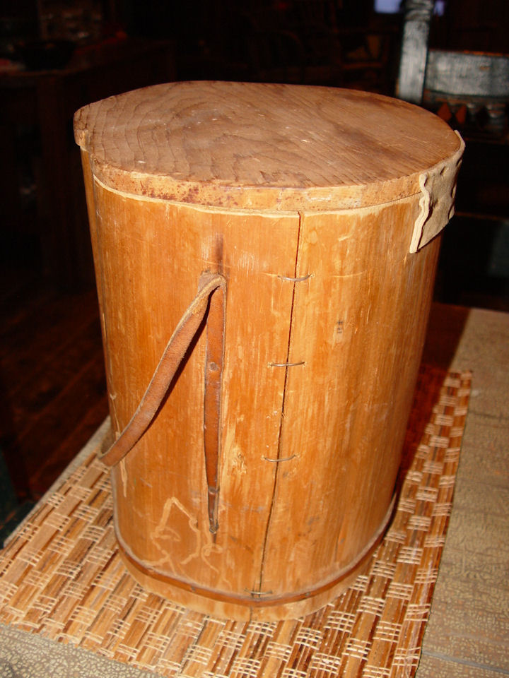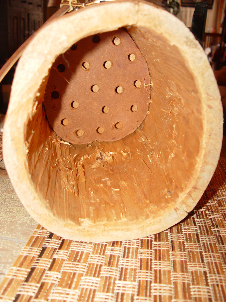 Fun conversation piece. The lid shows a leather attached tie down. Also a strap to carry the piece around if wanted. Take note that the piece has no bottom, so the tools and items carried hung through to the depth of the piece.