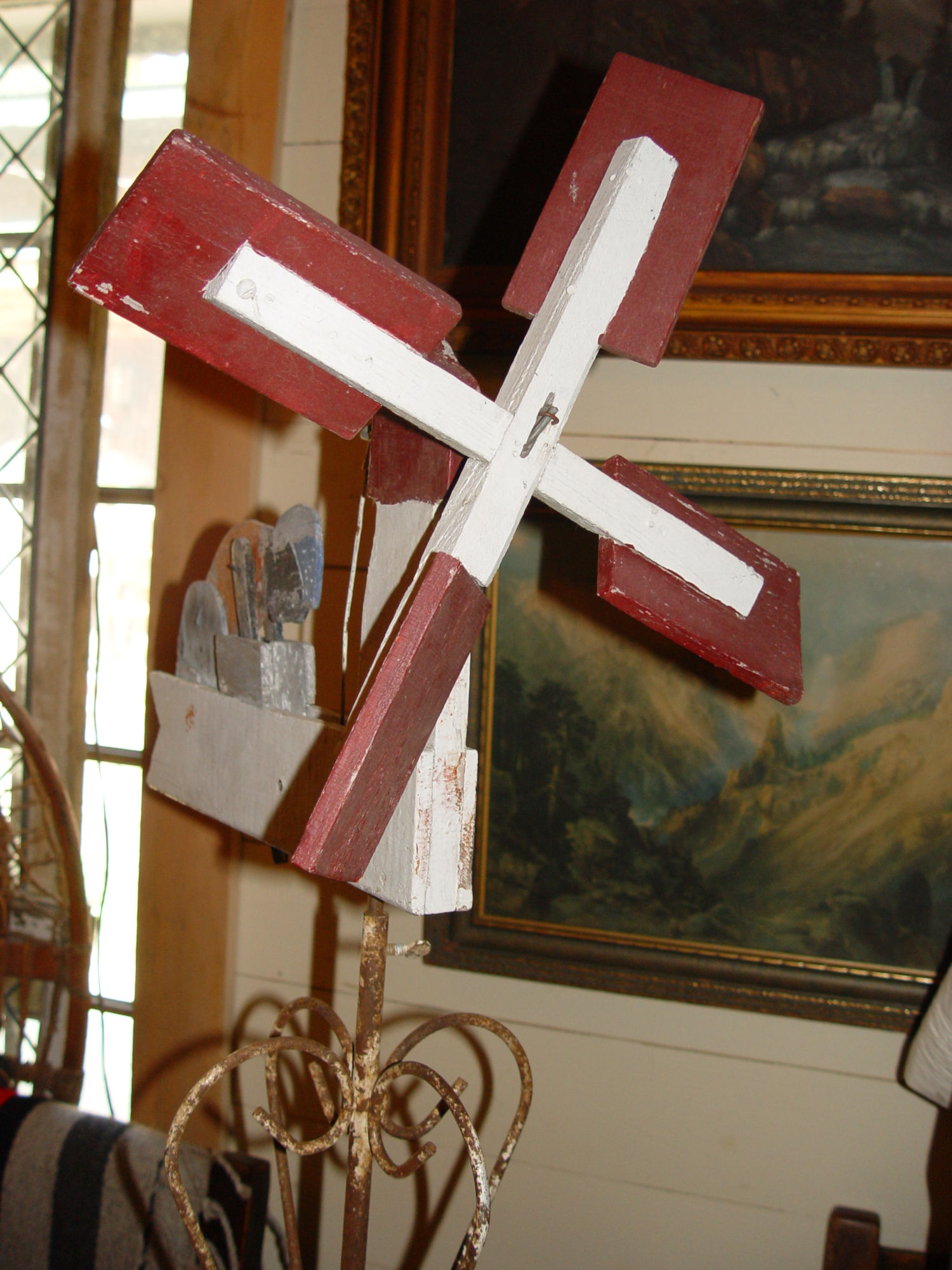 African American mammy dressed figure churning butter I believe, or perhaps washing clothes. Not sure. Functions as it should when the wind blows the propeller. A nearby red roofed farm building adds to the charm.