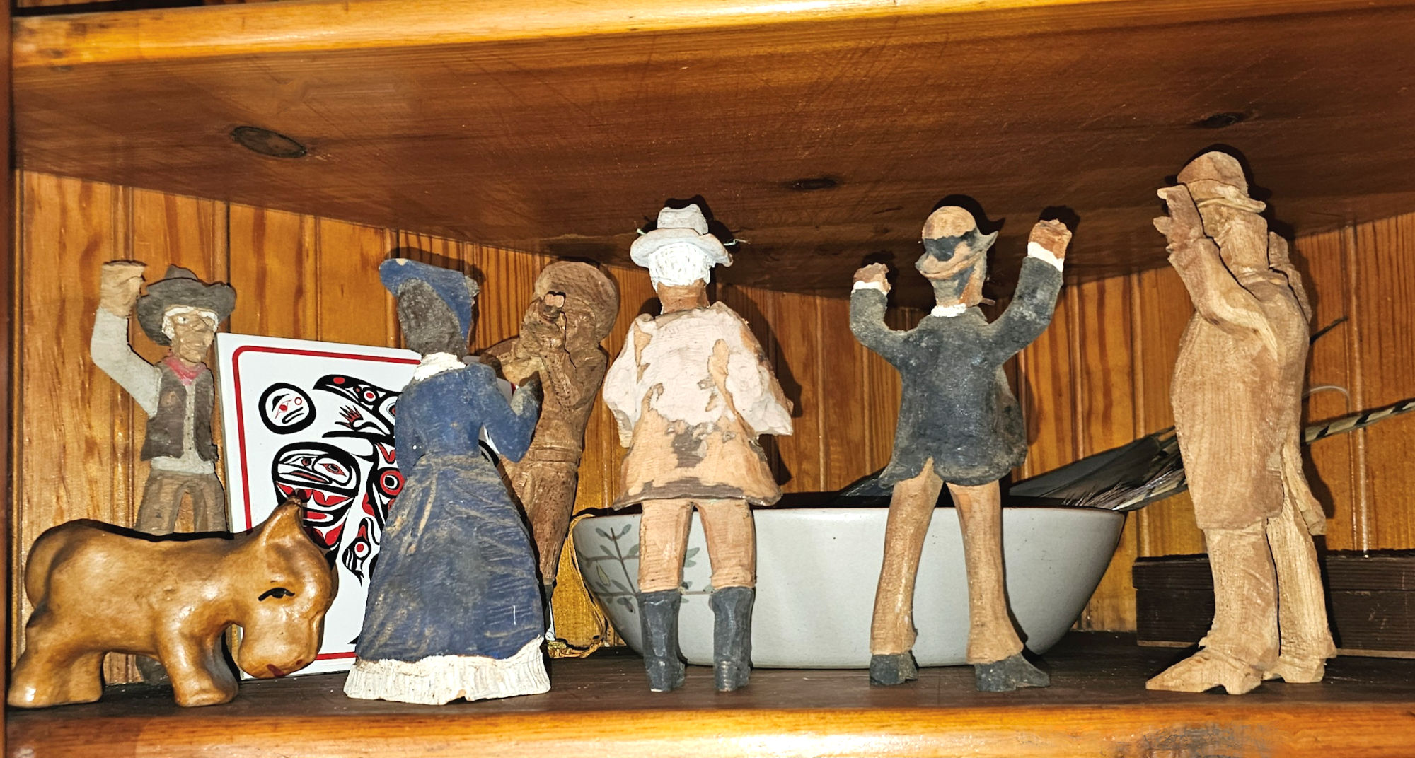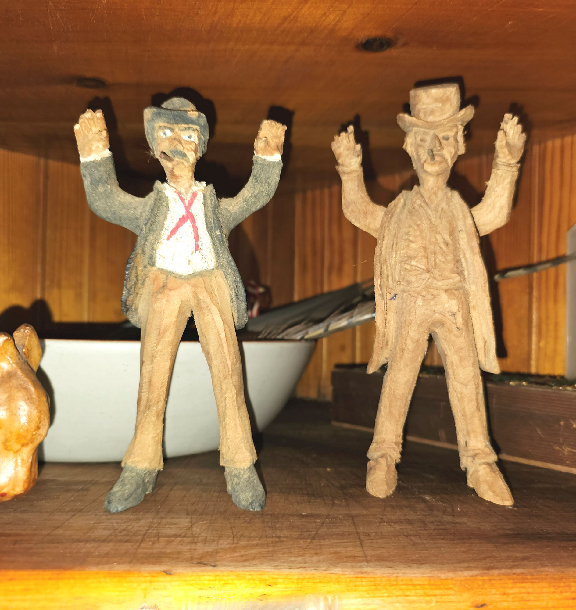 Charming early 20th century American hand-carved old west figures. Guessing 1930s - 40s. Six in all. The carver was spot on with their expressions though somewhat crude. A robber pointing a rifle, the businessman, the gambler, an old miner, the cowboy and the lady. They are naive and creative. Great conversation pieces. If you love the old west or just want a super display, these are for you.