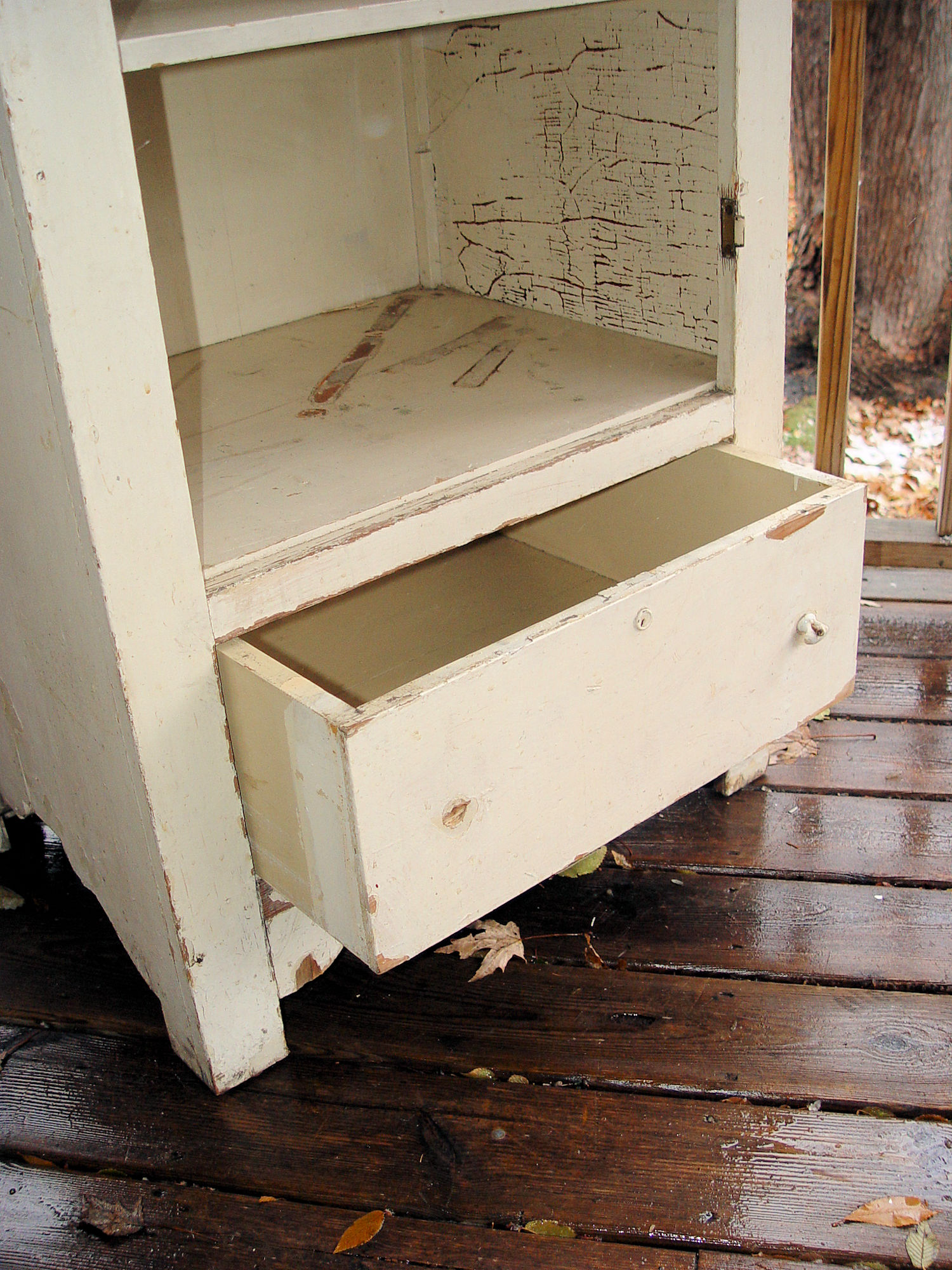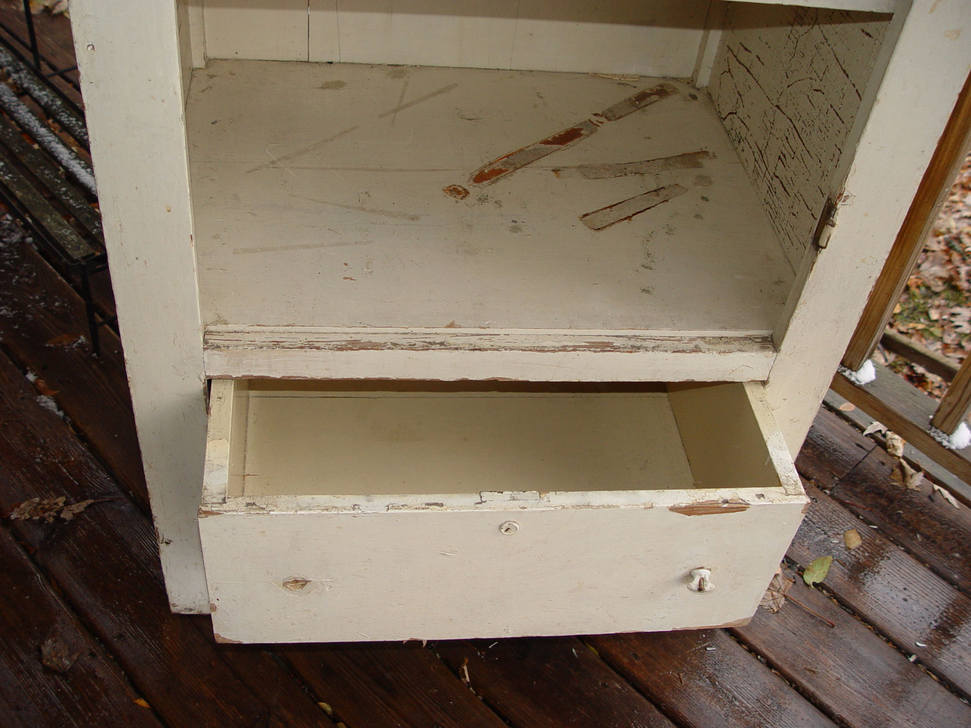 Knobs are broken and missing on the drawer, easy fix. The original door has been gone long before our purchase, hinges still there. A small chip, upper drawer edge, needs glued back in place, see photos.