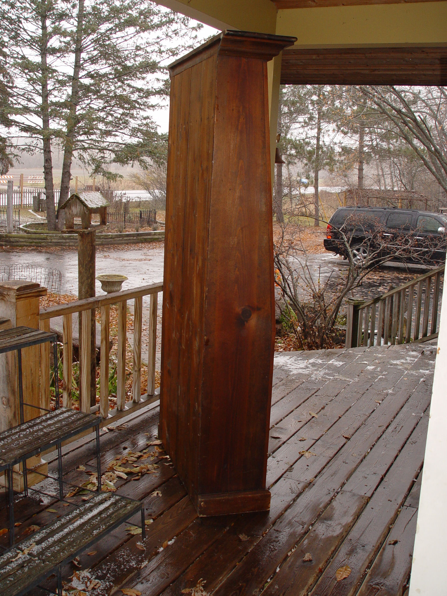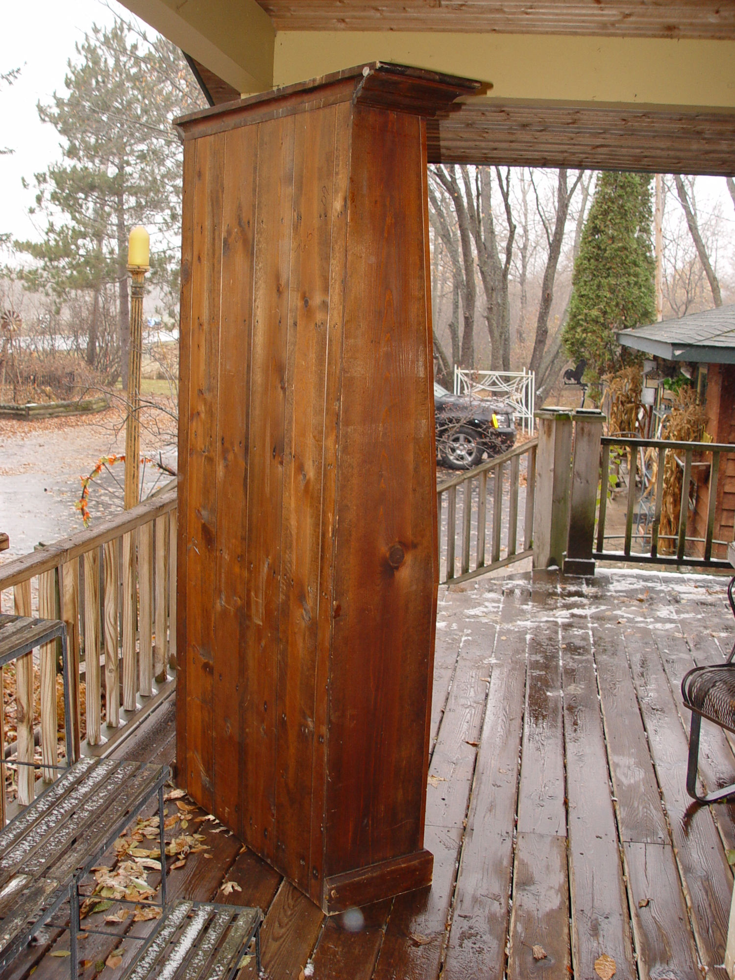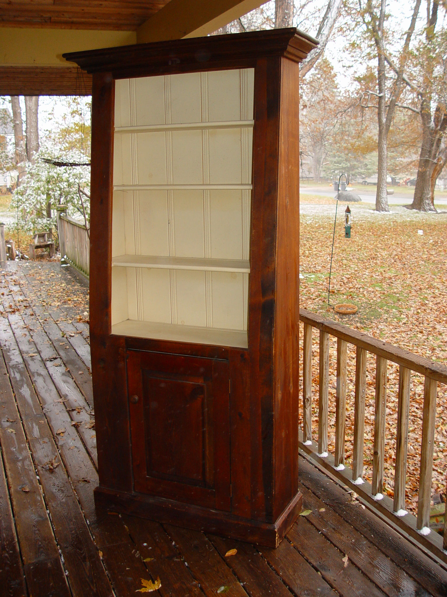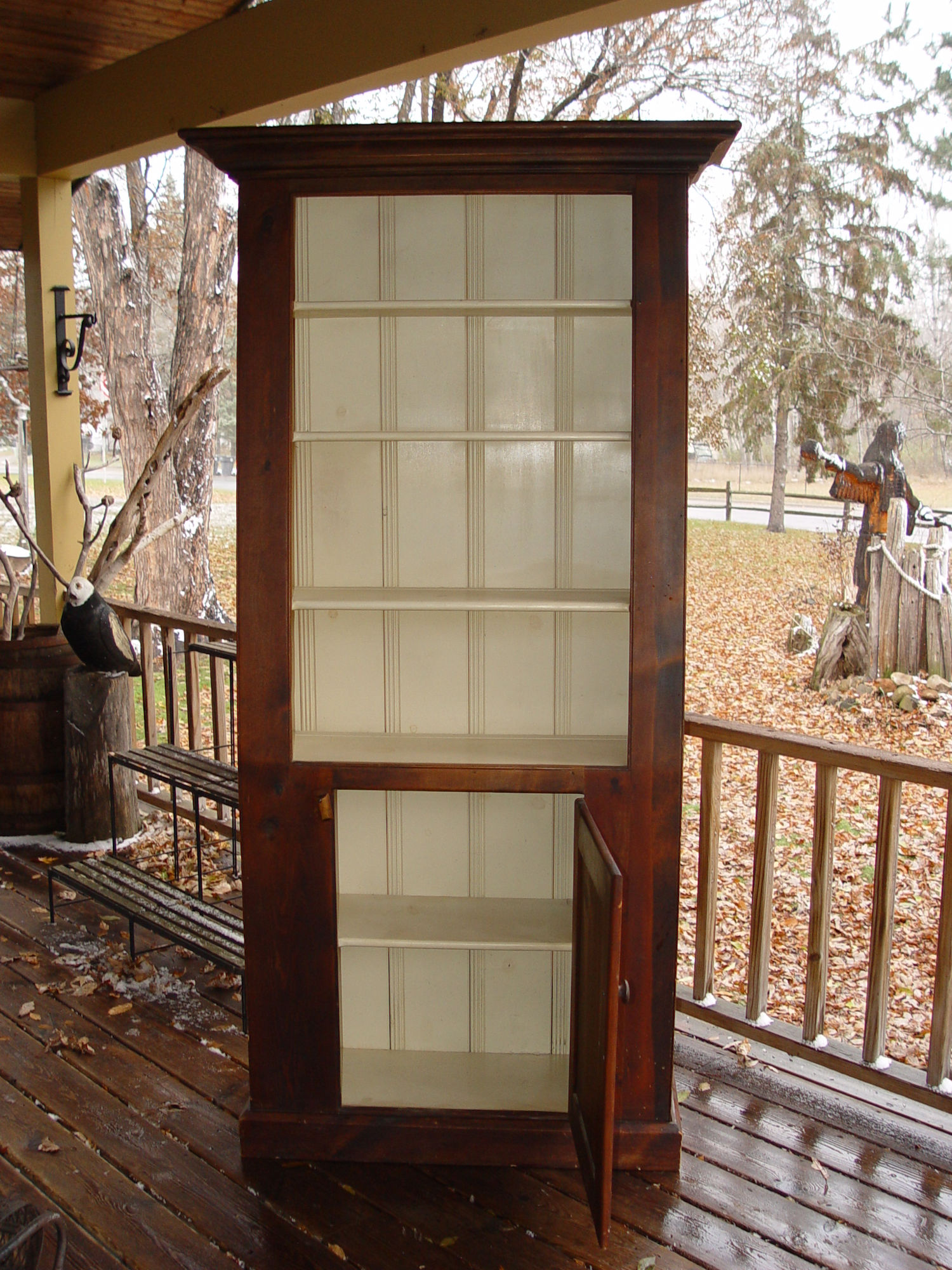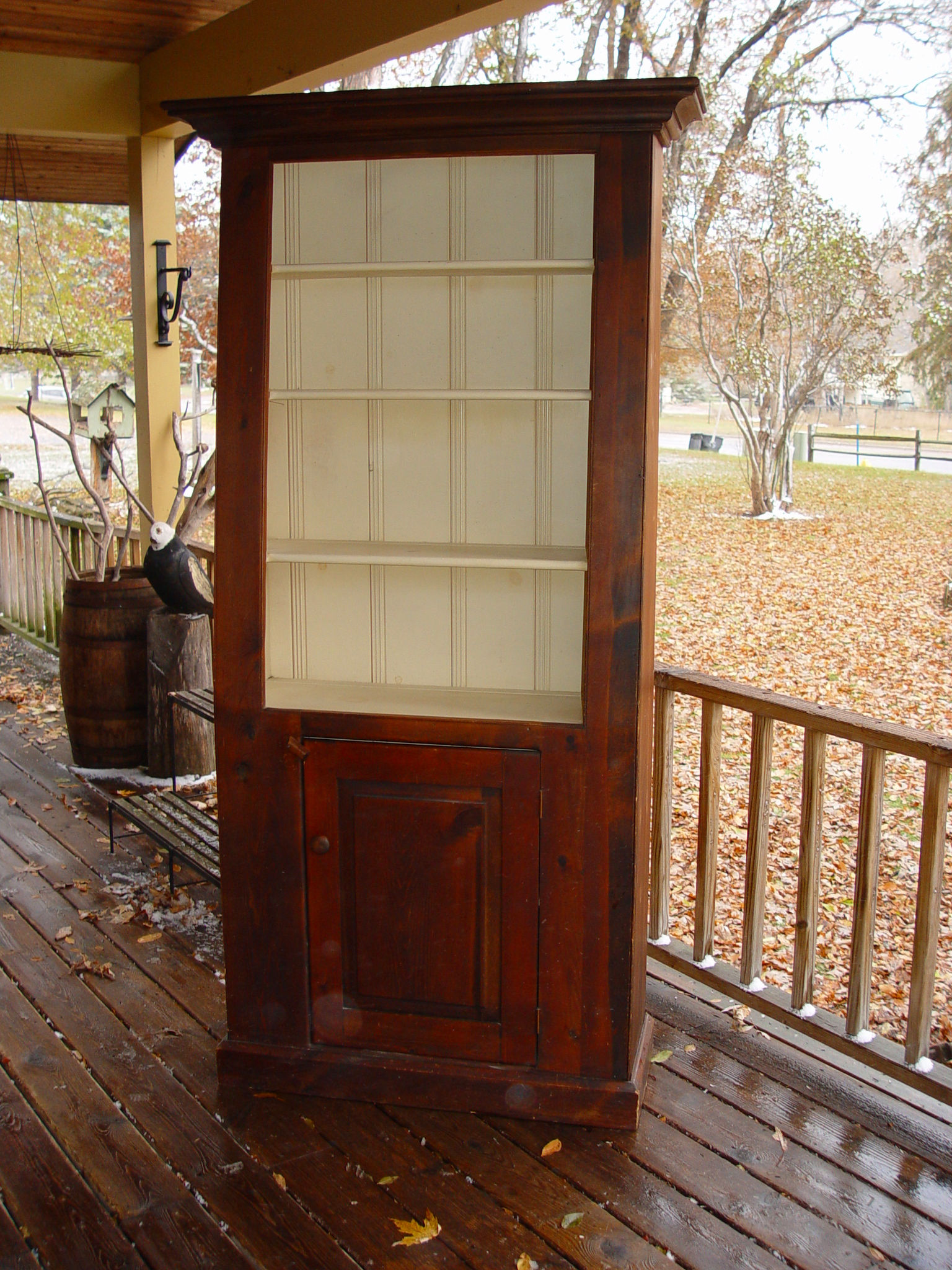 Great size and great display. Open top with 3 sturdy shelves and door on the bottom. Perfect for displaying your primitive, antique or art collectibles. Believe to date to about 1930s. The canted section which gracefully leans starting at the top of the door section. These are rare and hard to find in this early form. A primitive pine chimney sized cupboard, that in it's early life was refinished to a nutmeg or honey brown finish.