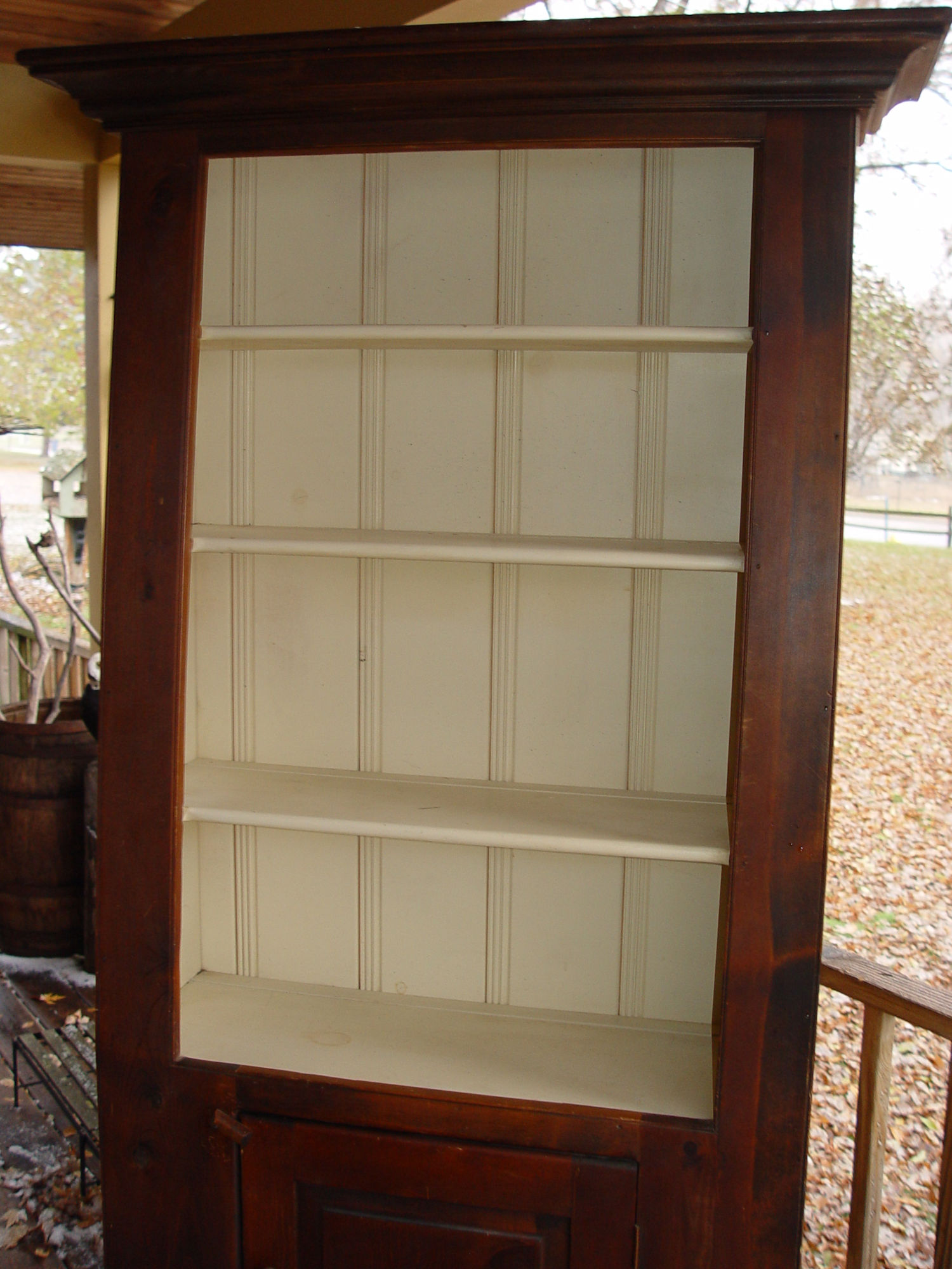 Three graduated shelves in the open, cream painted top area. The bottom has a central door with one shelf behind. Door is held shut with a wooden turn latch. The door has a raised central panel. The interior has been painted the same cream color. Really pops with the exterior finish. The cupboard has apron-ed base. The rear of the cupboard is composed of a decorative 6" ship-lap with three very distinct beads. This cupboard is solid and sturdy.
