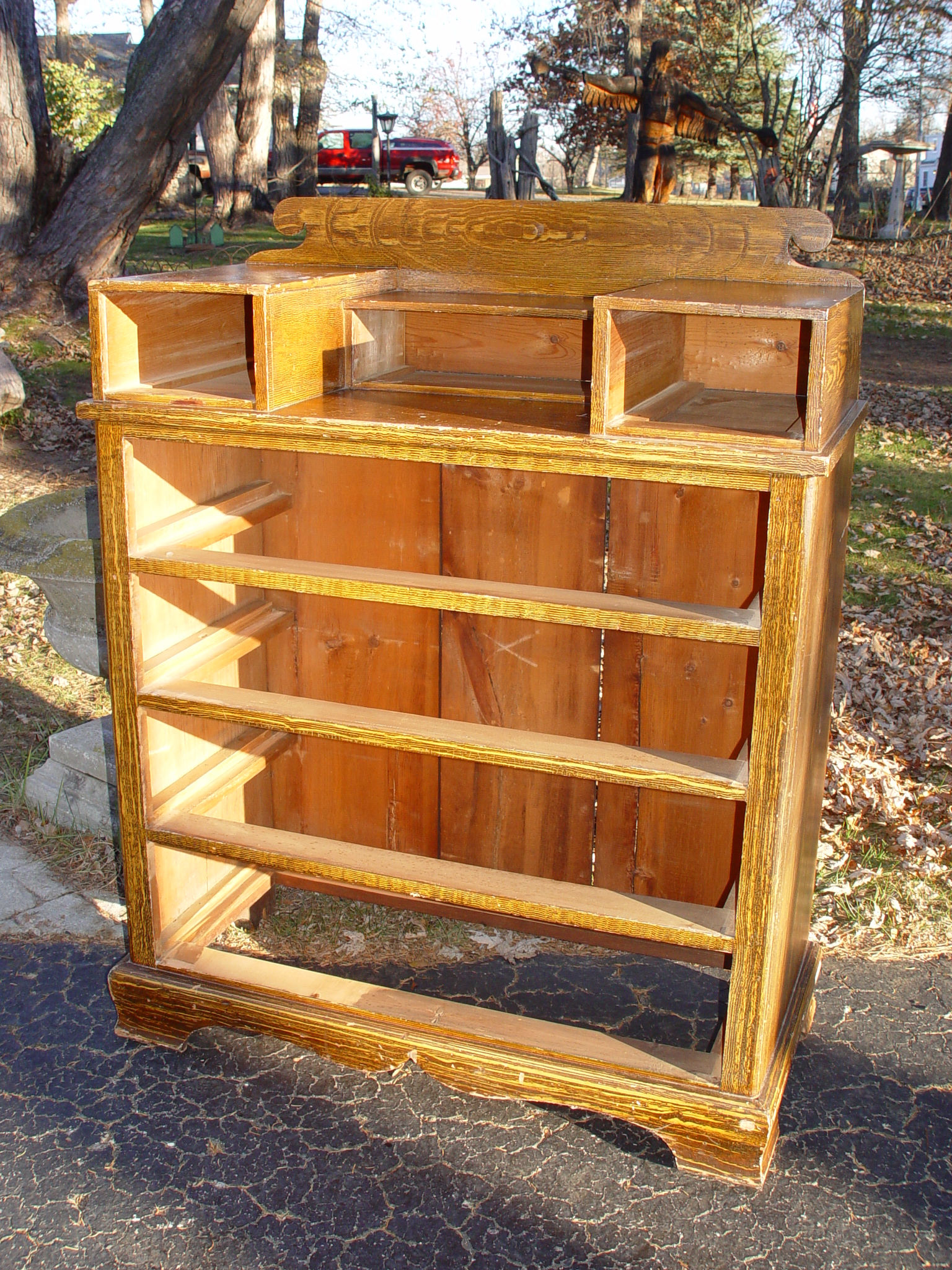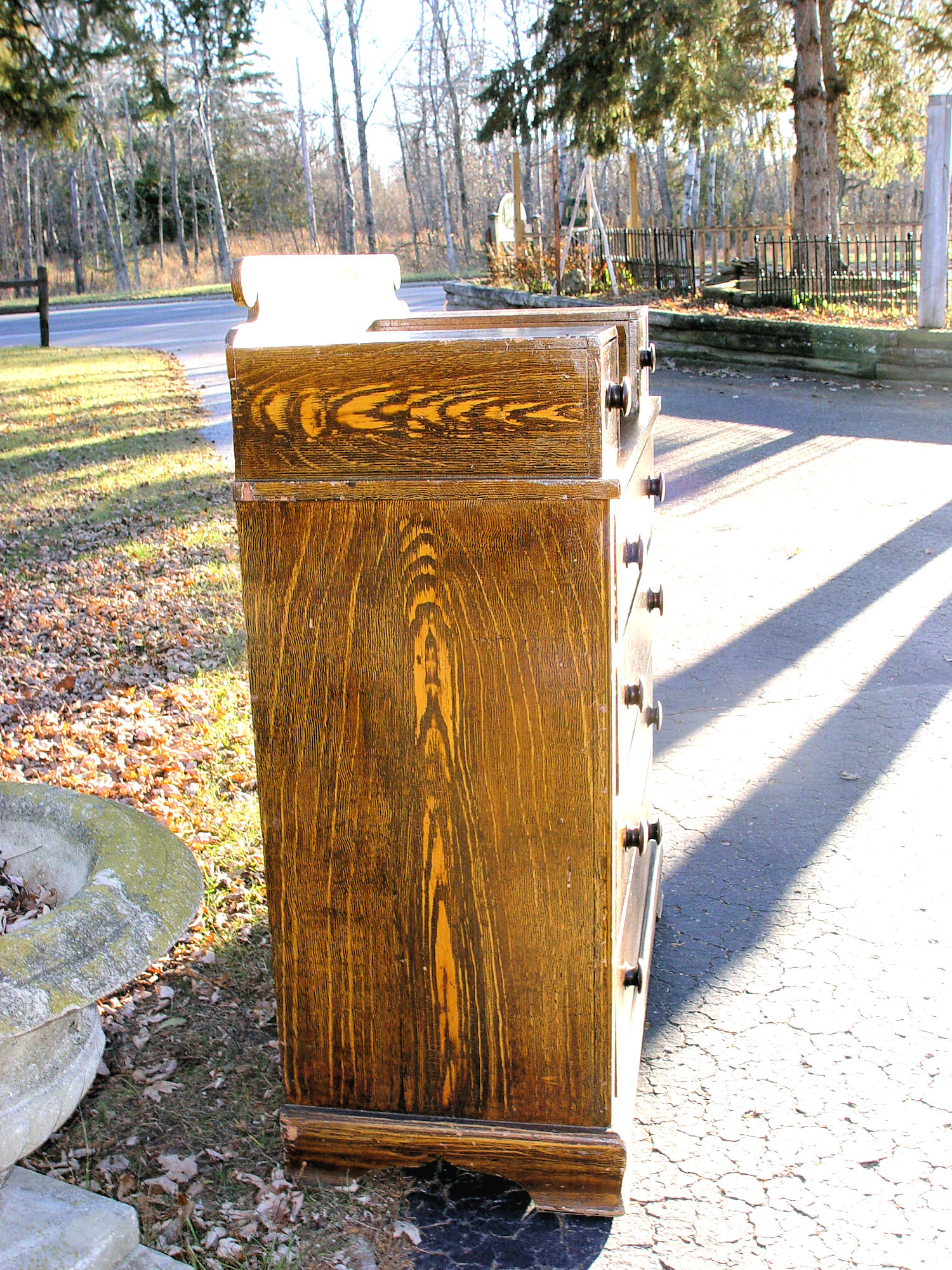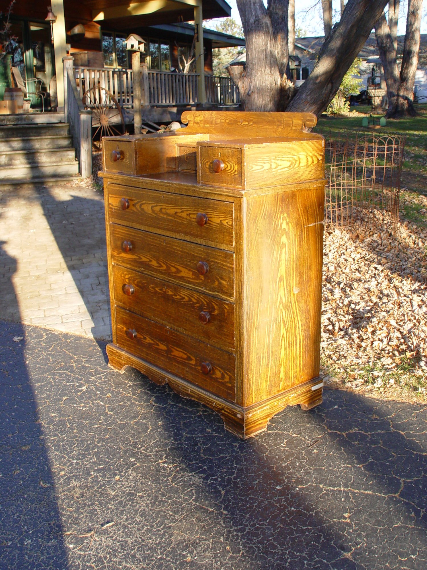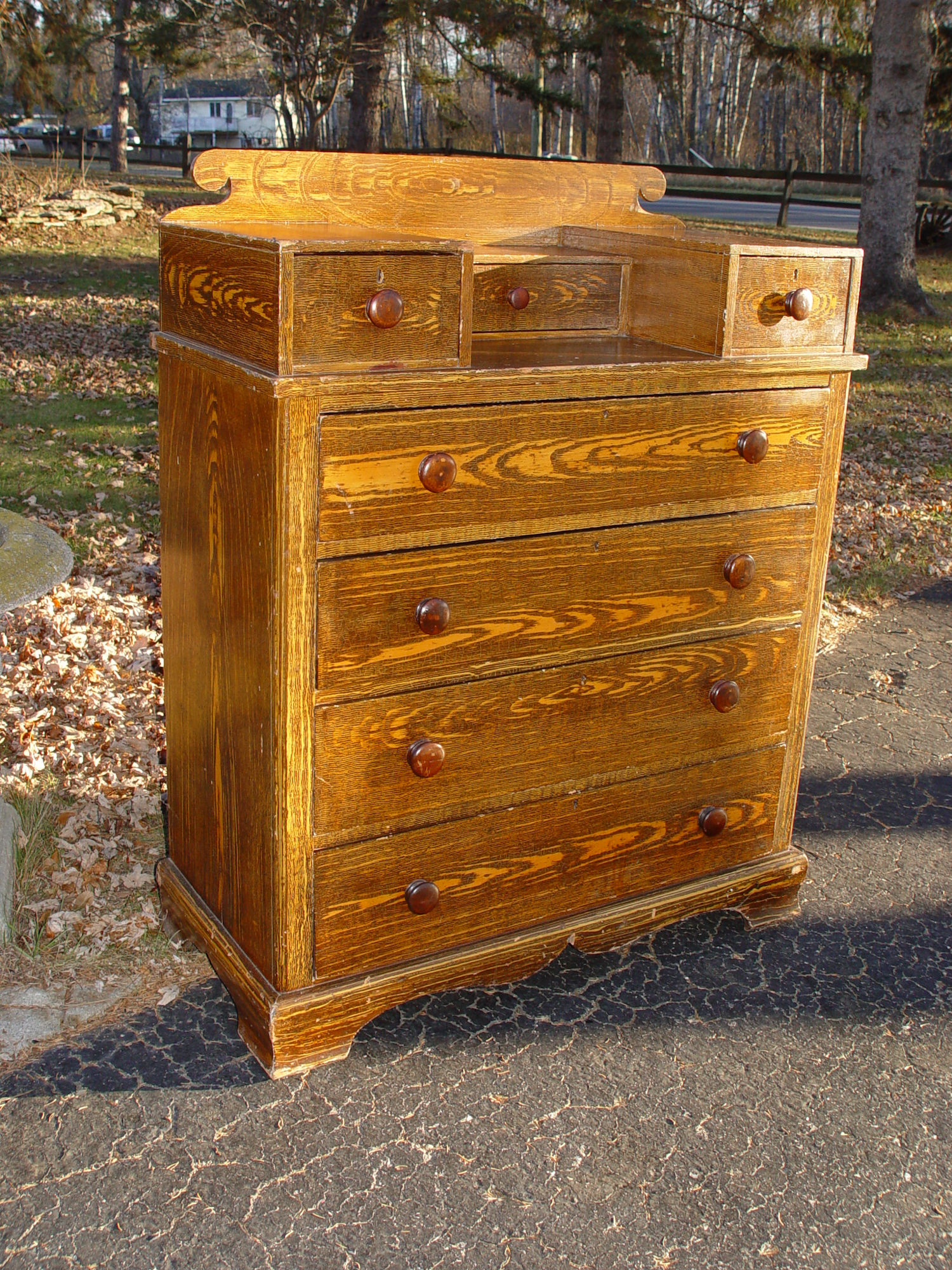 Originally found in Connecticut, this attractive American pine, 1860s antique chest of drawers is in it's original grain paint and hardware. This step back dresser includes three smaller drawers over four larger drawers.