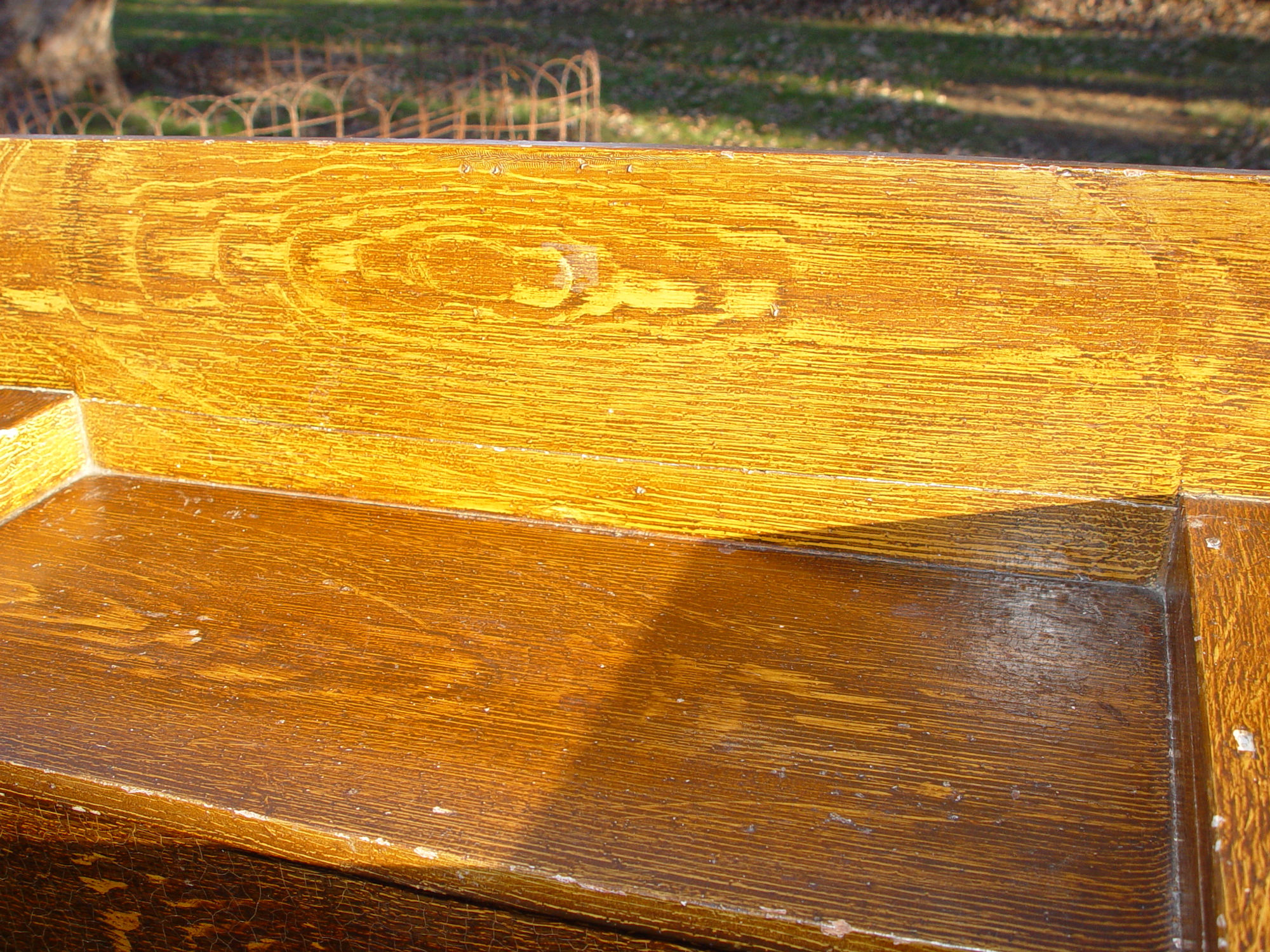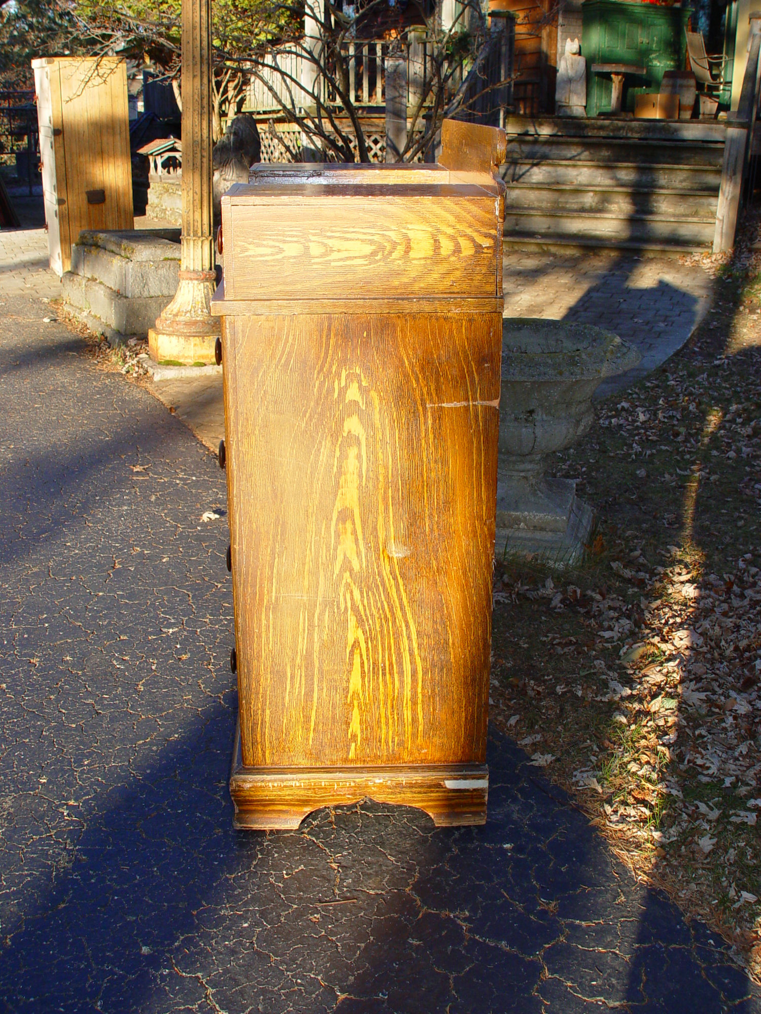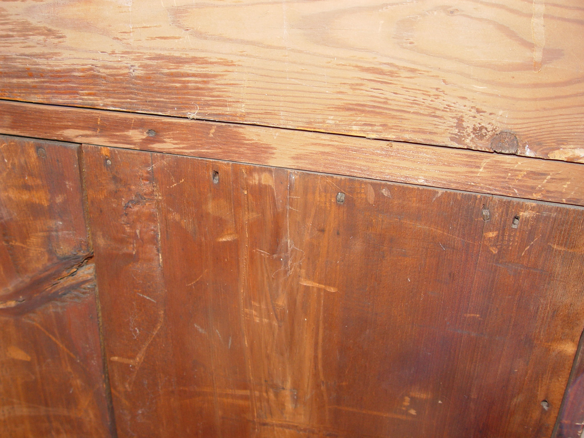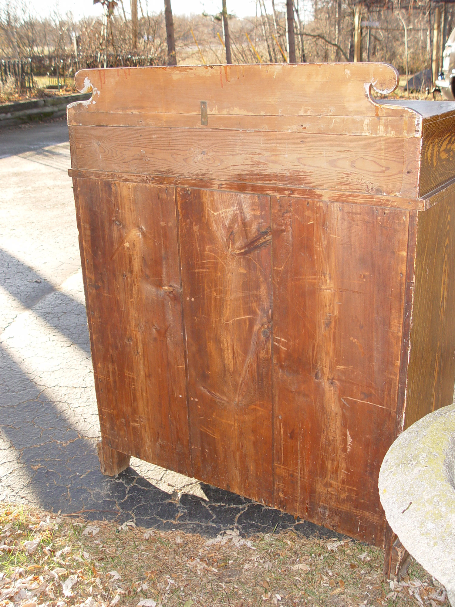 Bracketed ogee base. Drawers are dovetailed construction. This has an old repair as can see in last photo. The taller back portion was bracketed back in place, fine seam can be see from front.