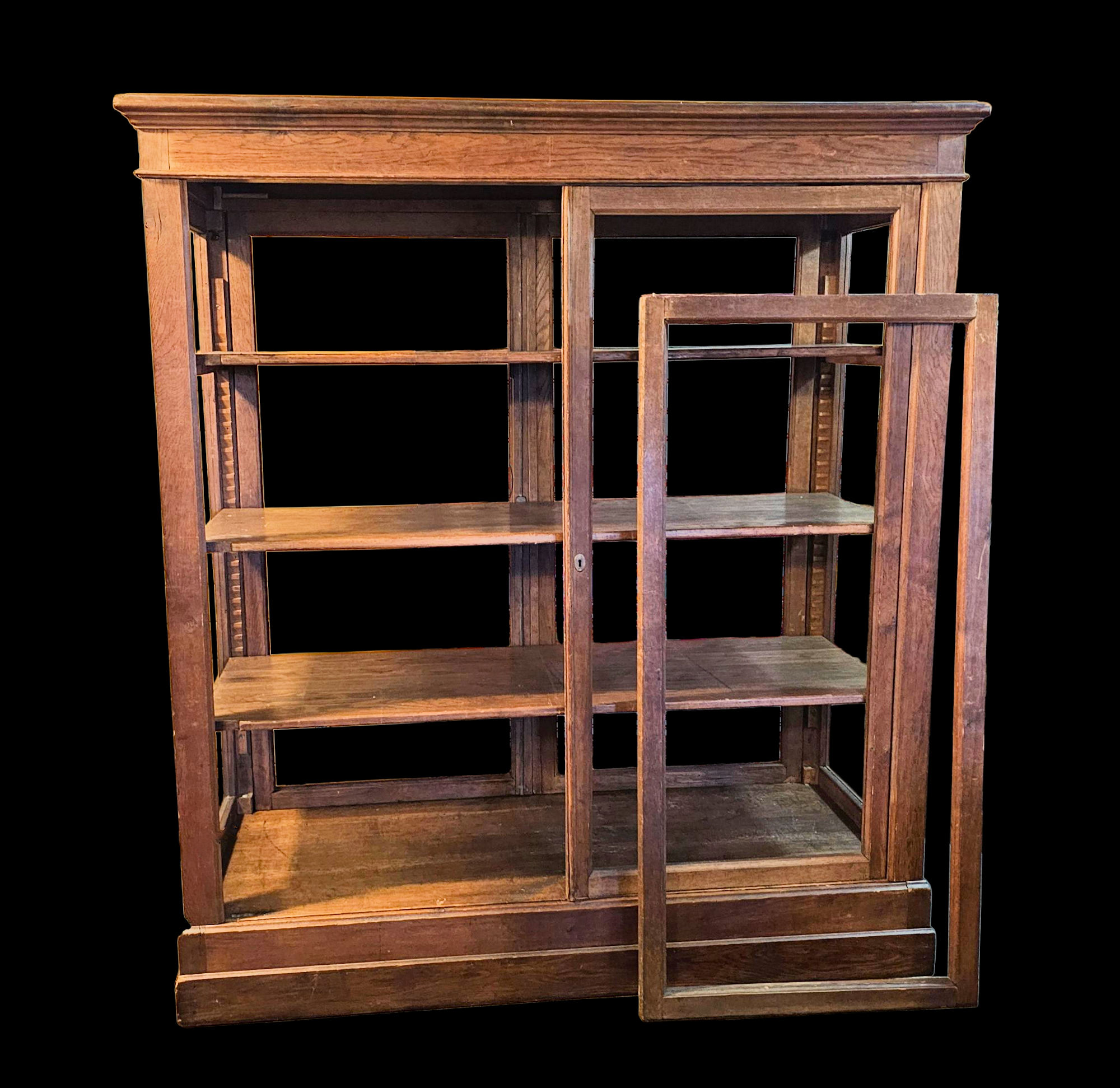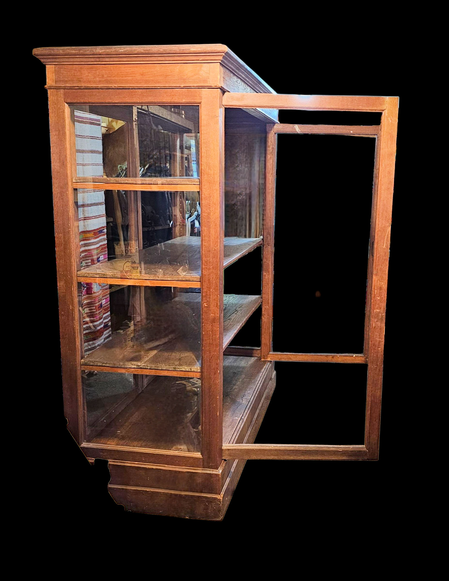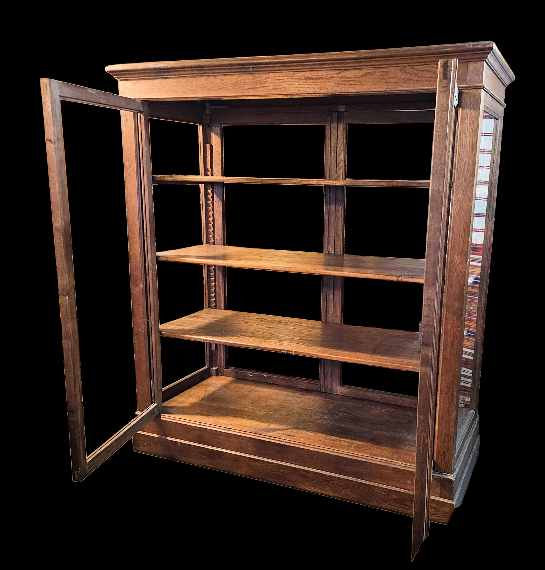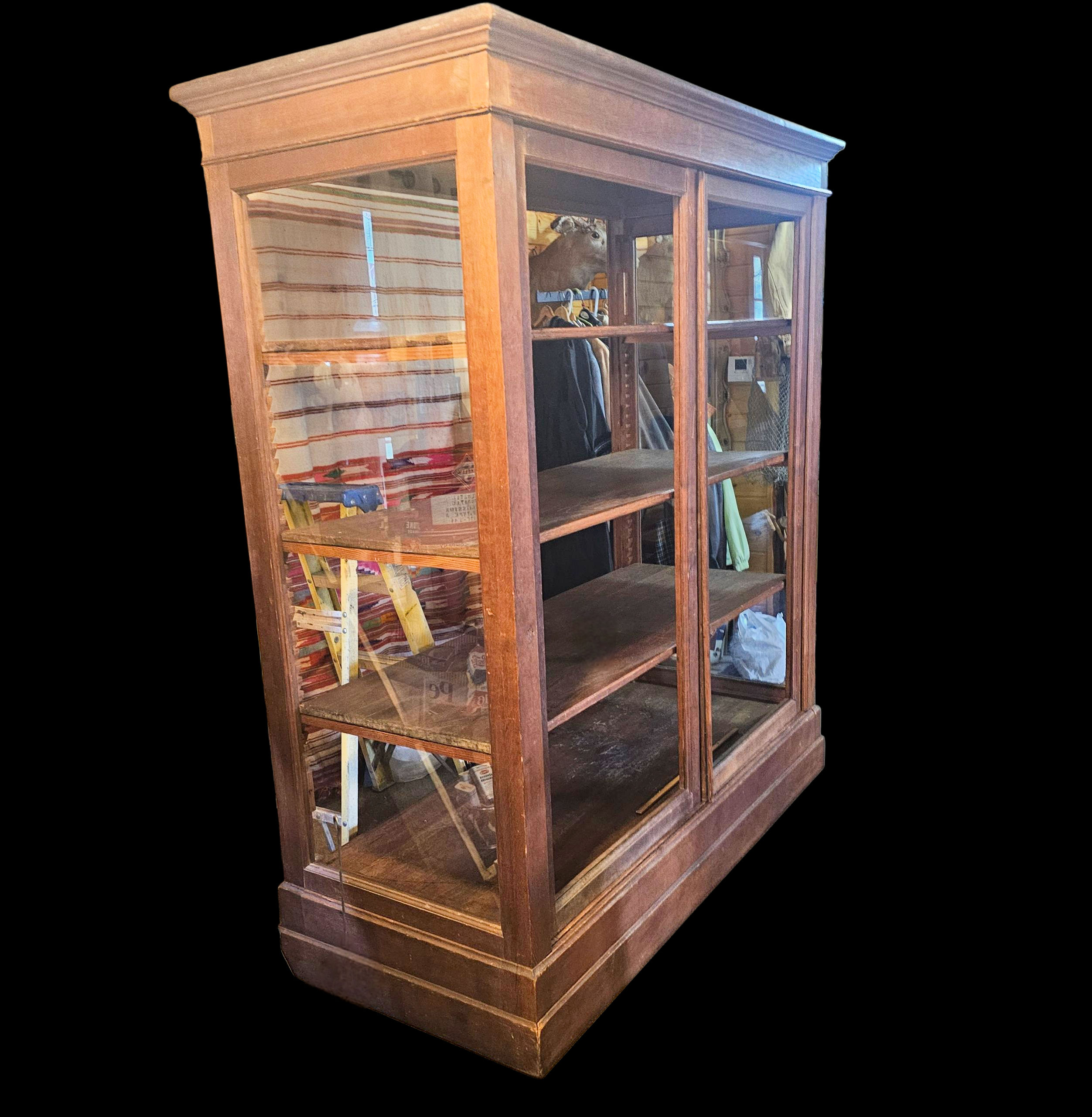 Very desirable aged patina throughout This is a strikingly cabinet, one of a kind, with ample space for collectors of large items or small. Fabrics, clothing and textiles, pottery, etc.