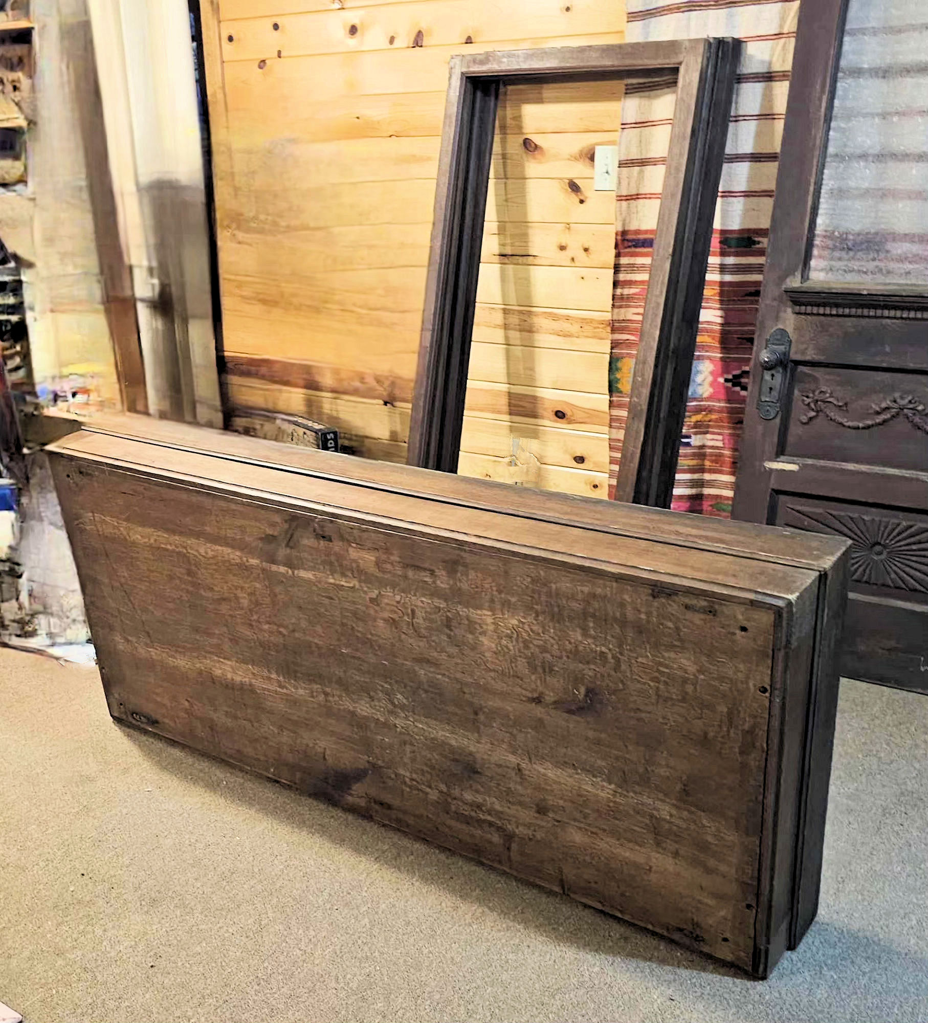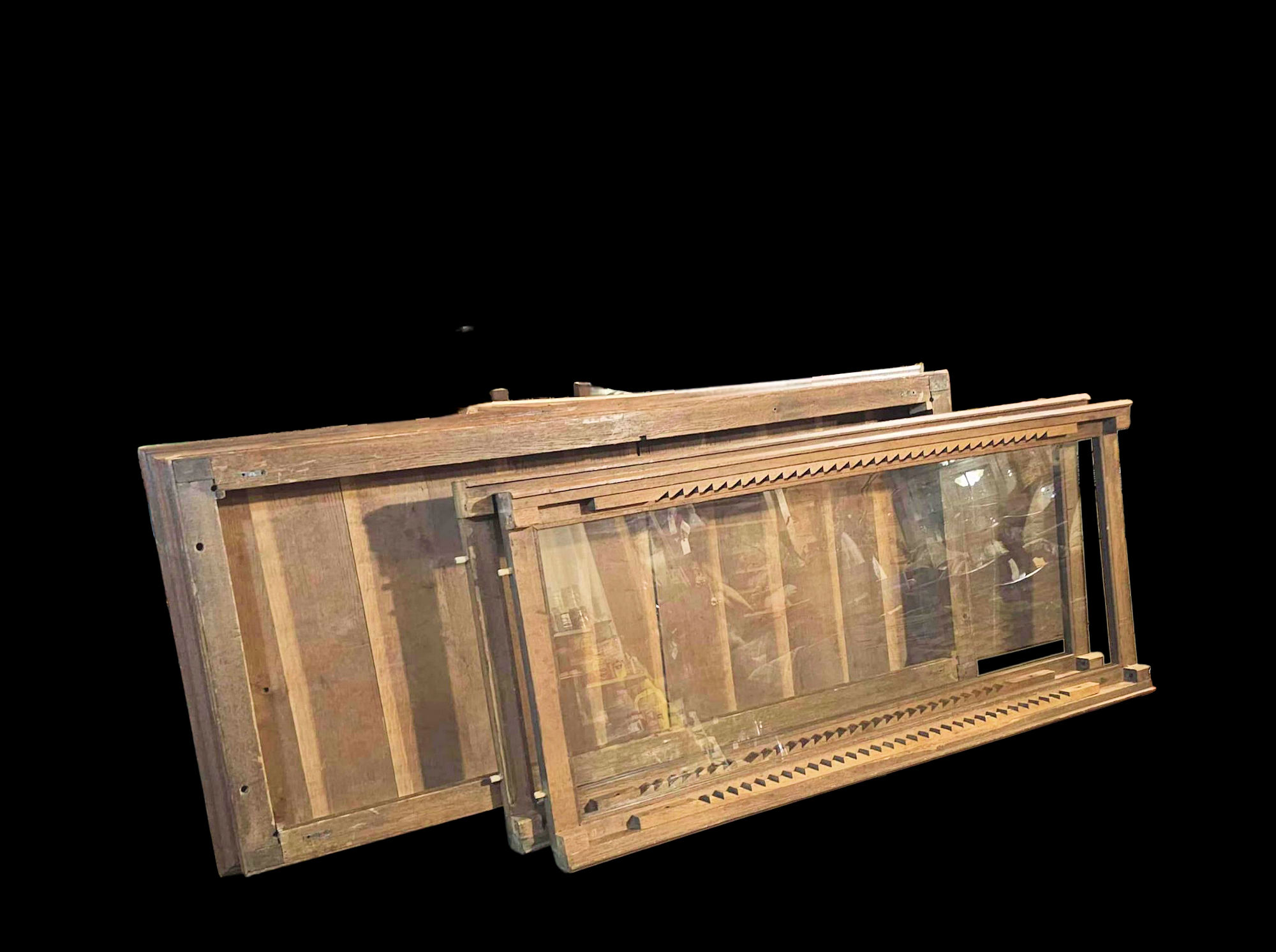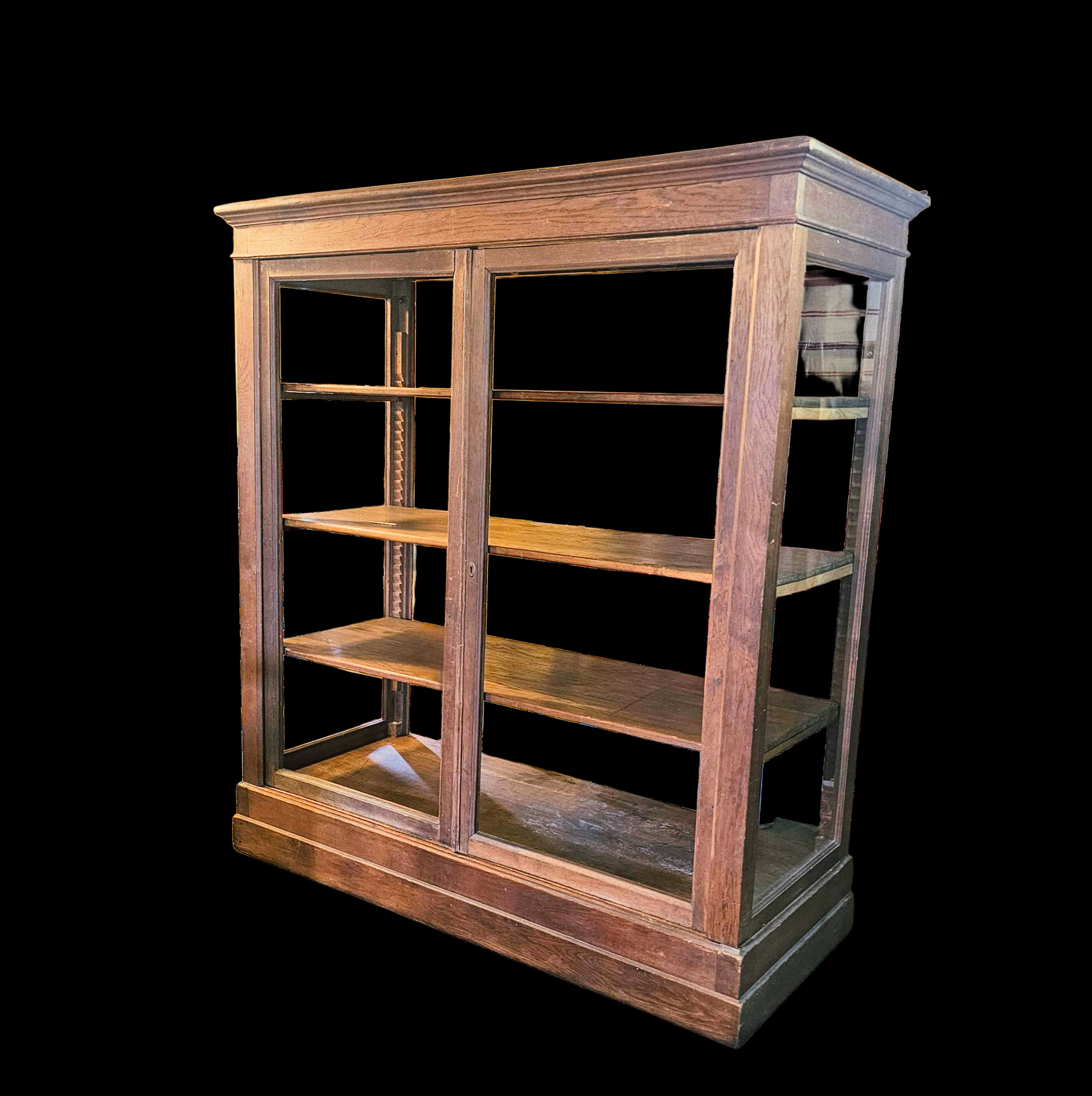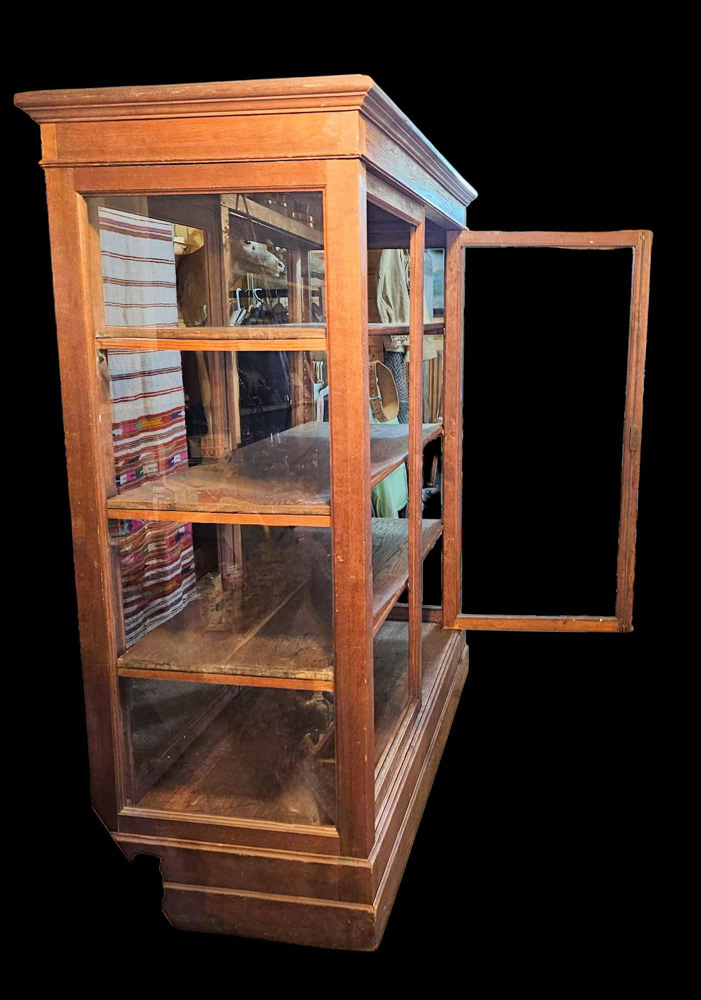 Very desirable aged patina throughout This is a strikingly cabinet, one of a kind, with ample space for collectors of large items or small. Fabrics, clothing and textiles, pottery, etc.