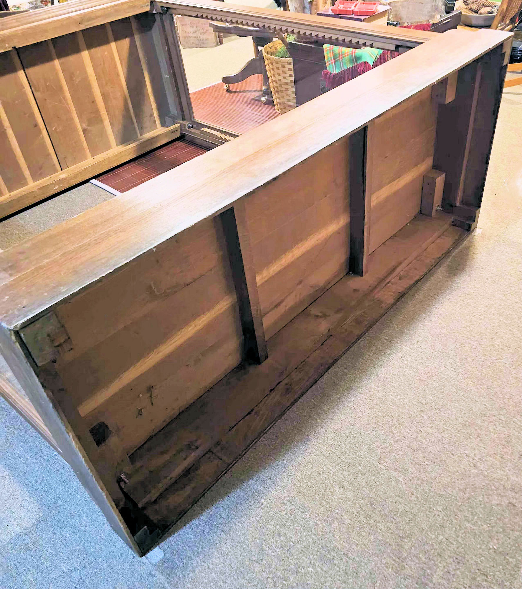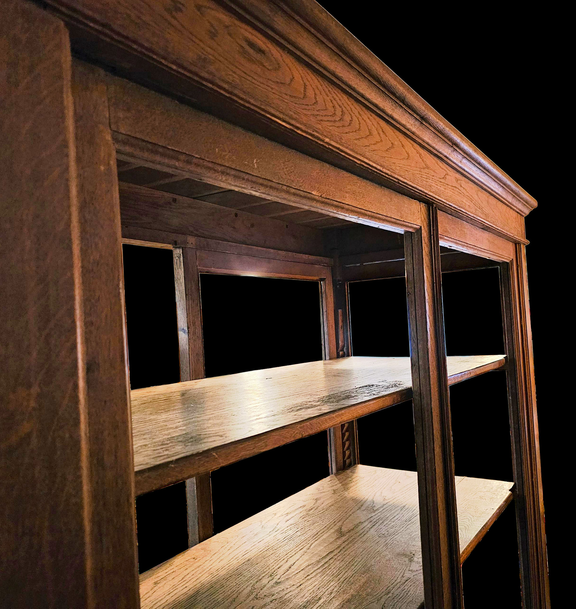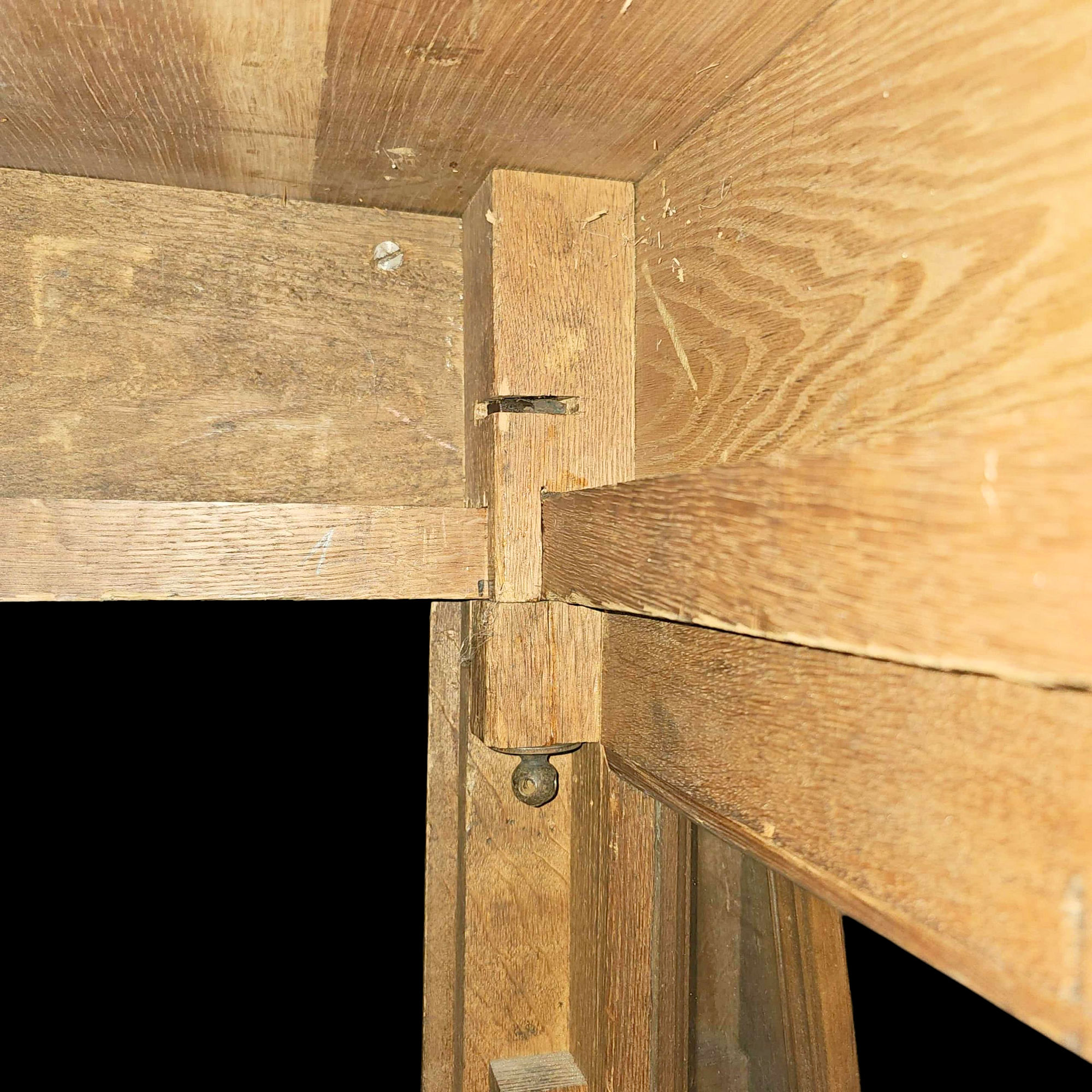 The cabinet is made in eleven pieces. It breaks down into manageable portions due to the weight and size. Great idea by the manufacturer but we cannot find a mark yet to let us know who the maker was. Remarkable construction with large mortise and tenon joints. and top and bottom of cabinet slide onto wooden dowels. Heavy bolts as can be seen in the photos hold the walls in place. Bottom bolts were missing at some point and carriage bolts were added. The doors do not operate on a typical hinge system, they open and close by utilizing a recessed metal bracket with a hole, top and bottom. Each door has a bracket with a pin that falls into place. All boards are hand planed. Very solid joints and construction
