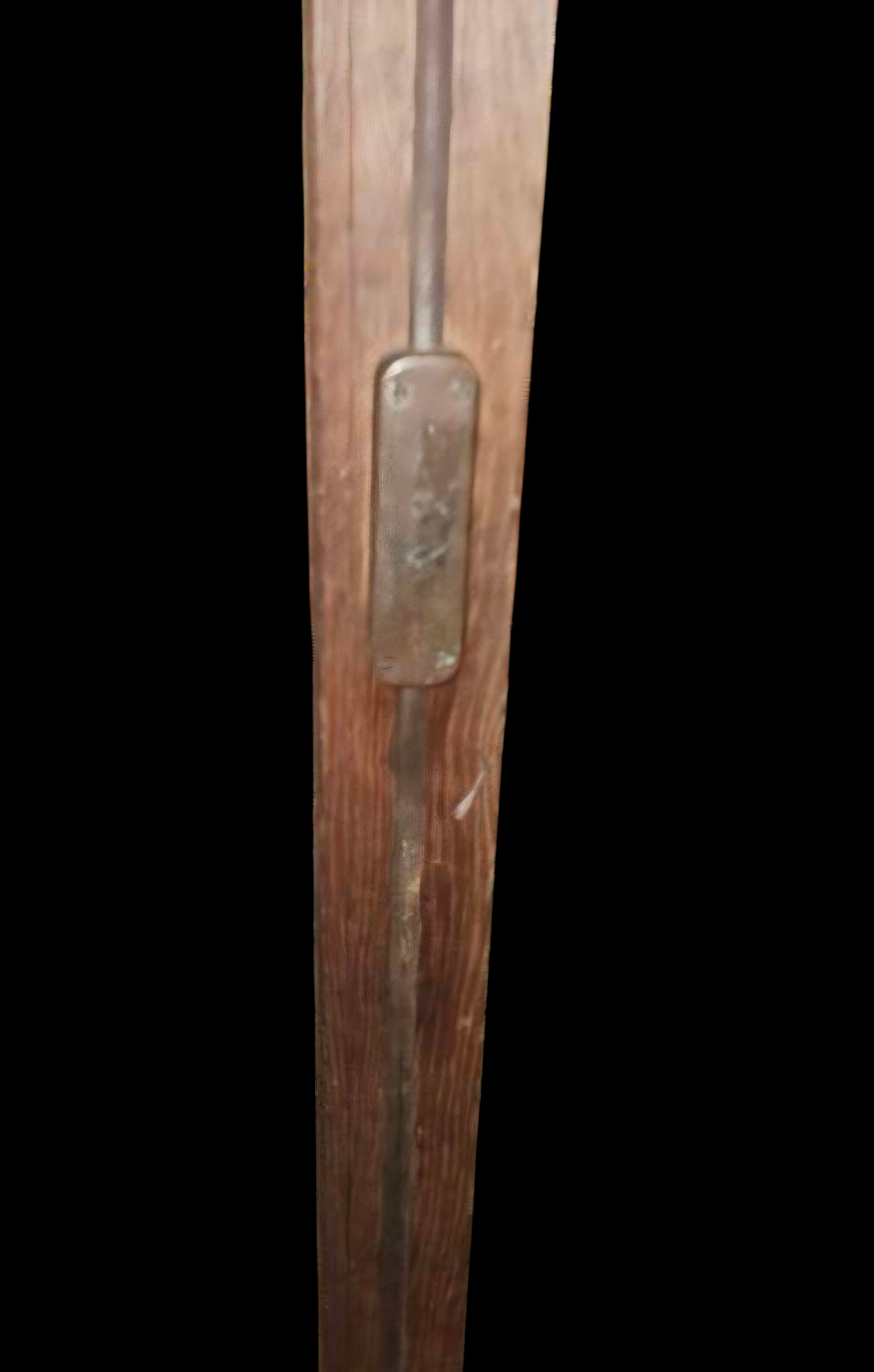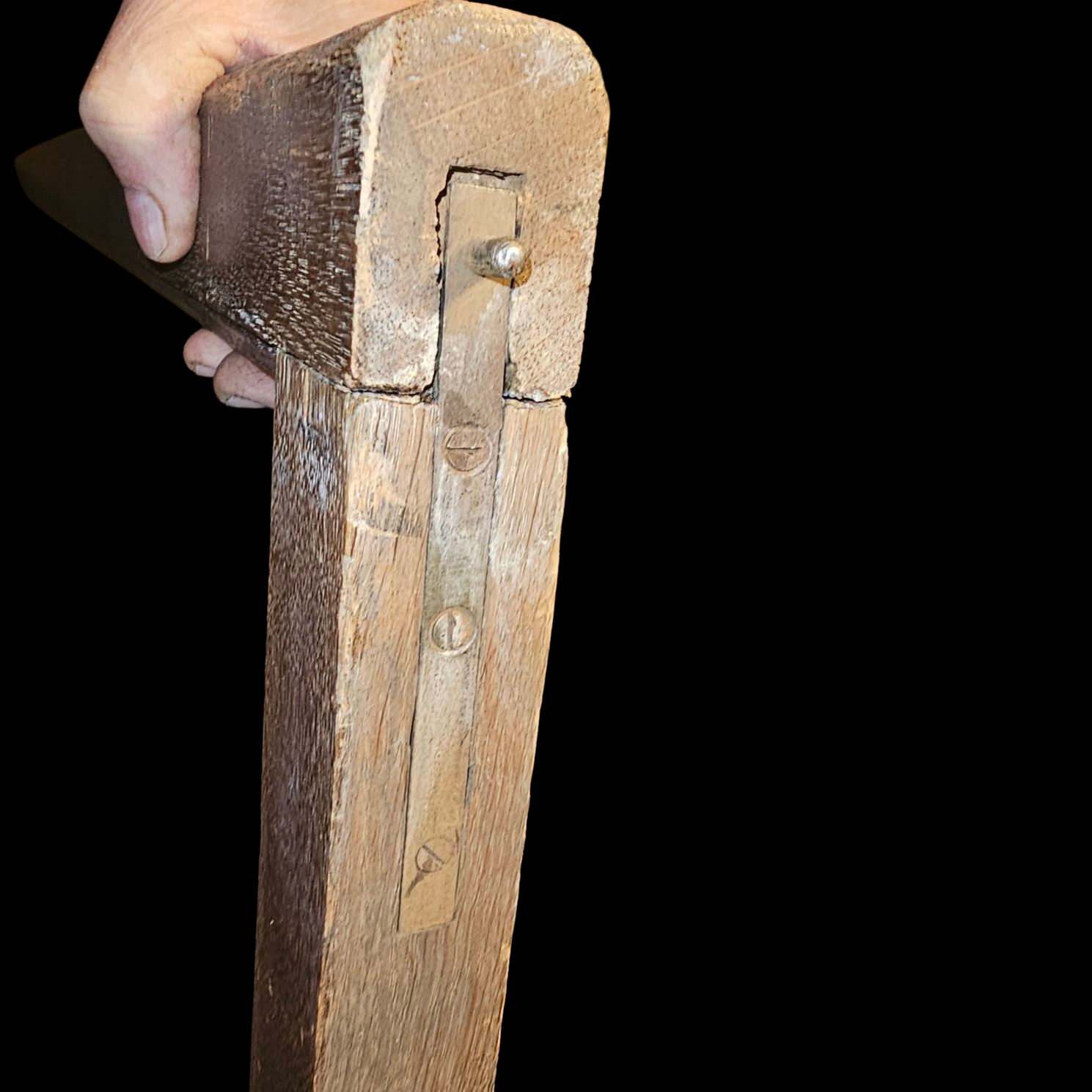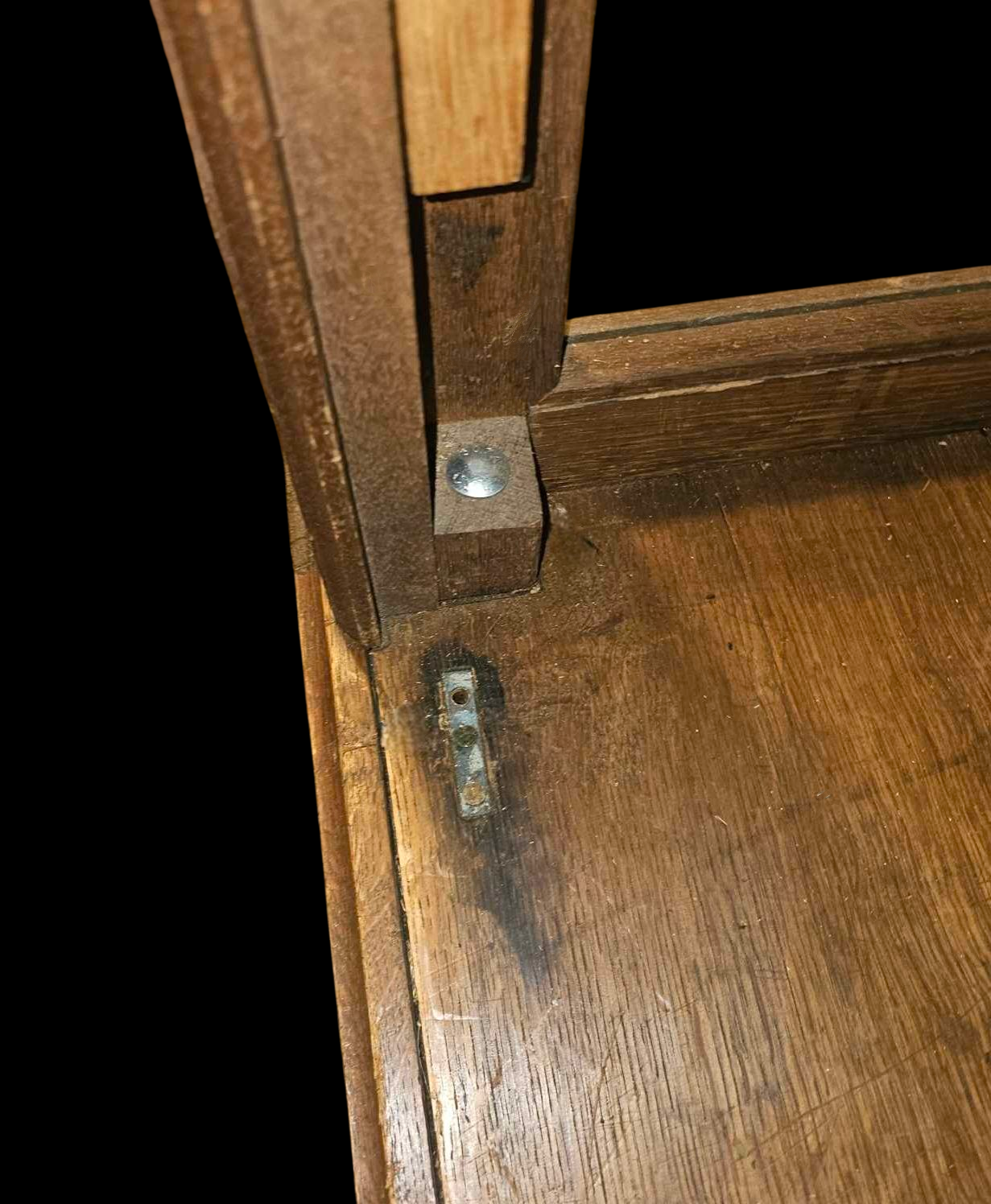 The cabinet is made in eleven pieces. It breaks down into manageable portions due to the weight and size. Great idea by the manufacturer but we cannot find a mark yet to let us know who the maker was. Remarkable construction with large mortise and tenon joints. and top and bottom of cabinet slide onto wooden dowels. Heavy bolts as can be seen in the photos hold the walls in place. Bottom bolts were missing at some point and carriage bolts were added. The doors do not operate on a typical hinge system, they open and close by utilizing a recessed metal bracket with a hole, top and bottom. Each door has a bracket with a pin that falls into place. All boards are hand planed. Very solid joints and construction